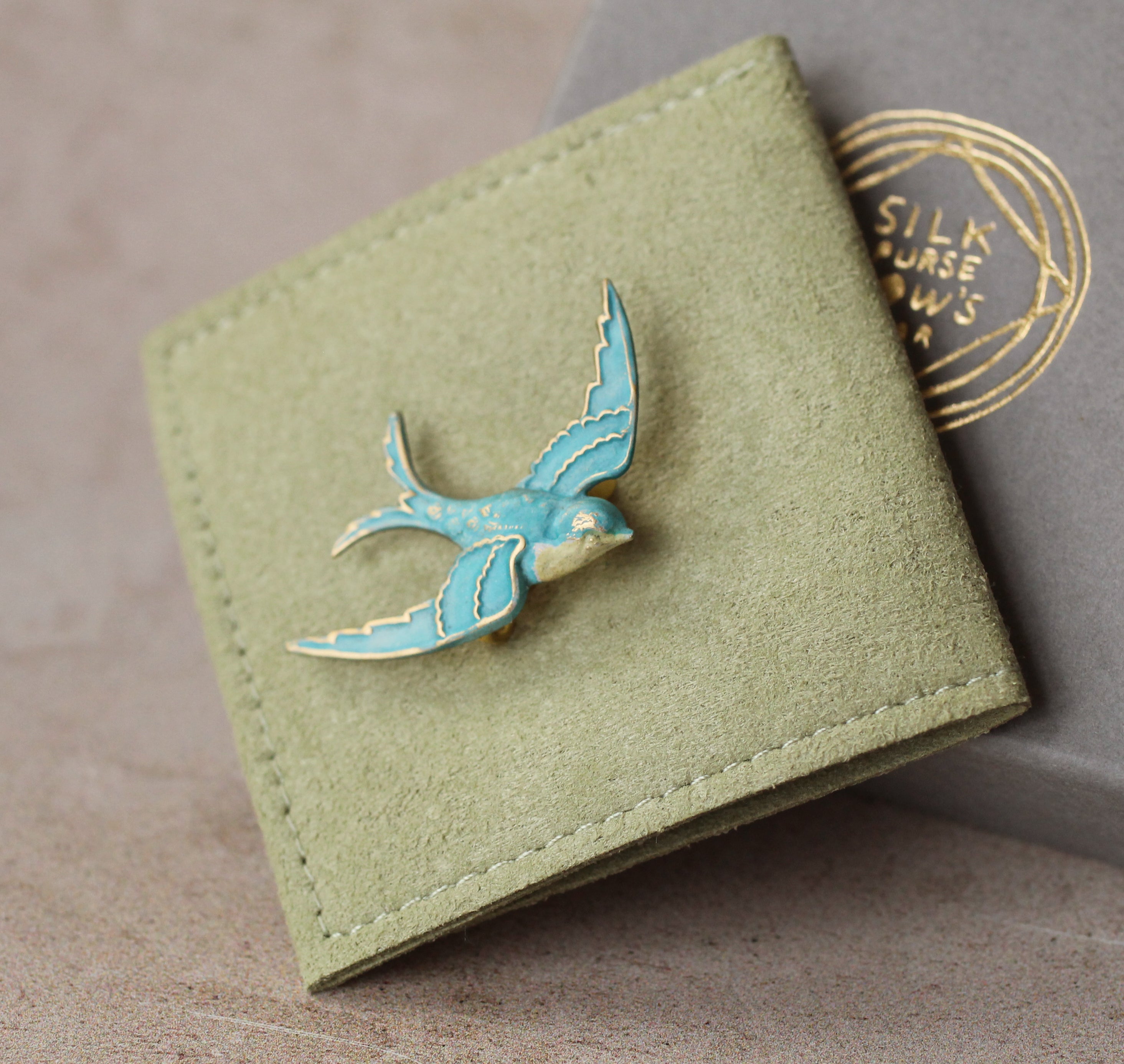 This swallow brooch or pin is a solid brass stamping that has been hand enamelled in our Edinburgh studio in a beautifully bright, cornflower blue colour. Each bird has a tiny touch of sunshine yellow on its breast. Every brooch is hand painted and no two are quite the same!