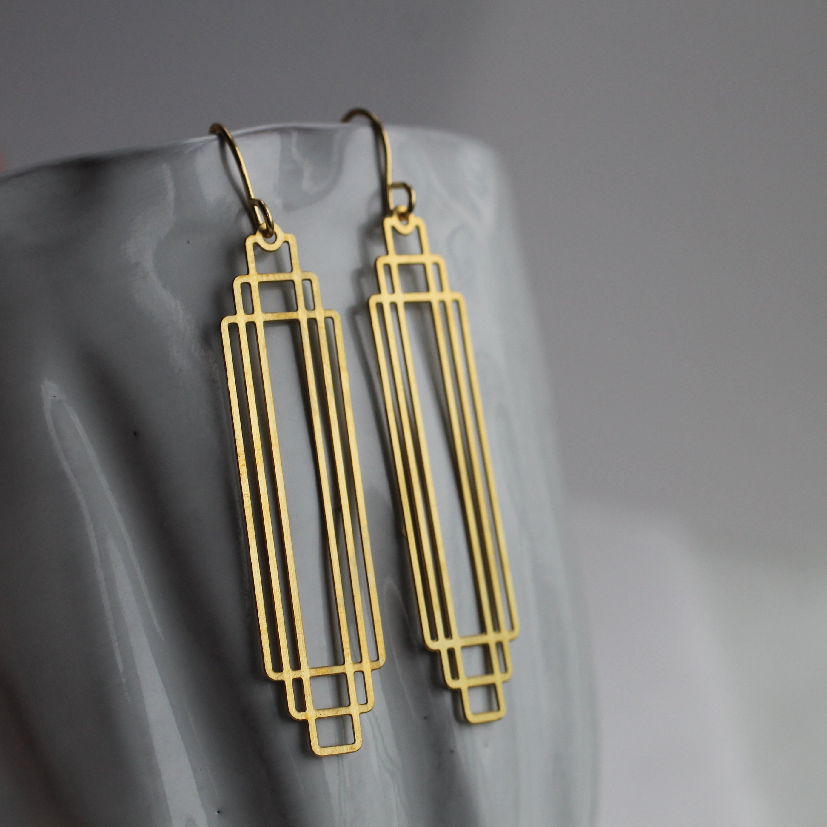 These great earrings are made with solid brass and feature a graduated art deco design. They remind us of classic Deco architecture, like the Chrysler building!