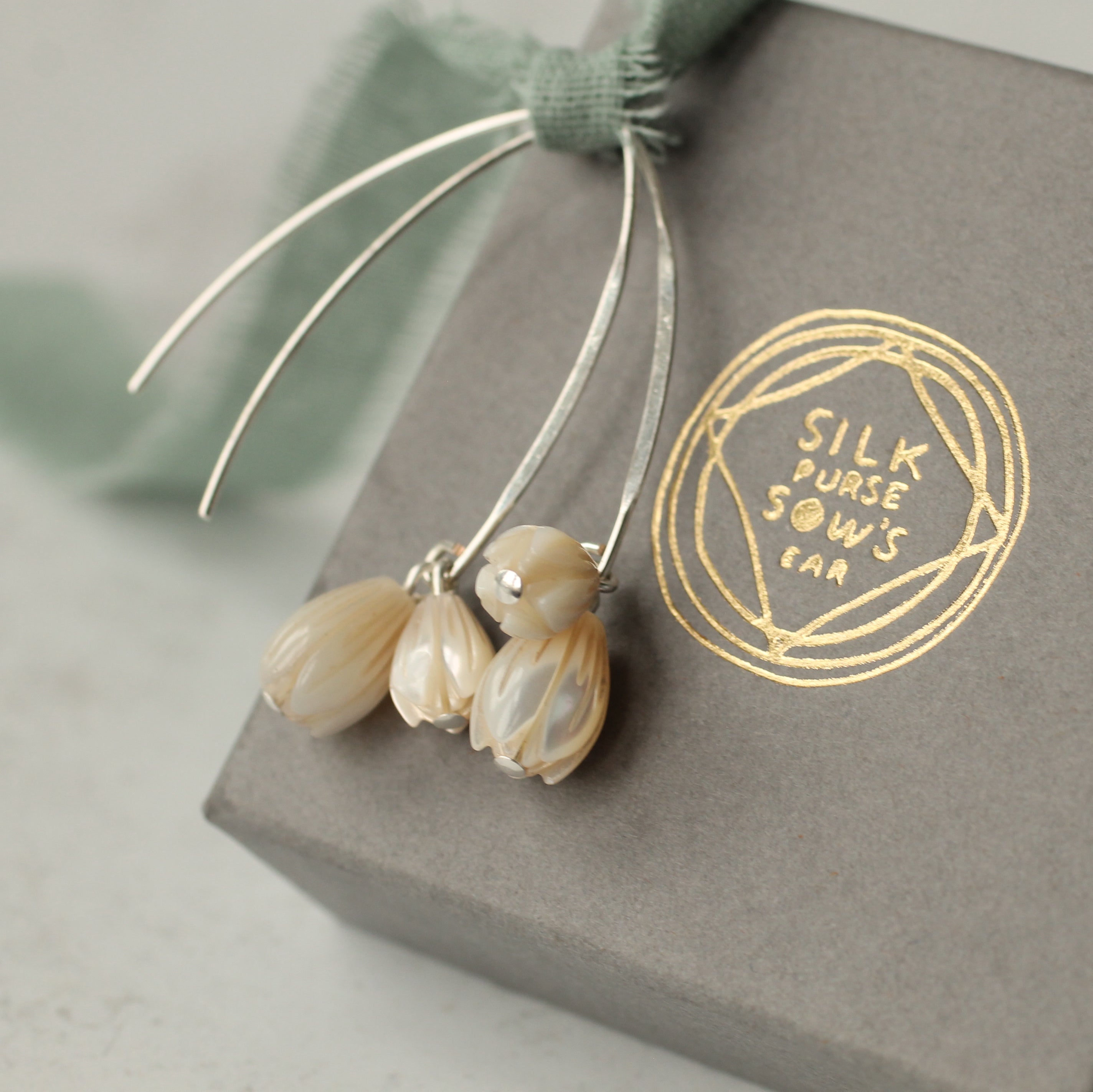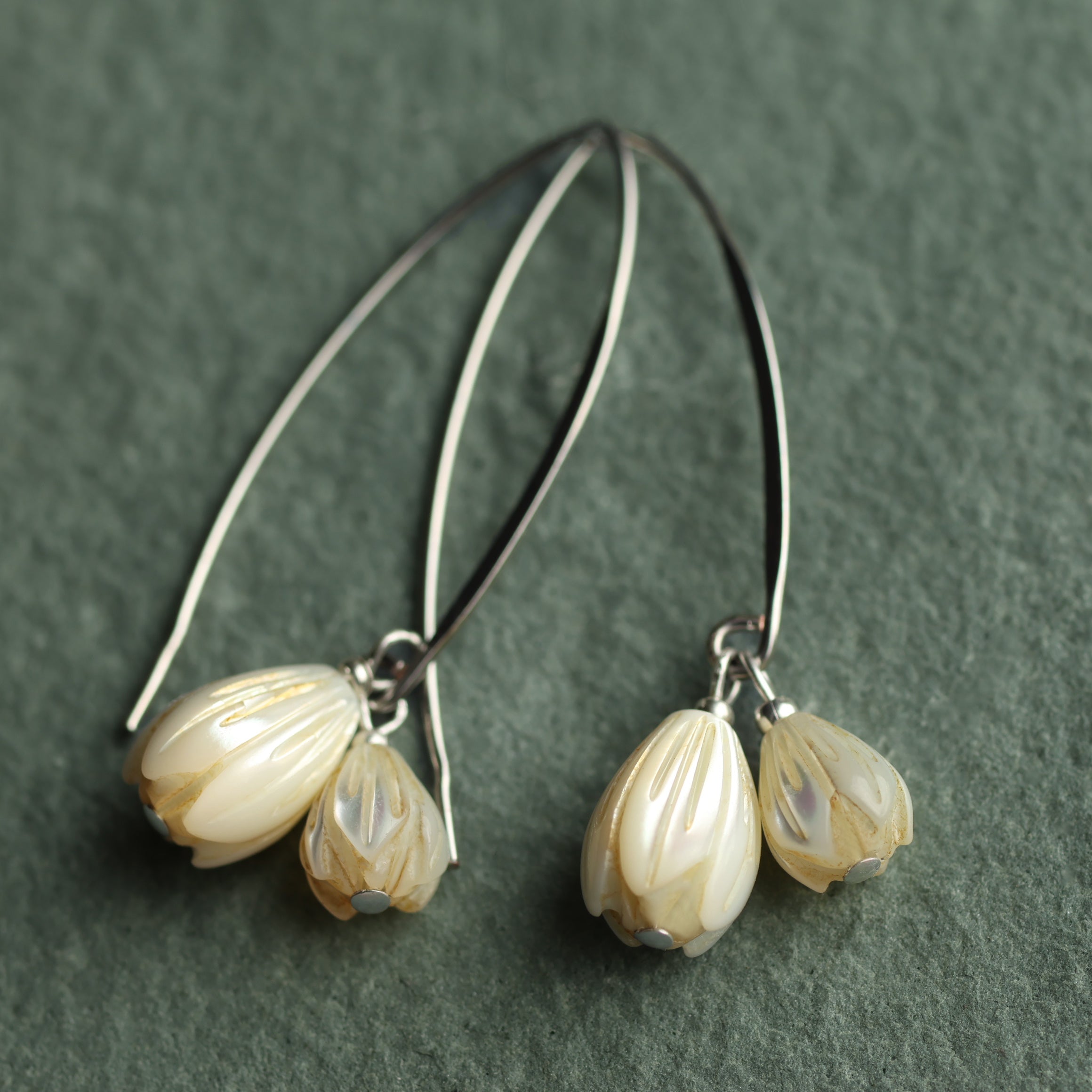These snowdrop earrings are made with carved mother of pearl, cut to catch the light with the most beautiful pearlescent sheen. They are available in a choice of either silver or gold earwires and metalwork.