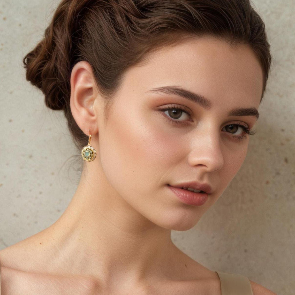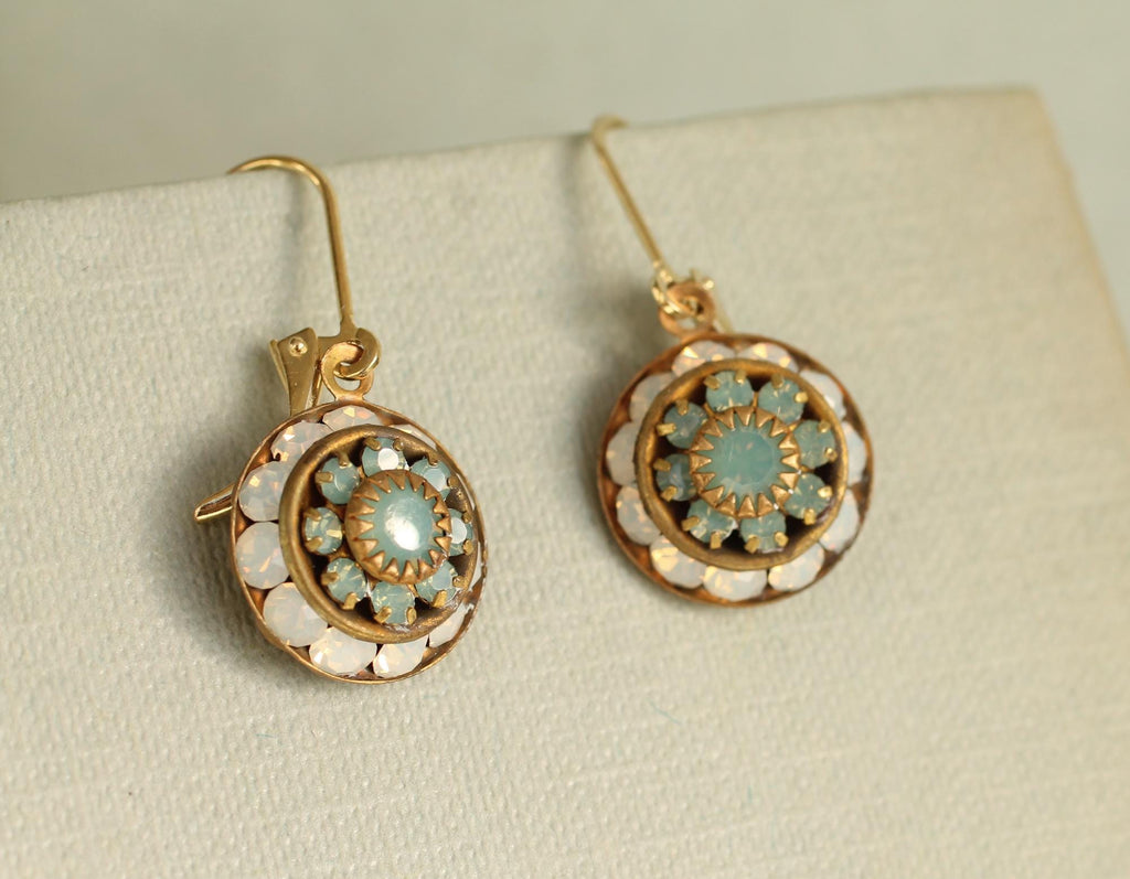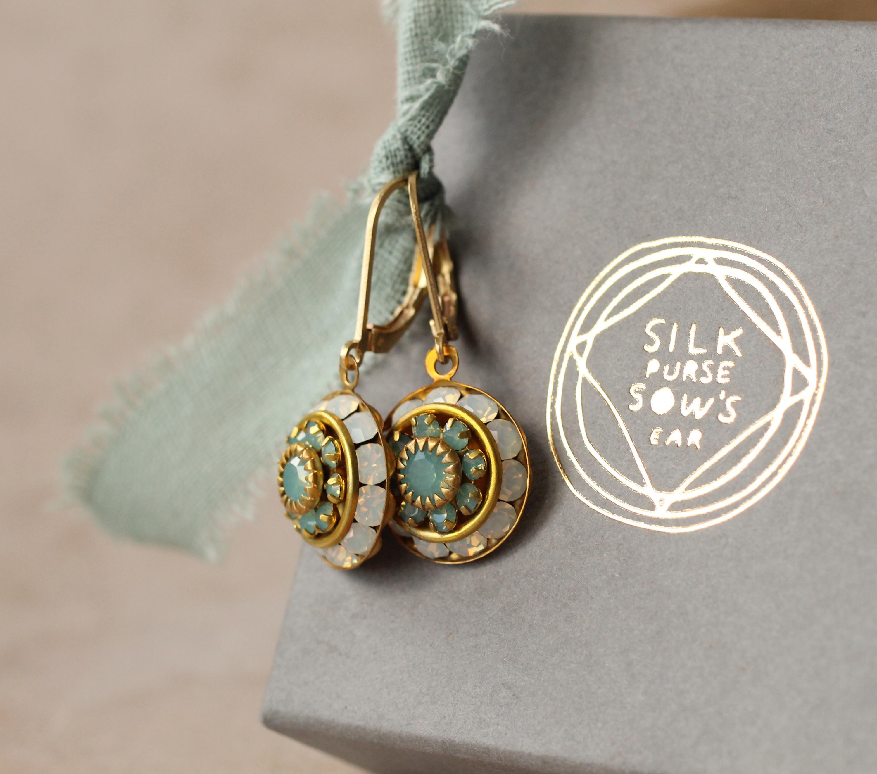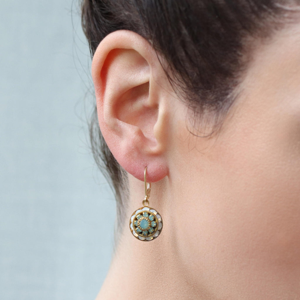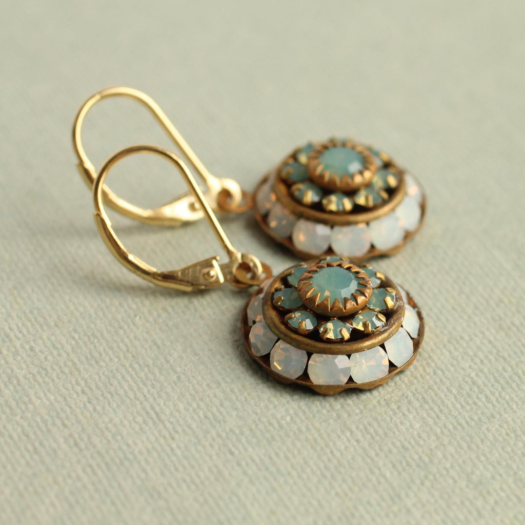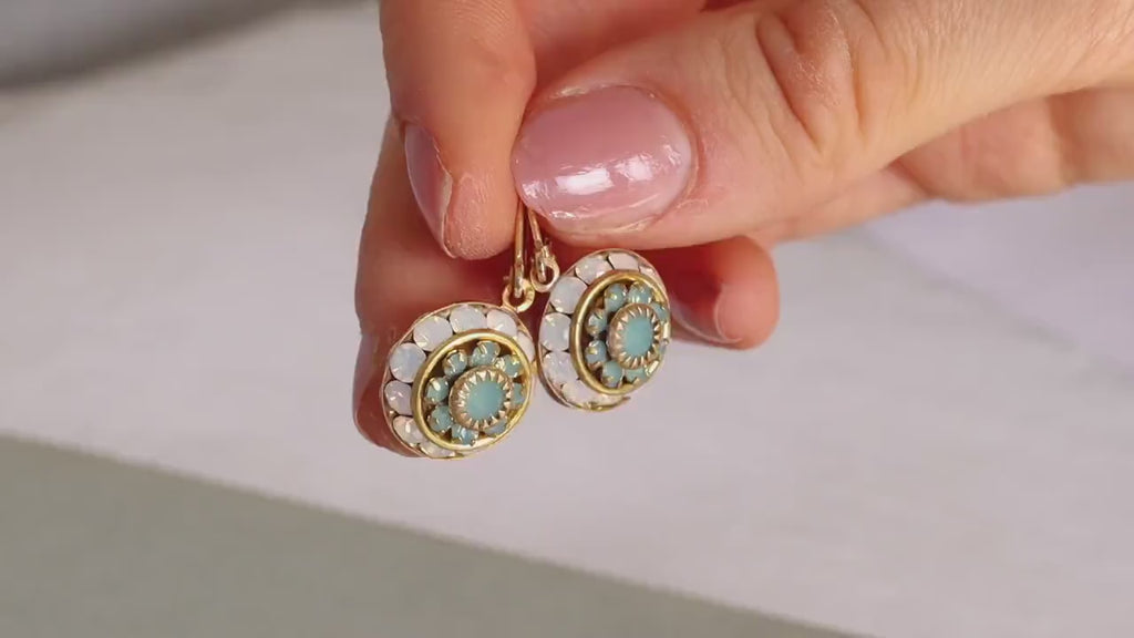 These beautiful jewel earrings are made up of rows of tiny green and white cloudy opal crystal jewels, set carefully into brass to create a stylised circular shape. Each earring is finished with an turquoise opal glass jewel set into the centre. We love the contrast between the deep golden brass and the delicate opal tones.