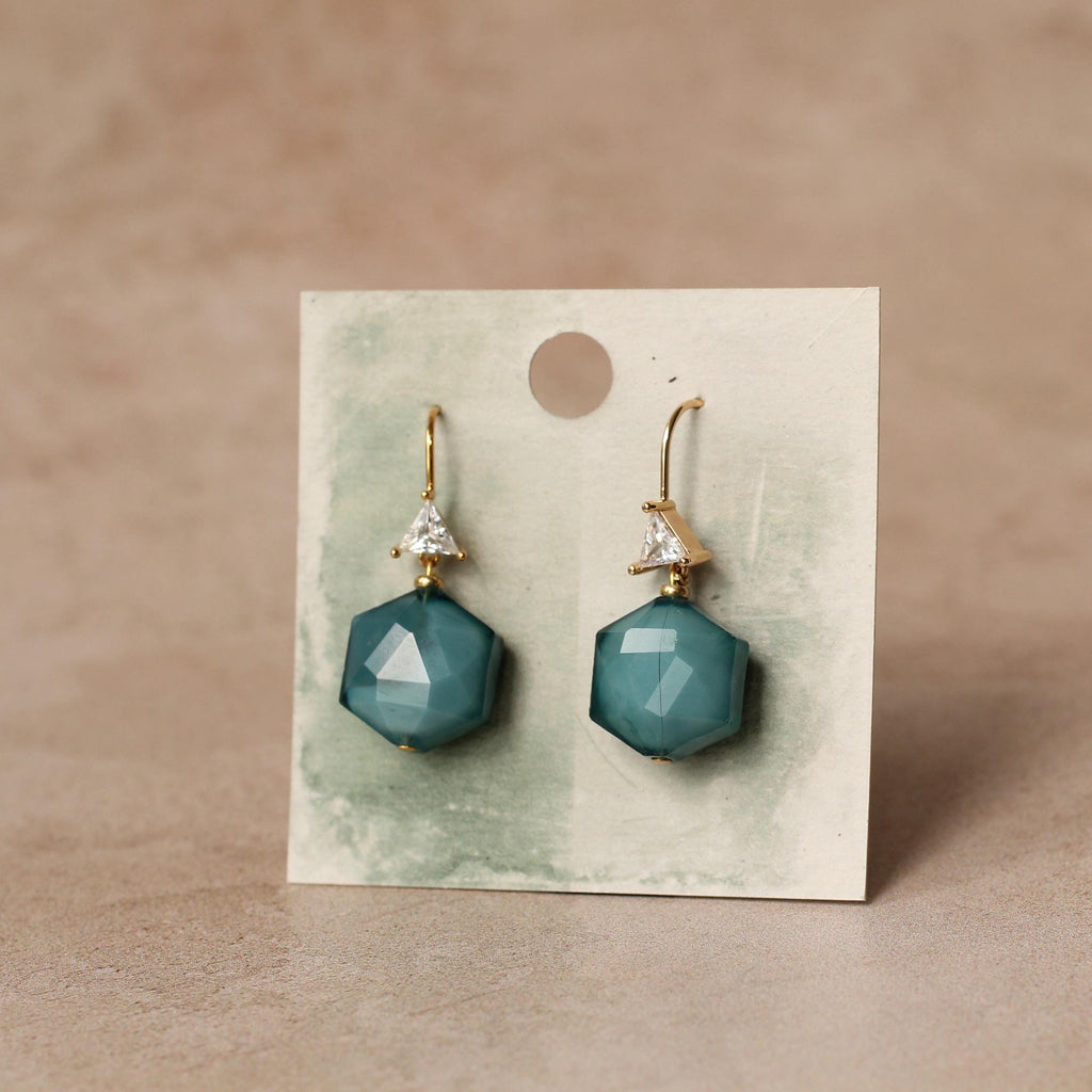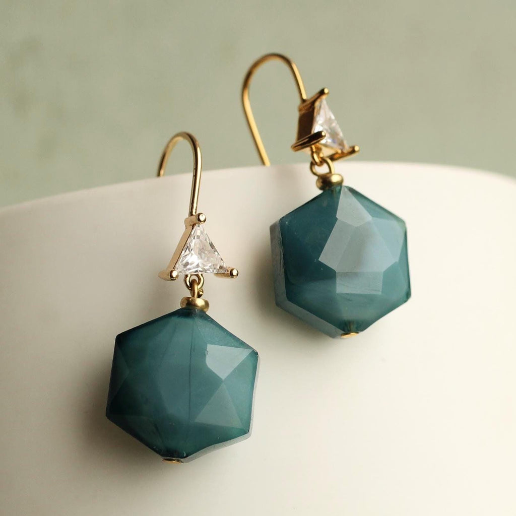 These art deco inspired geometric earrings feature a simple and classic design with a vintage glass hexagon bead in a deep teal or pine green shade. The glass jewels are a bright, vibrant turquoise blue green colour and are faceted and cut to catch the light.