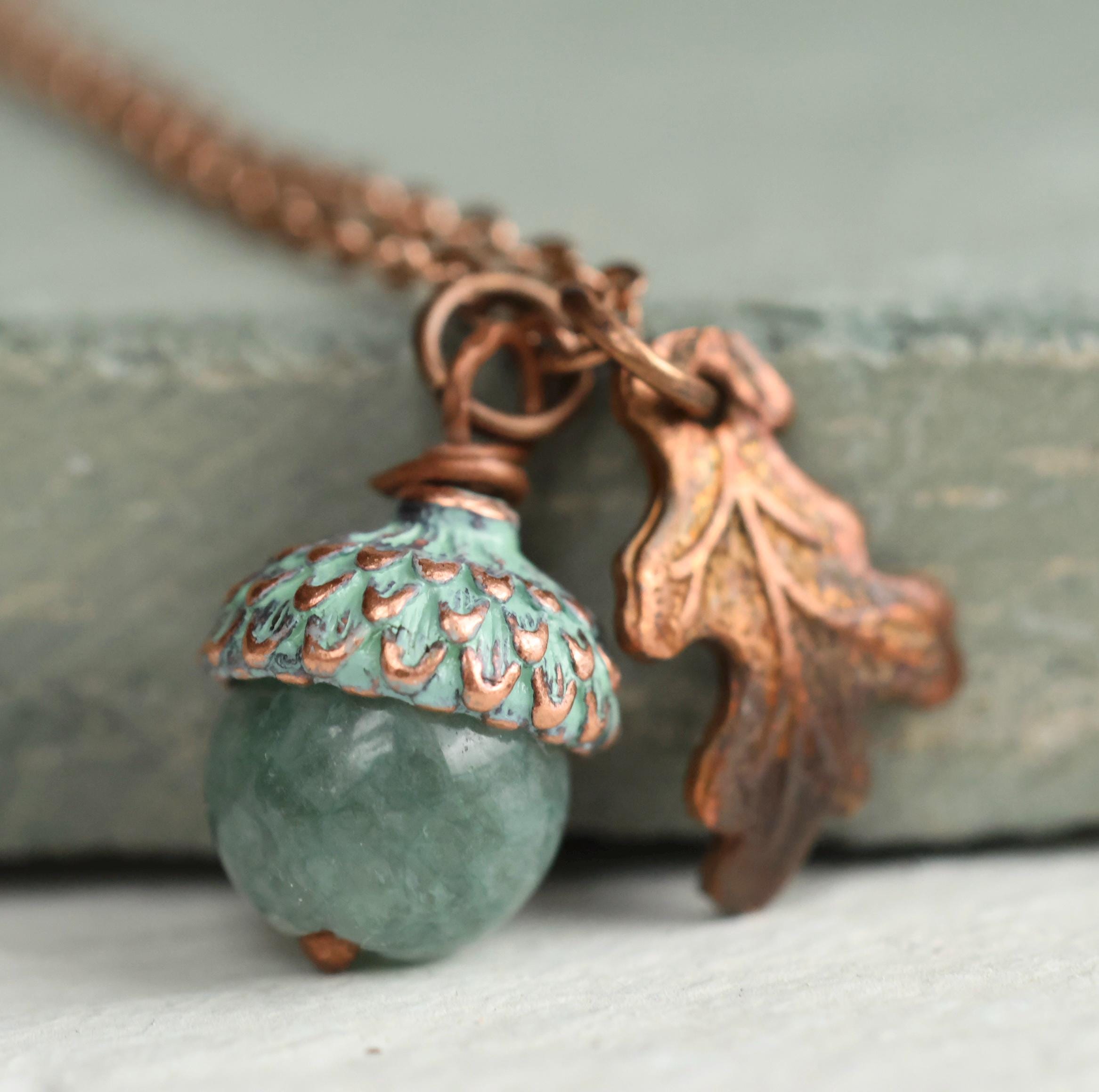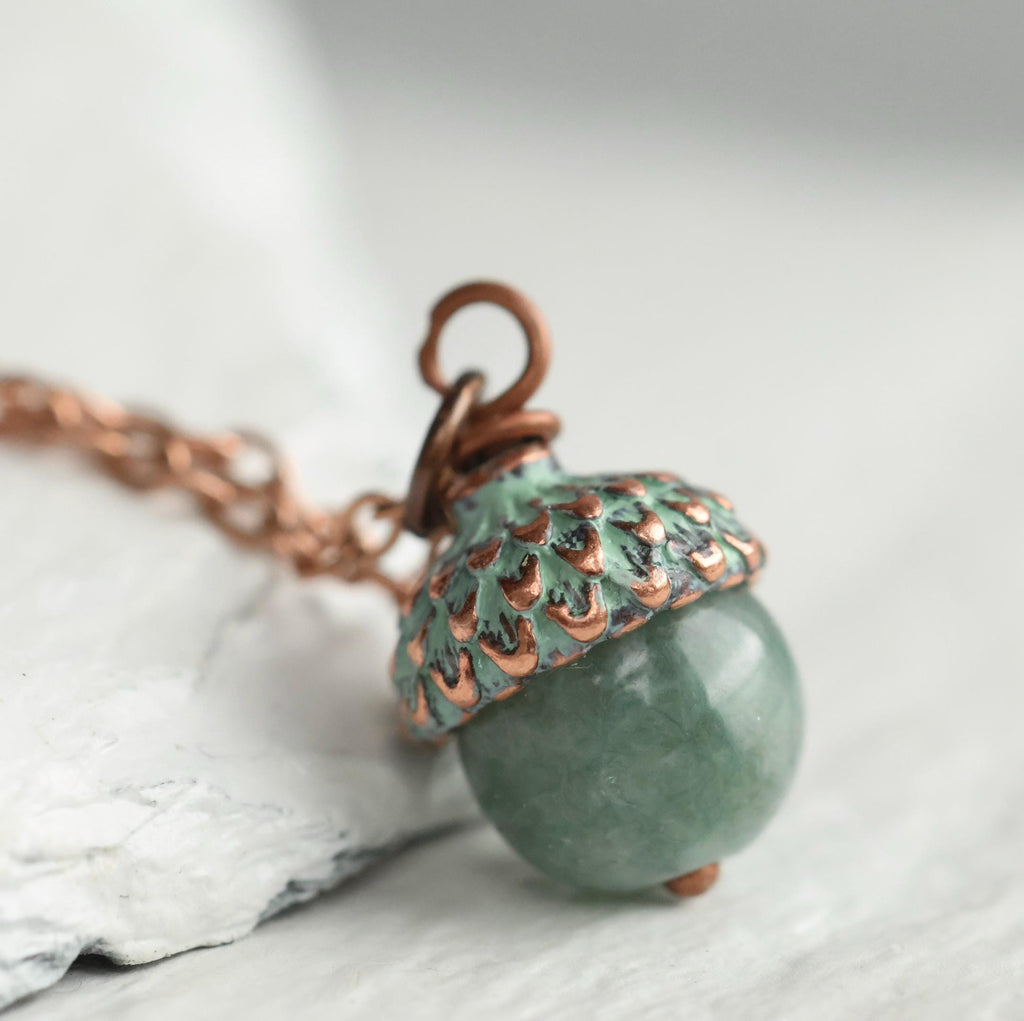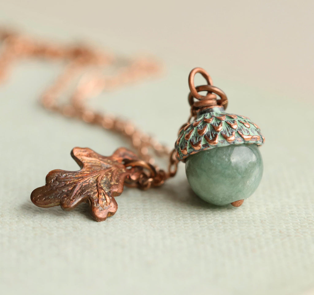 This beautiful acorn necklace is made from a pure jade gemstone, in a cool sage green shade. The gemstone has tiny organic flaws and imperfections that adds to its beauty and uniqueness. We have combined the gemstone with an antique copper acorn cap, with details hand enamelled in the same cool green colour.