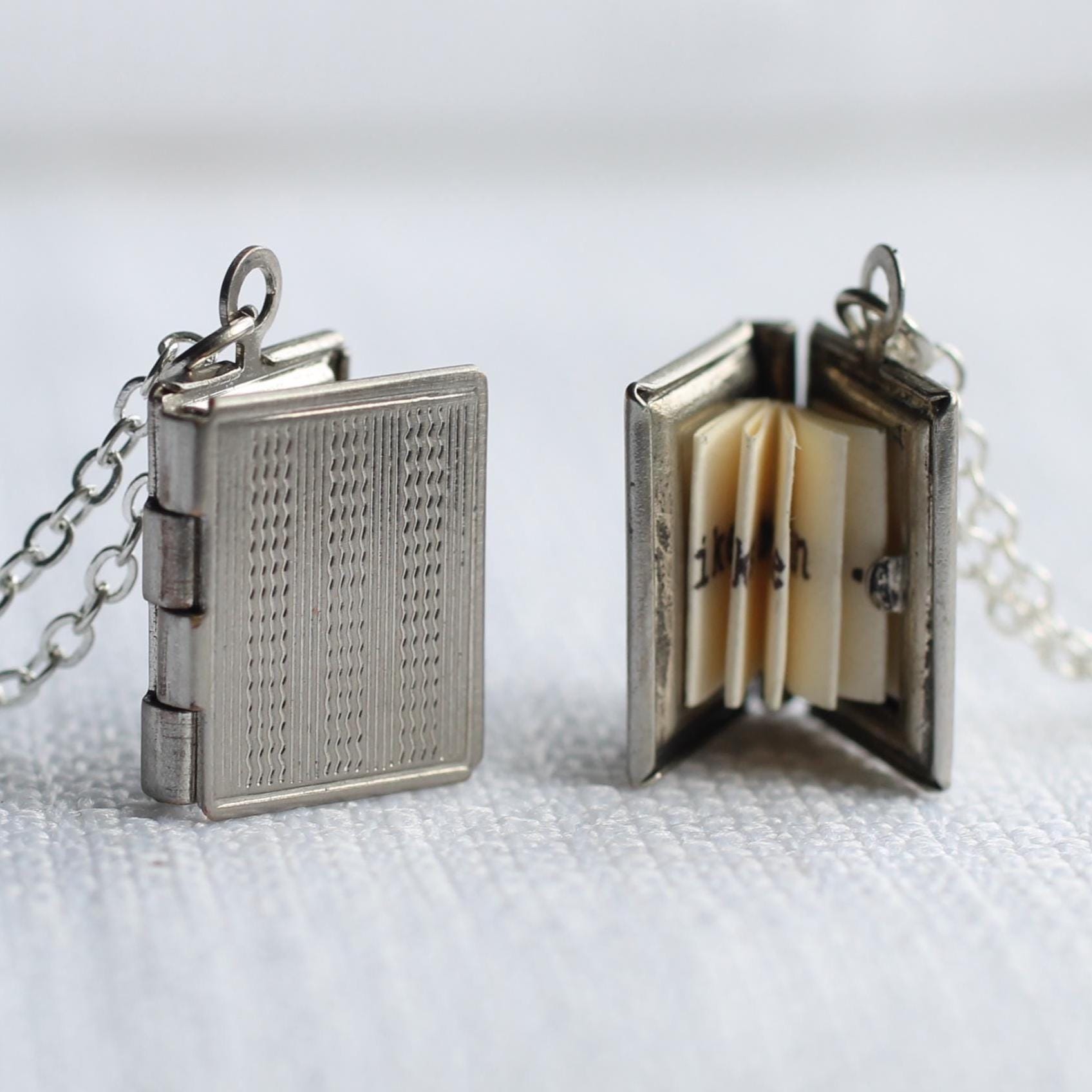 This personalised rectangle locket necklace is a beautifully detailed tiny silver book. Inside every locket is a secret hidden message, specially folded and fitted inside the locket to look just like the pages of a real book!