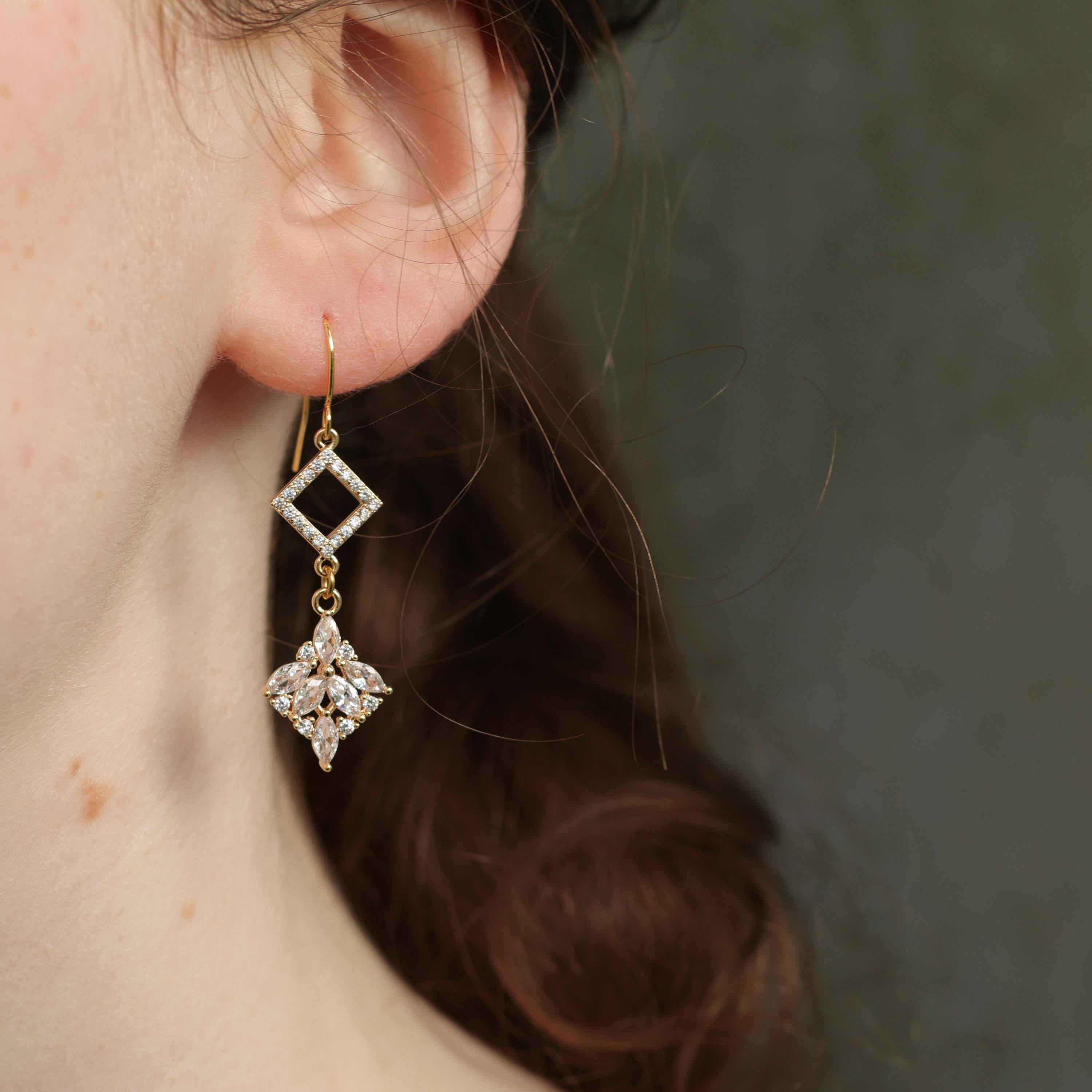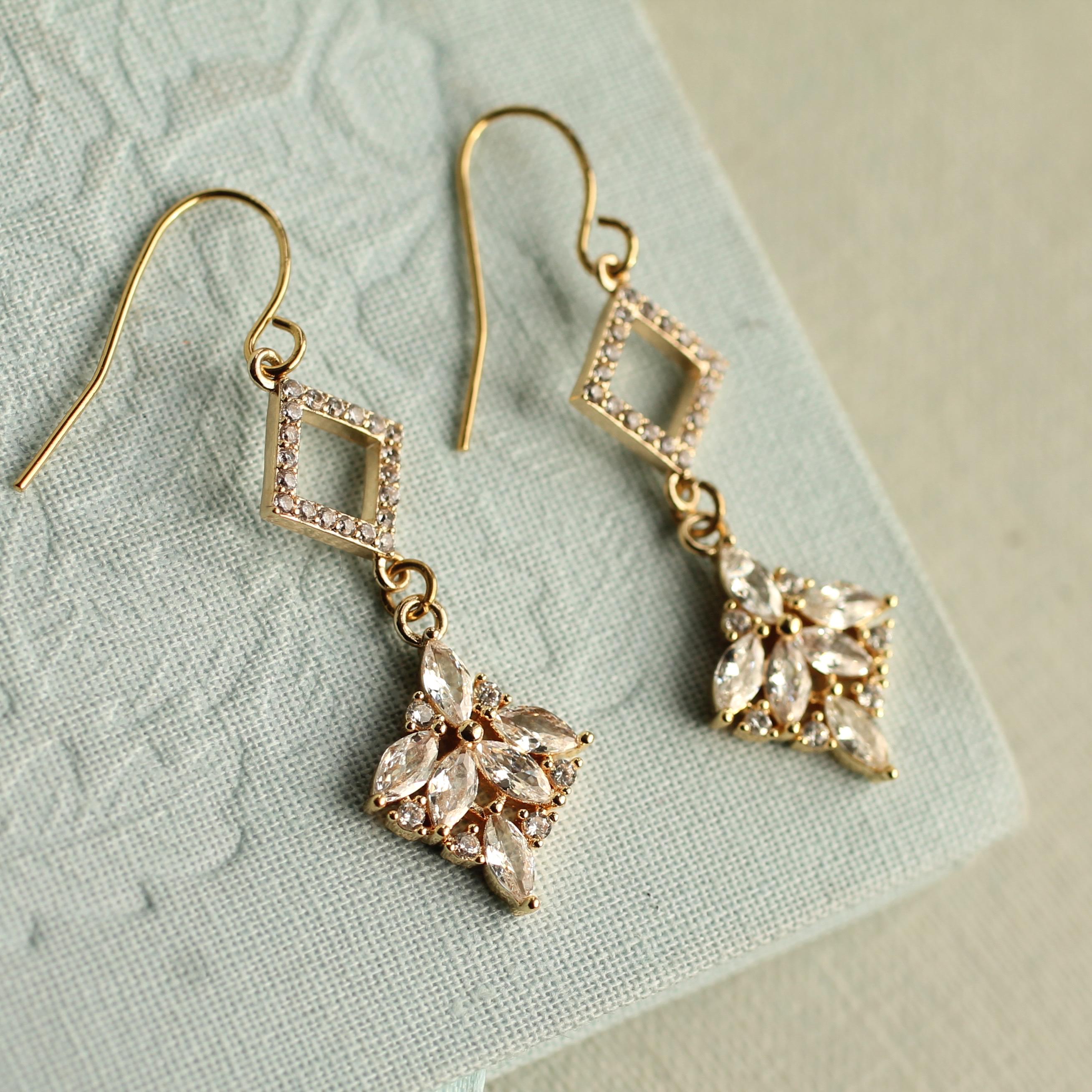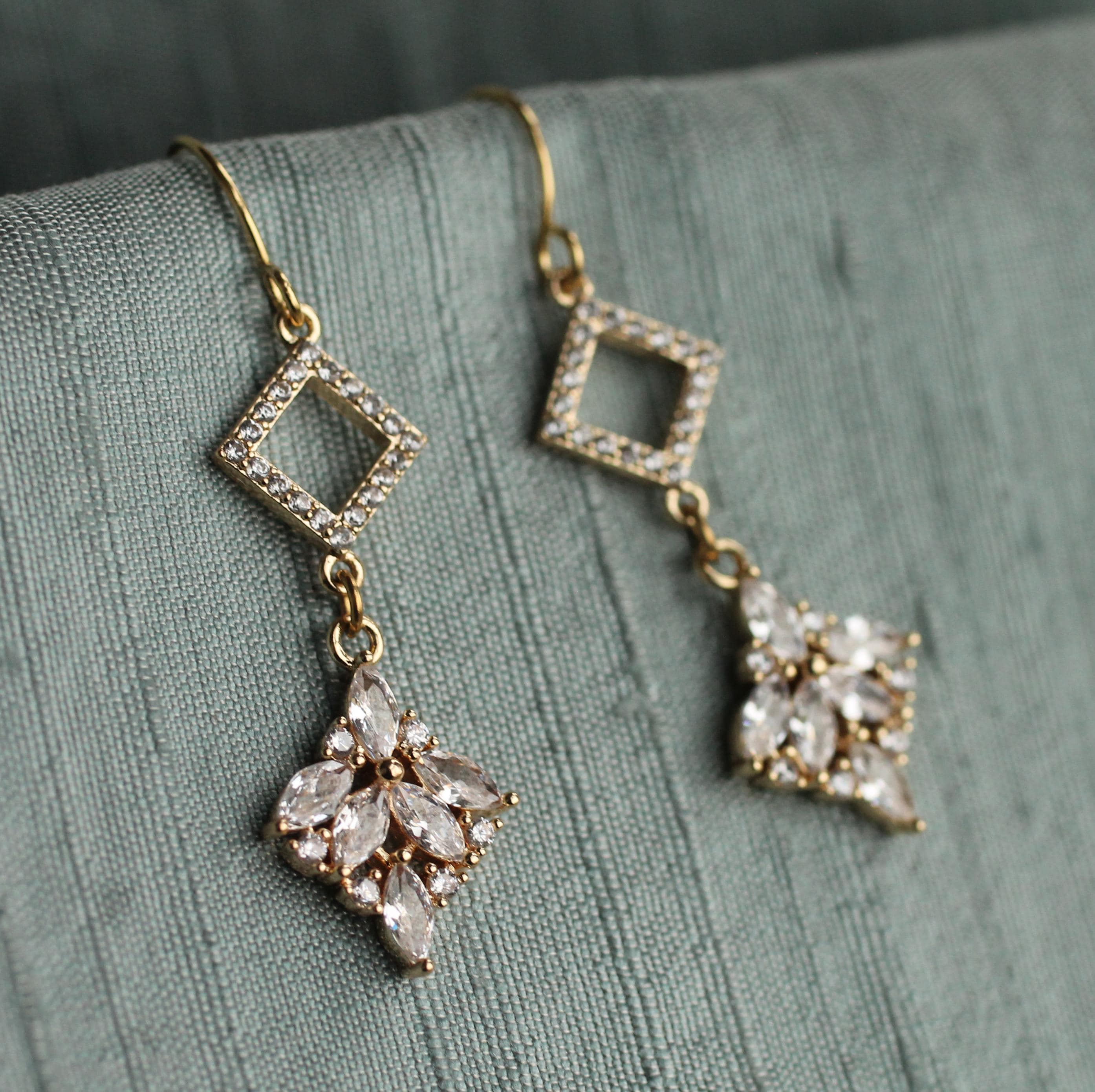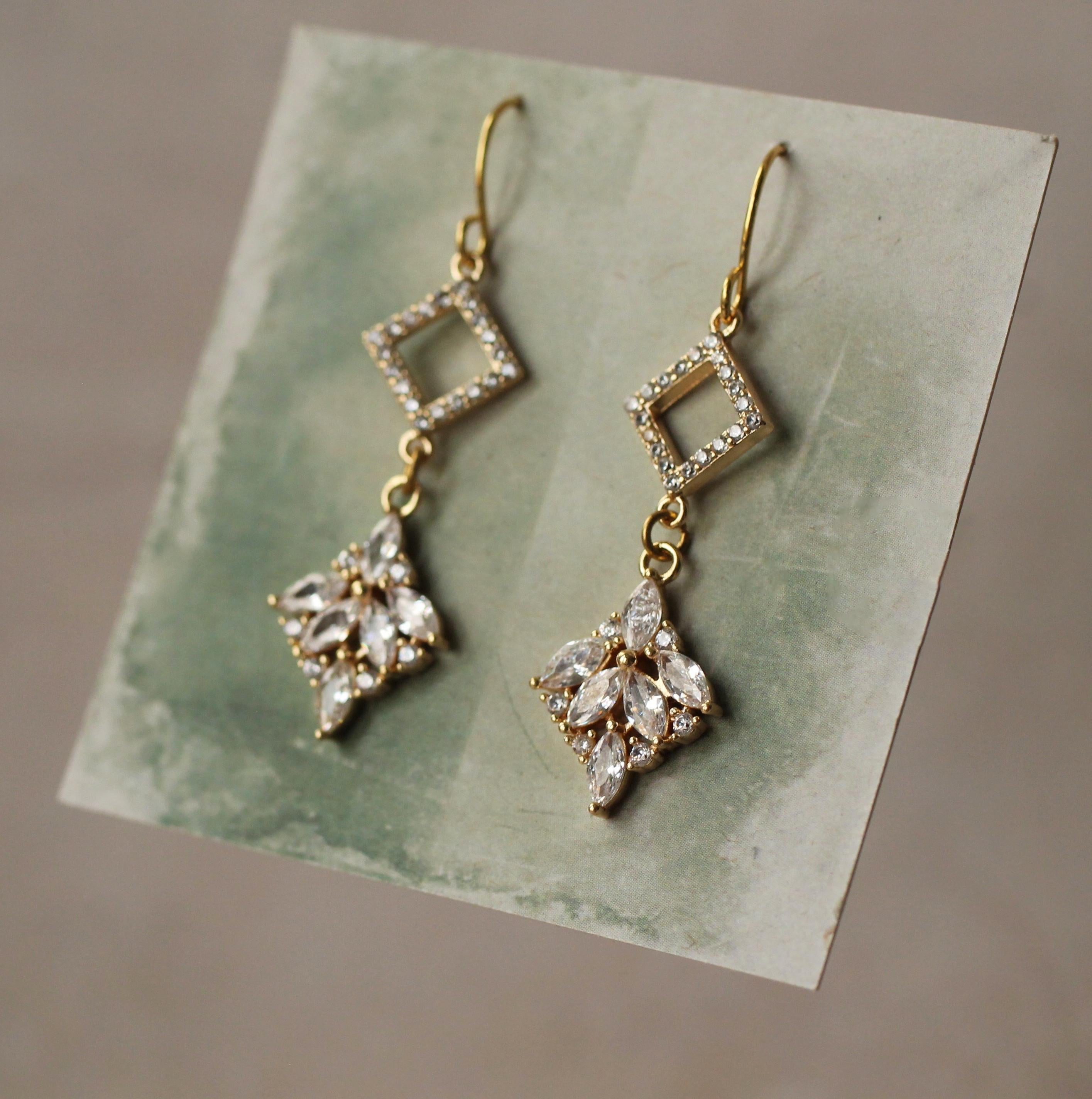 These beautifully detailed art deco earrings feature a stylised crystal geometric design. The drop and settings are gold plated brass with crystal stones. The earwires are available in either gold plated brass, or gold plated sterling silver (vermeil). The length of these earrings just under two inches (45mm) with the earring designed to sit around the jawline.