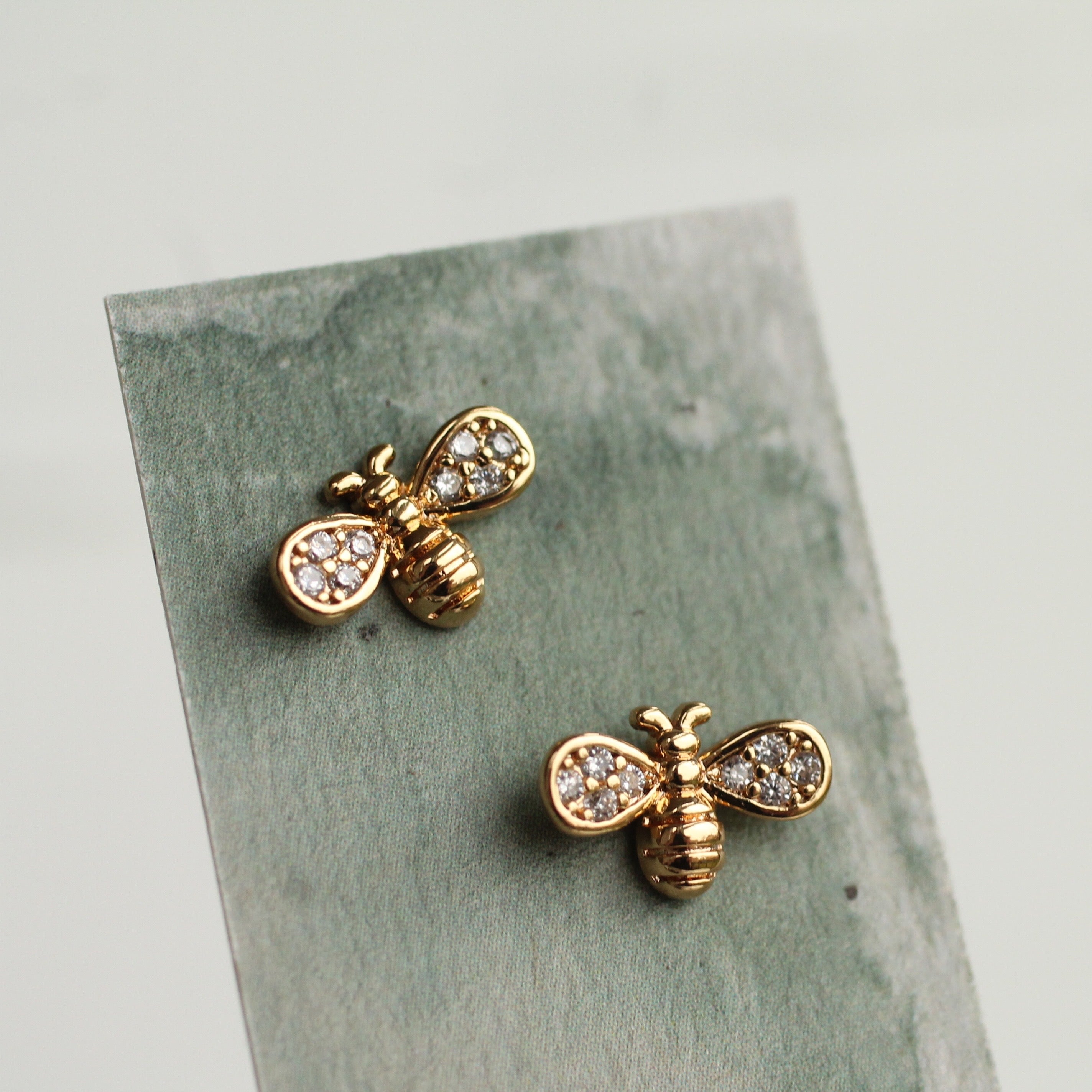 These sweet stud earrings are made from high quality gold plated brass, with tiny crystal jewels set into the wings! The earrings measure just 7mm across. These stud earrings come mounted on a linen presentation card.