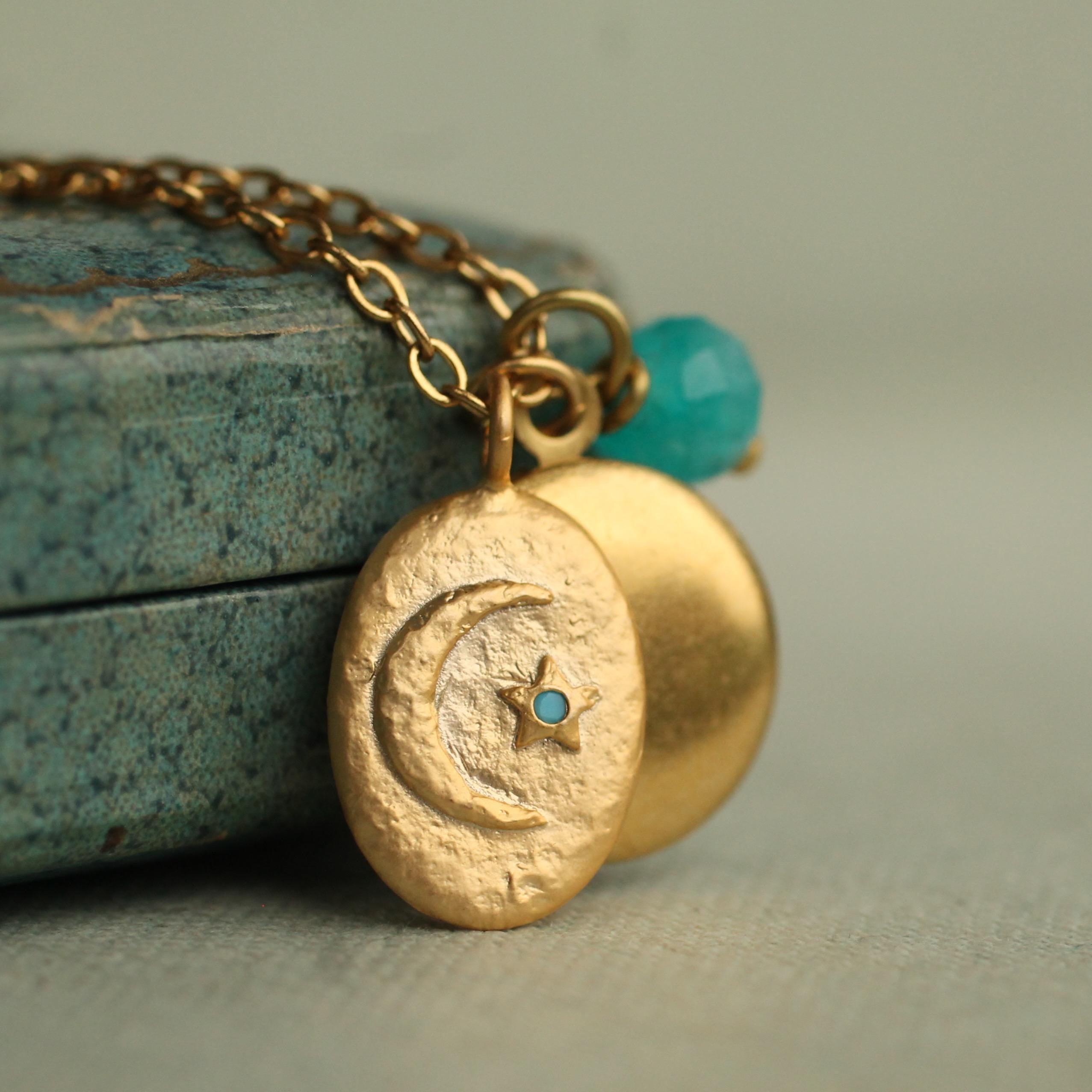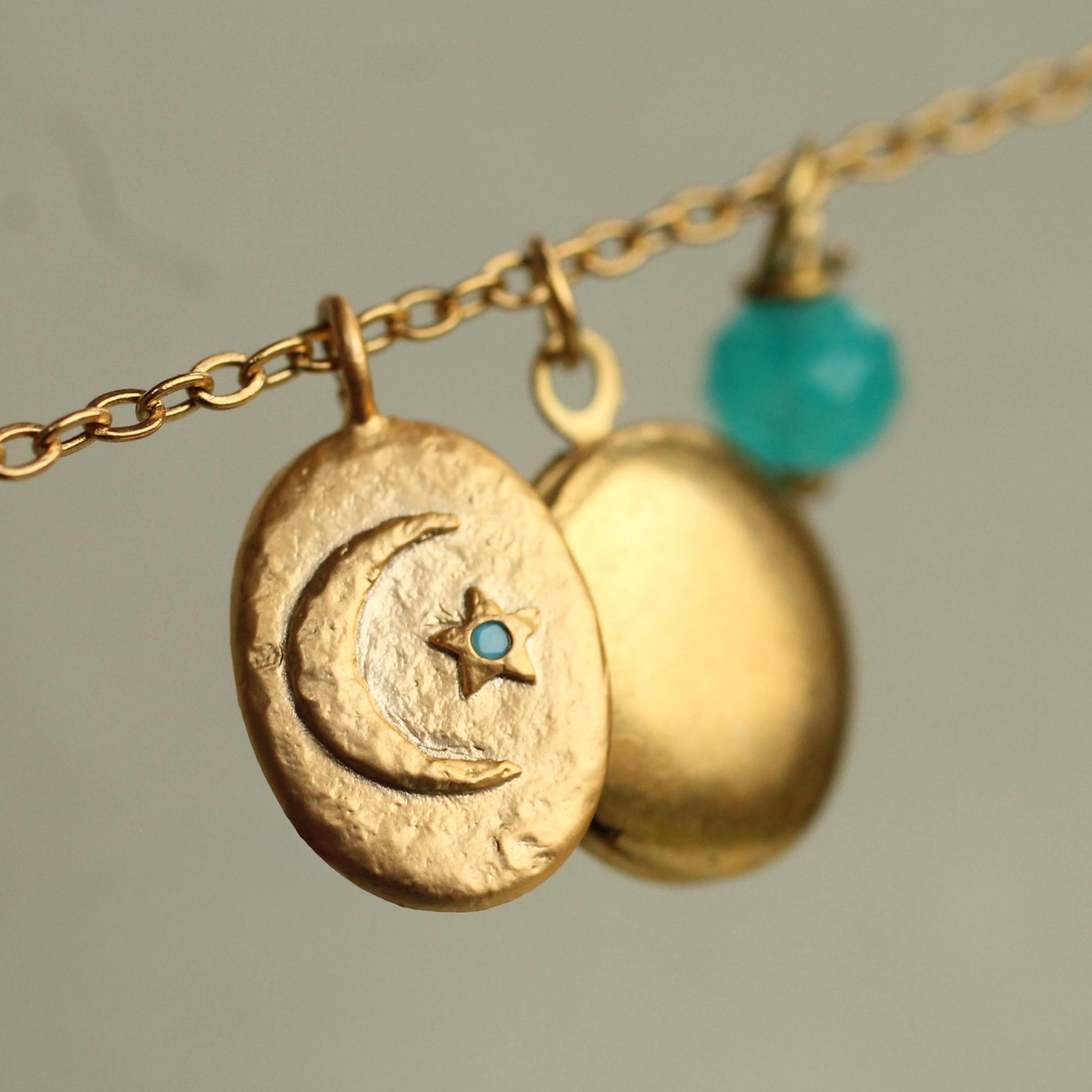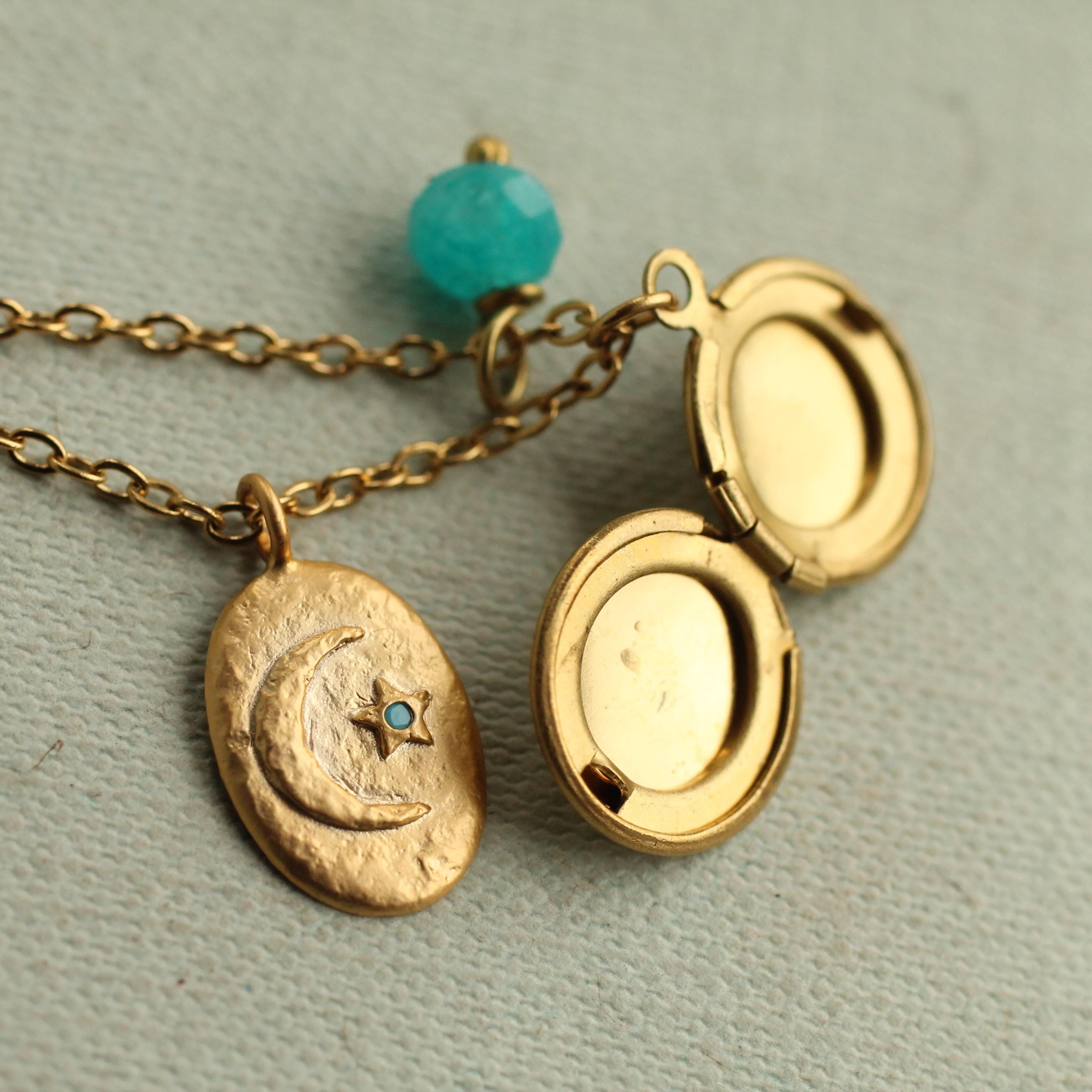 This personalized charm locket features a charming moon charm, with a tiny turquoise stone set into the star! The charm hangs alongside a solid brass photo locket and a tiny amazonite turquoise accent stone. We can personalise this locket by professionally adding your photos inside. You also have the option of engraving the initials of your choice on the front. The locket and charms measure 12mm in diameter. The chain is 18" long. Both the coin charm and locket are made from solid brass.