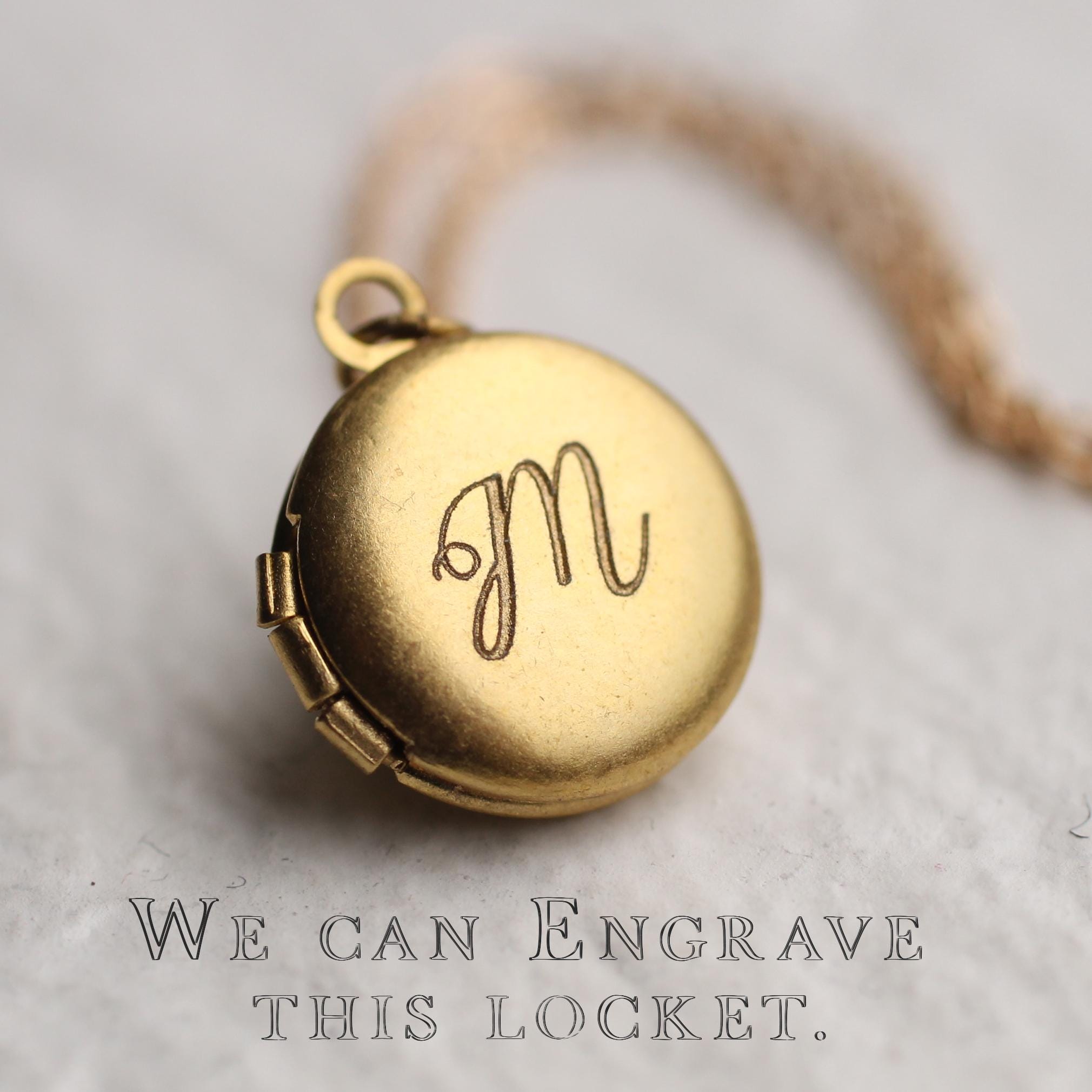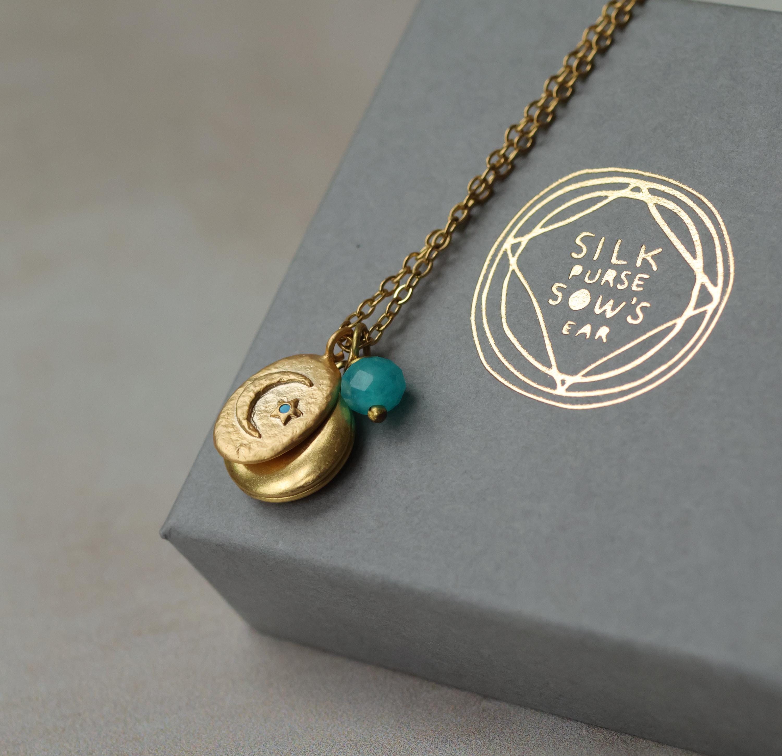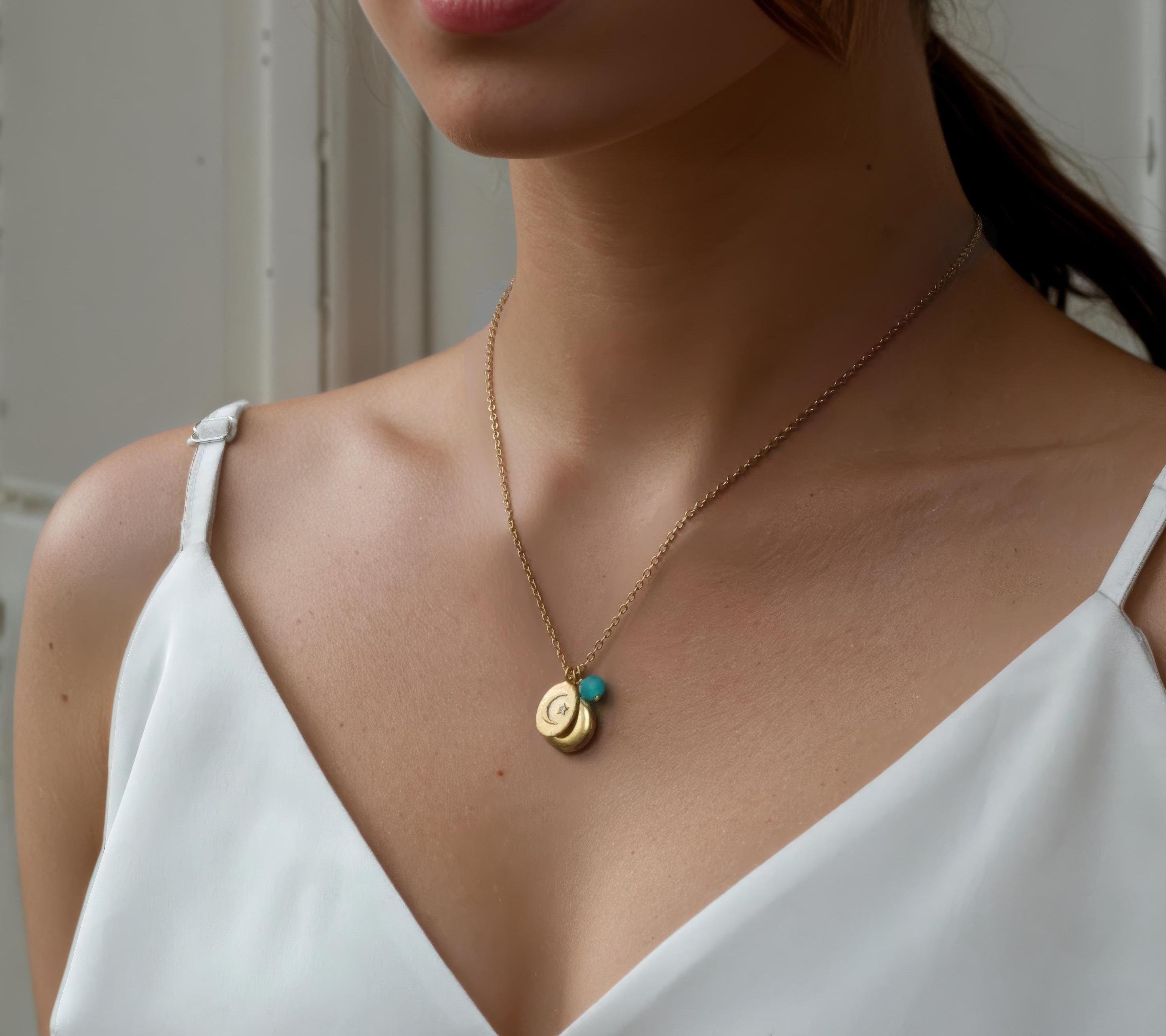 This personalized charm locket features a charming moon charm, with a tiny turquoise stone set into the star! The charm hangs alongside a solid brass photo locket and a tiny amazonite turquoise accent stone. We can personalise this locket by professionally adding your photos inside. You also have the option of engraving the initials of your choice on the front. The locket and charms measure 12mm in diameter. The chain is 18" long. Both the coin charm and locket are made from solid brass.