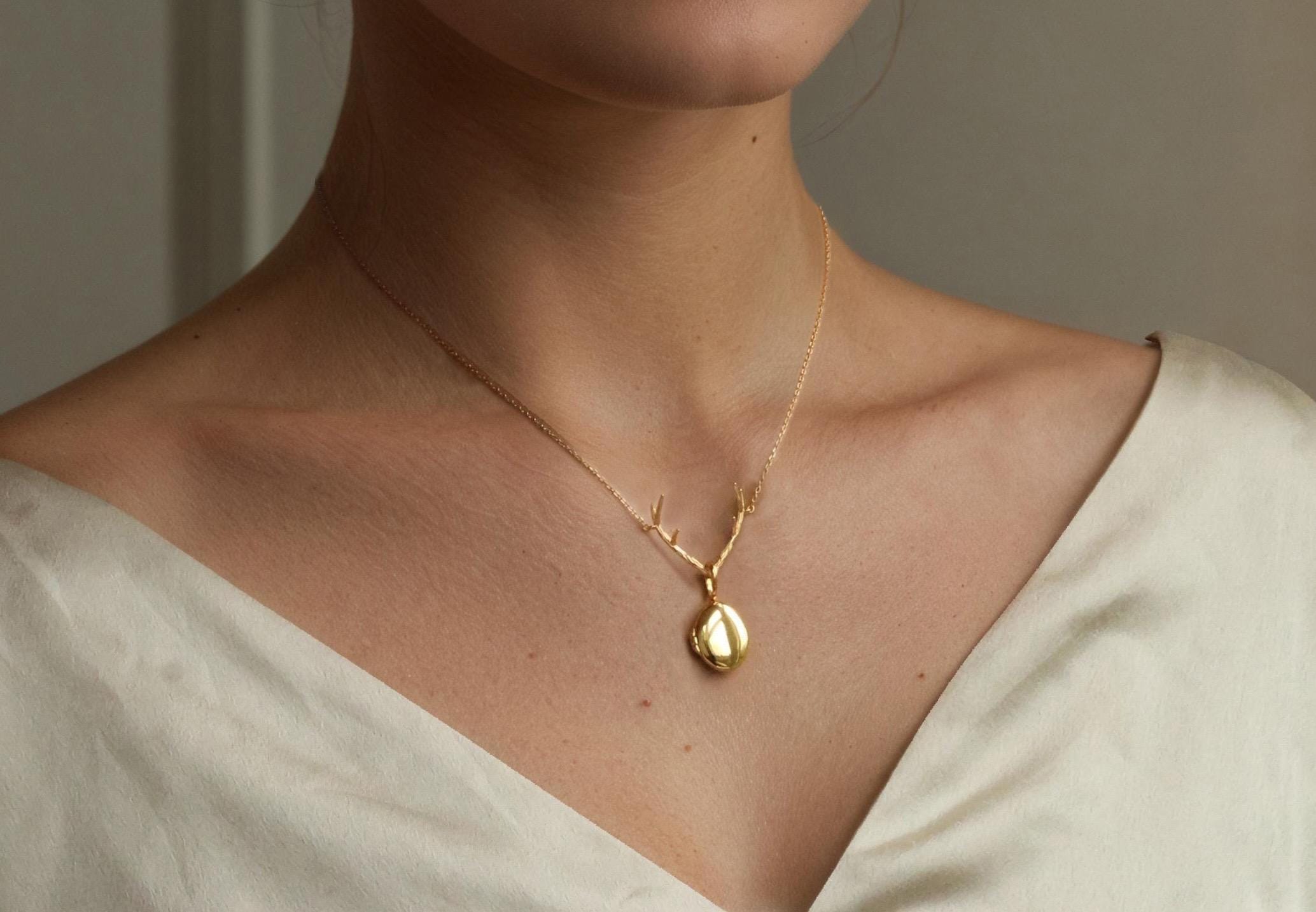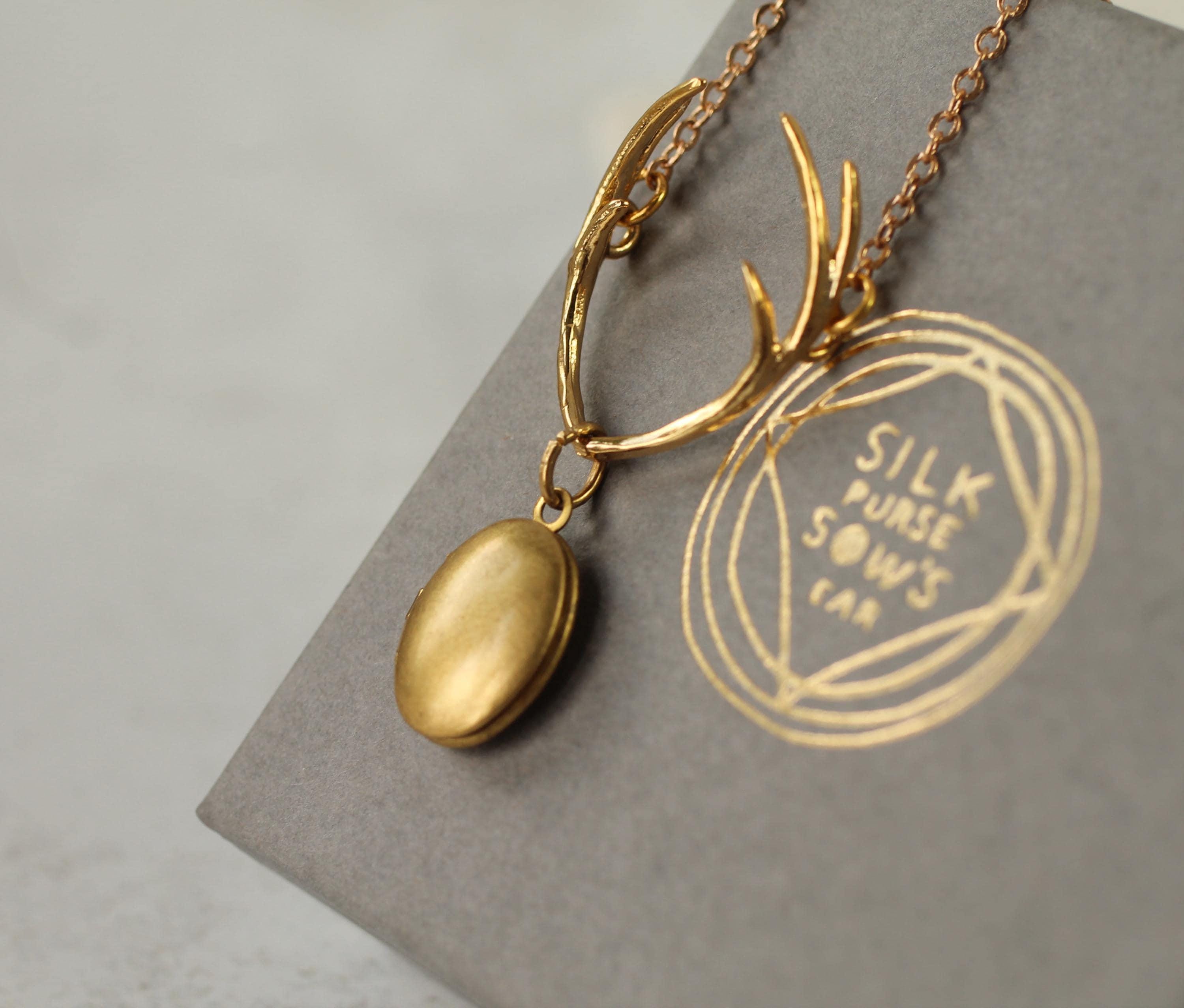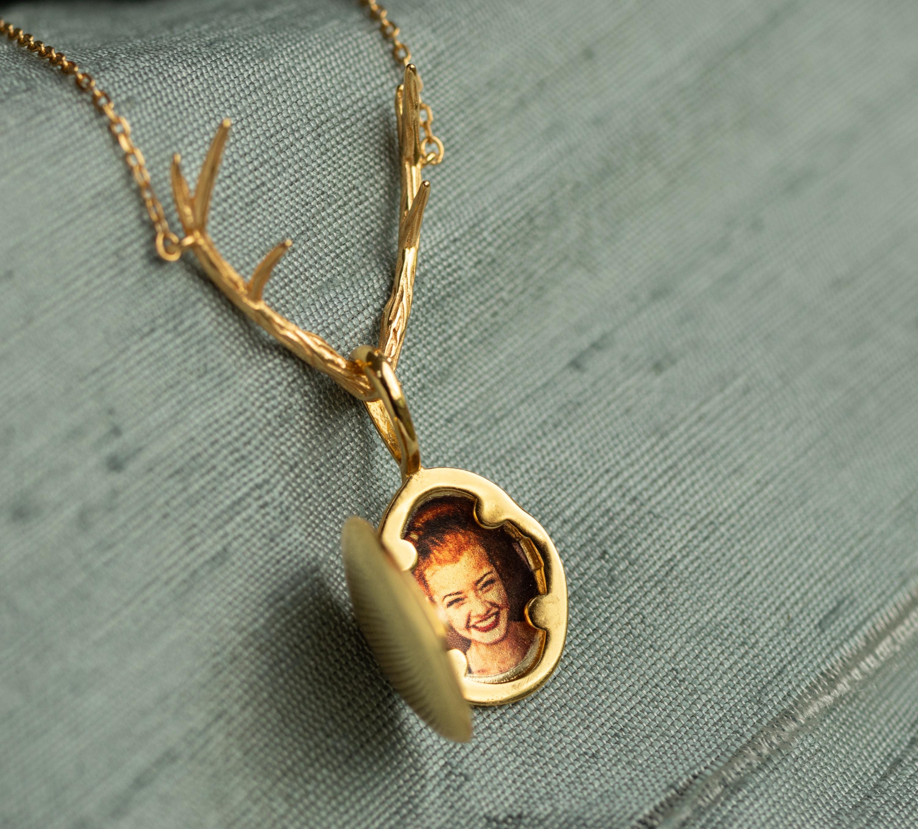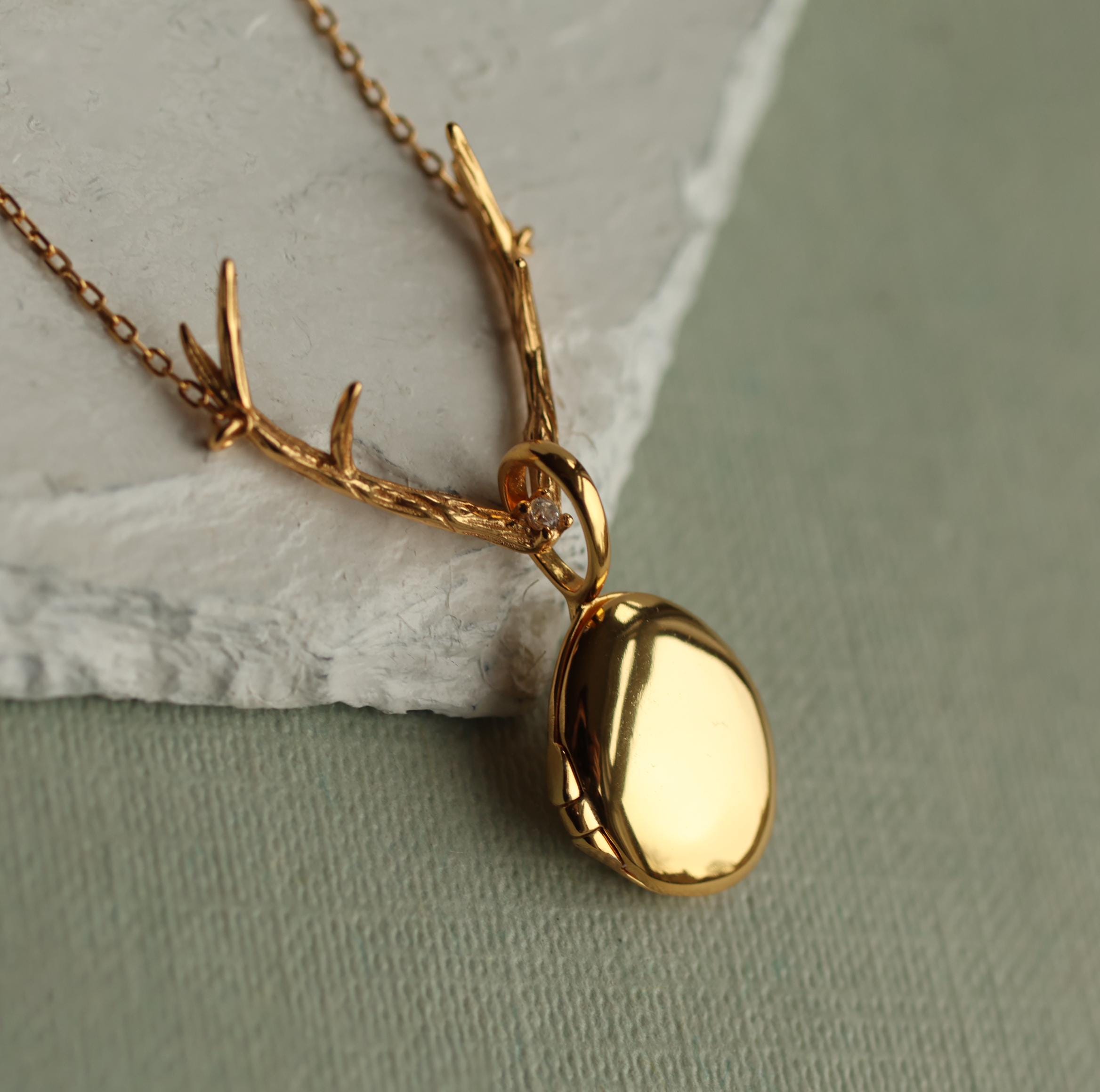 This personalized antler locket pendant features a golden pair of antlers and is teamed with a tiny oval locket to make the stag's head. The locket is dainty and miniature, making this a unusual but still very wearable piece of jewellery. The charm hangs alongside a gold vermeil miniature photo locket. You can personalize this locket further by adding a number of tiny birth stone charms, which will hang alongside the locket to create your own personal and eclectic charm necklace. The locket, charms and chain are made from gold-filled sterling silver (gold vermeil). The locket and charms are dainty size, measuring 14mm. The chain is adjustable and can be worn from 16" - 18" long. Please refer to our illustration for a better idea of how these might look when worn. We can personalise this locket by professionally adding your photos inside. You also have the option of engraving the initials of your choice on the front.
