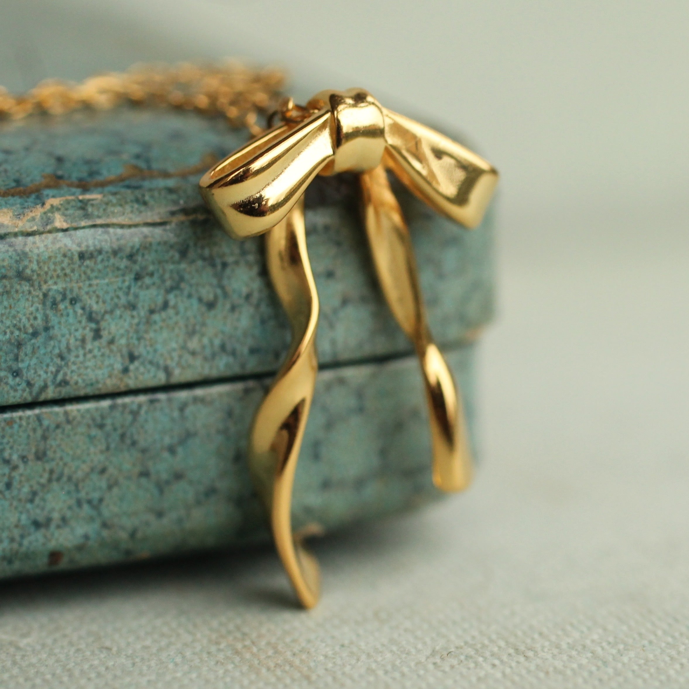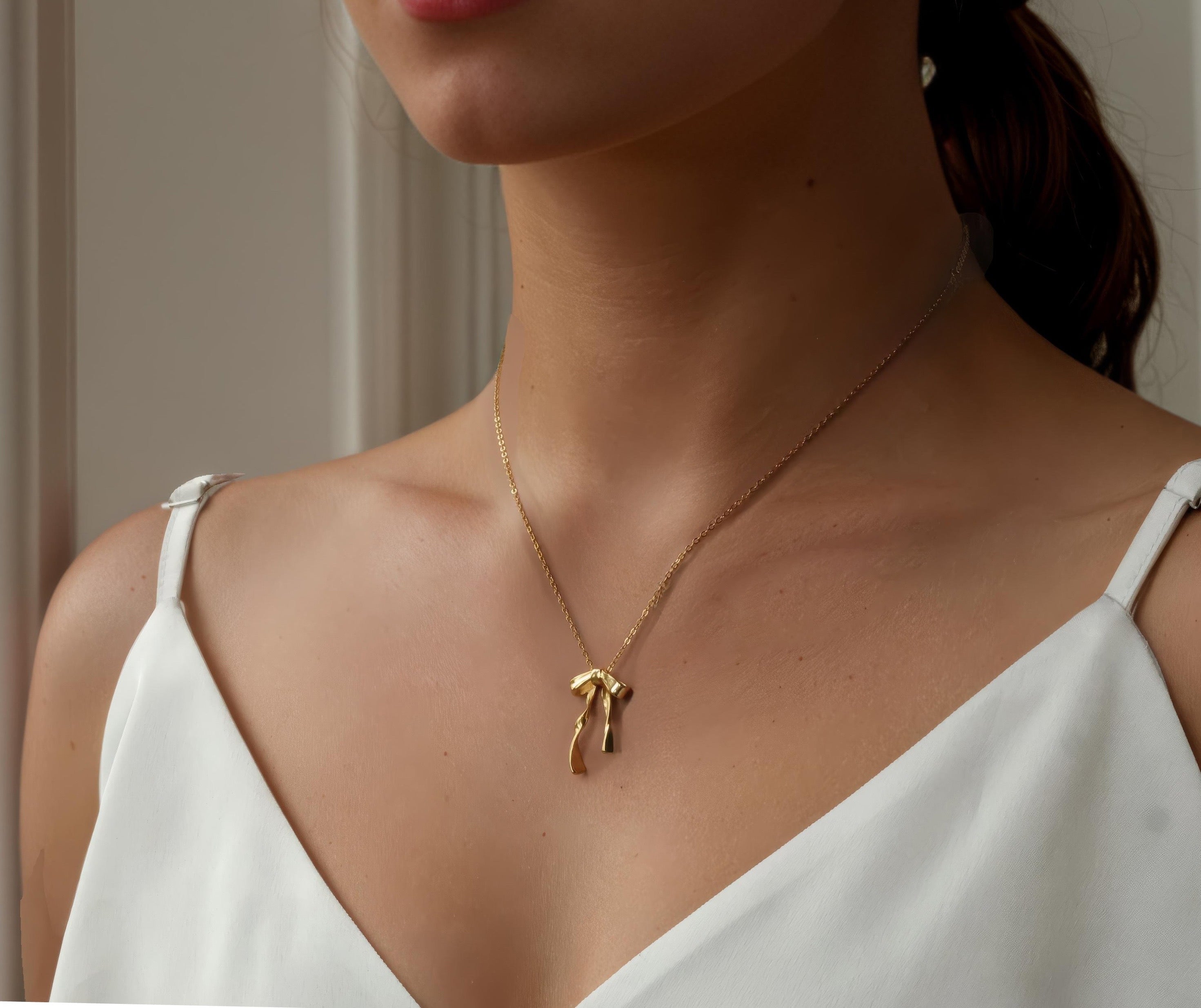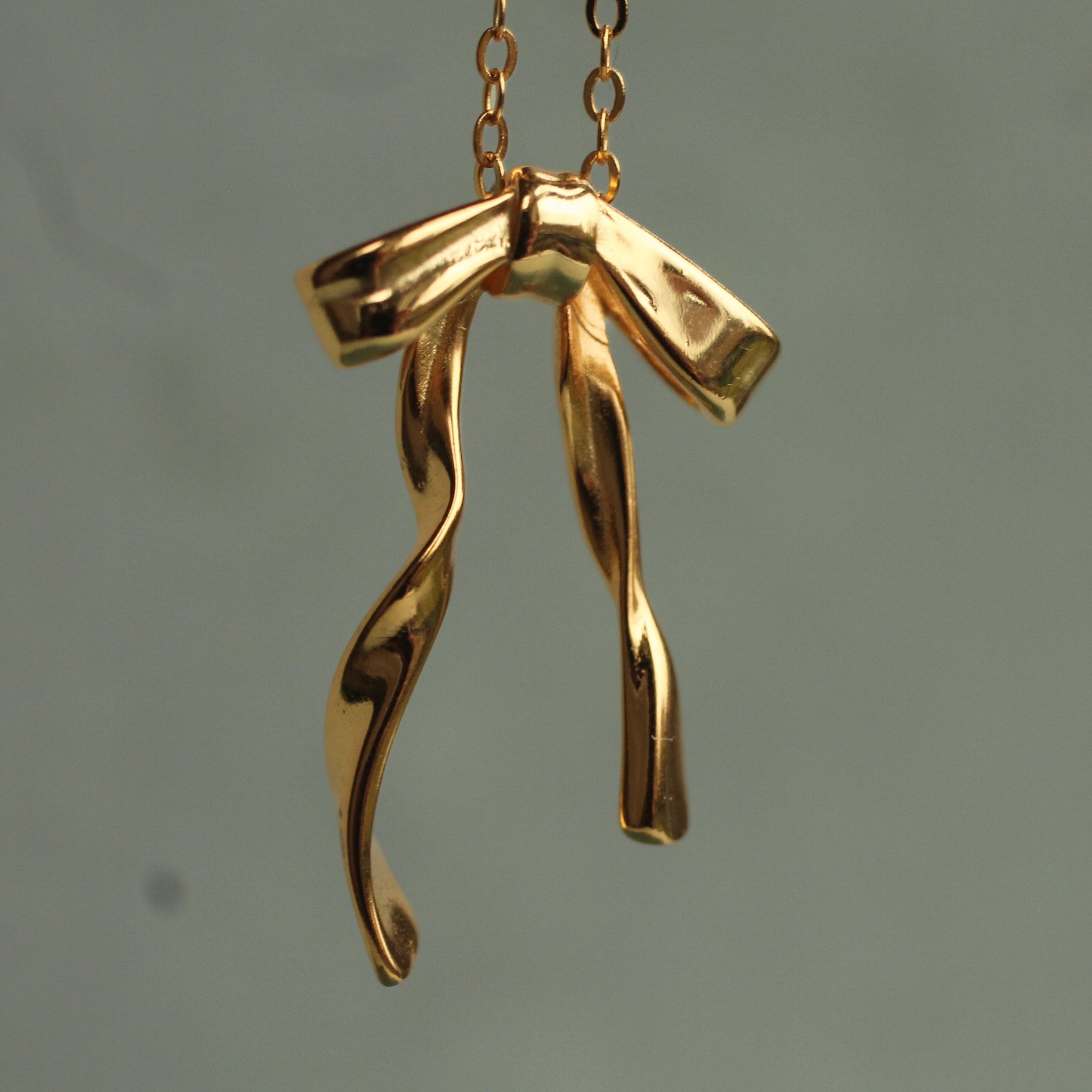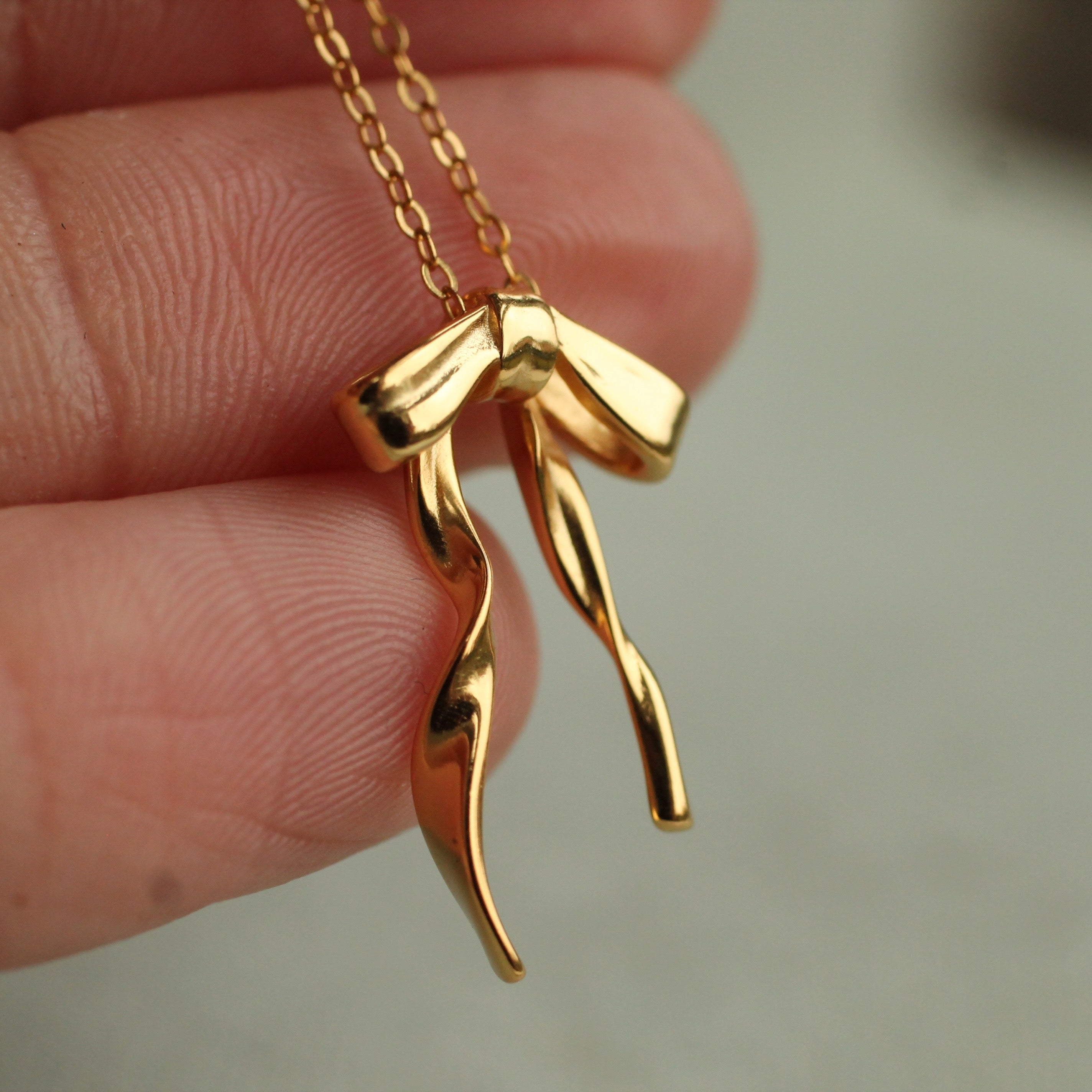 This sweet and dainty necklace features gold plated sterling silver, formed into a bow.