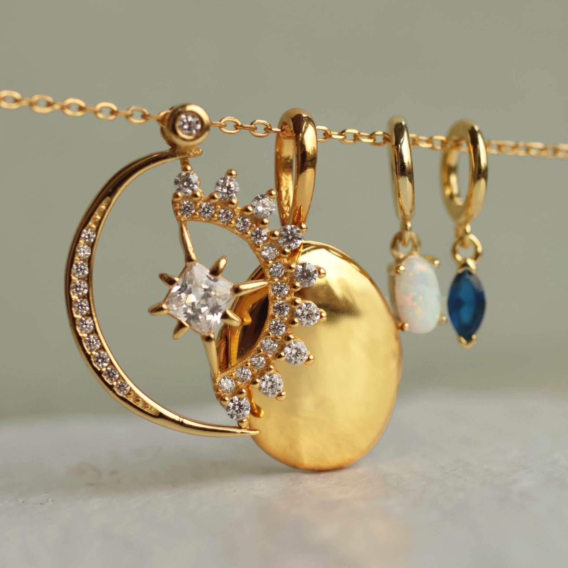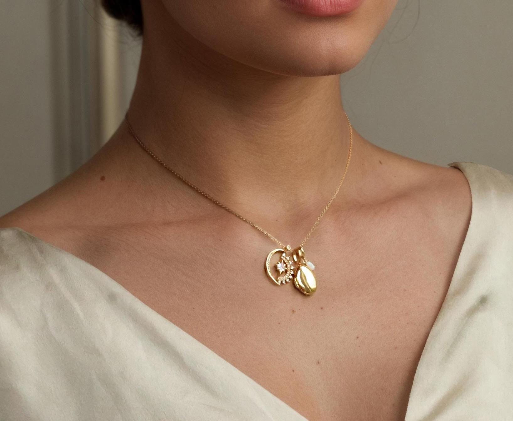 The locket, charms and chain are made from gold-filled sterling silver (gold vermeil). The locket and charms are dainty size, measuring 14mm. The chain is adjustable and can be worn from 16" - 18" long. Please refer to our illustration for a better idea of how these might look when worn.