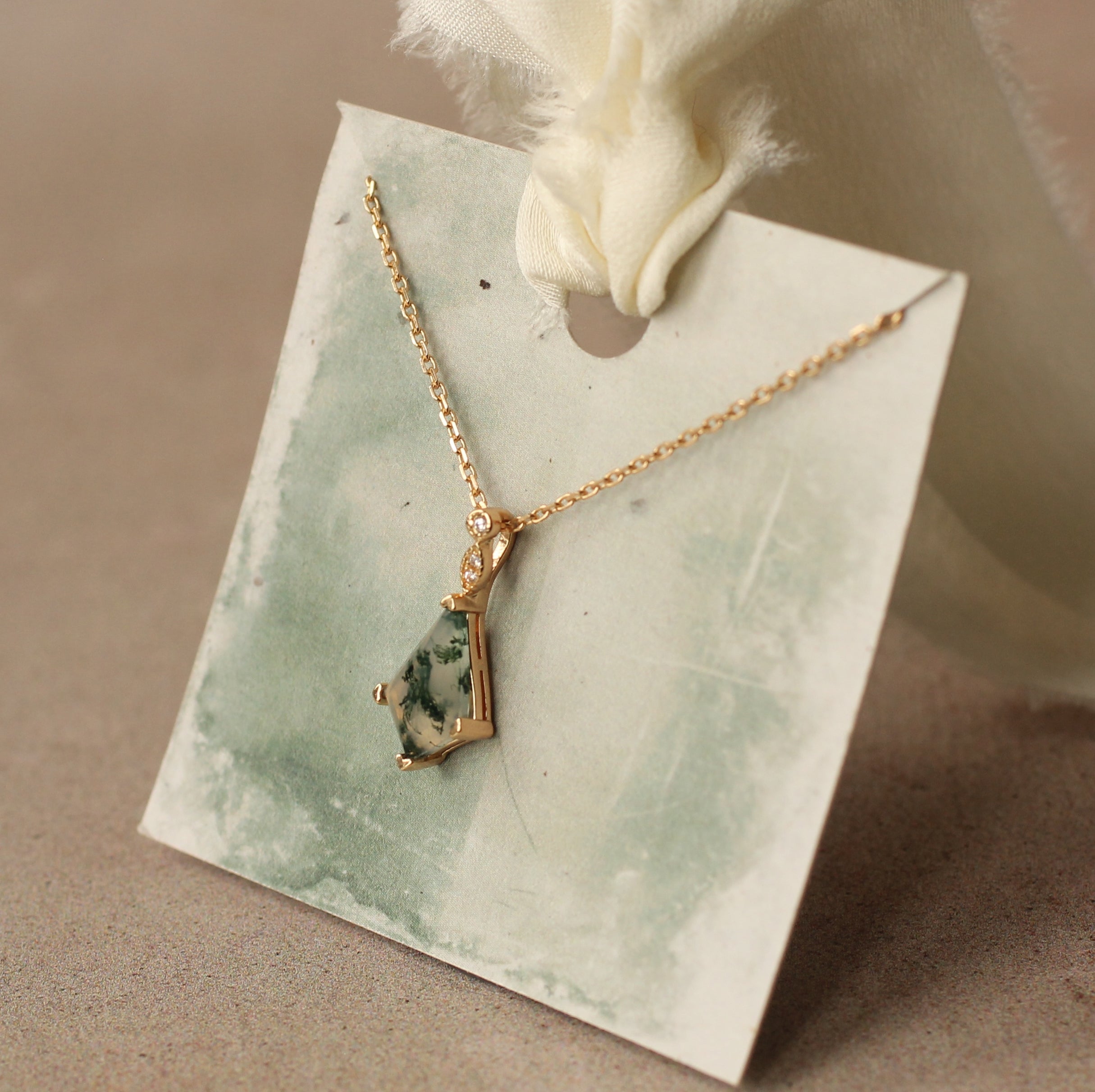 This beautiful real moss agate pendant features a kite cut agate stone. The clean, geometric lines are reminiscent of Art Deco design. Inside are tiny fragments of moss, preserved in the gemstone. They are very beautiful and special. There is a tiny cubic zirconia accent stone above the agate that catches the light. The pendant measures 16mm in length and is delicate and dainty when worn.