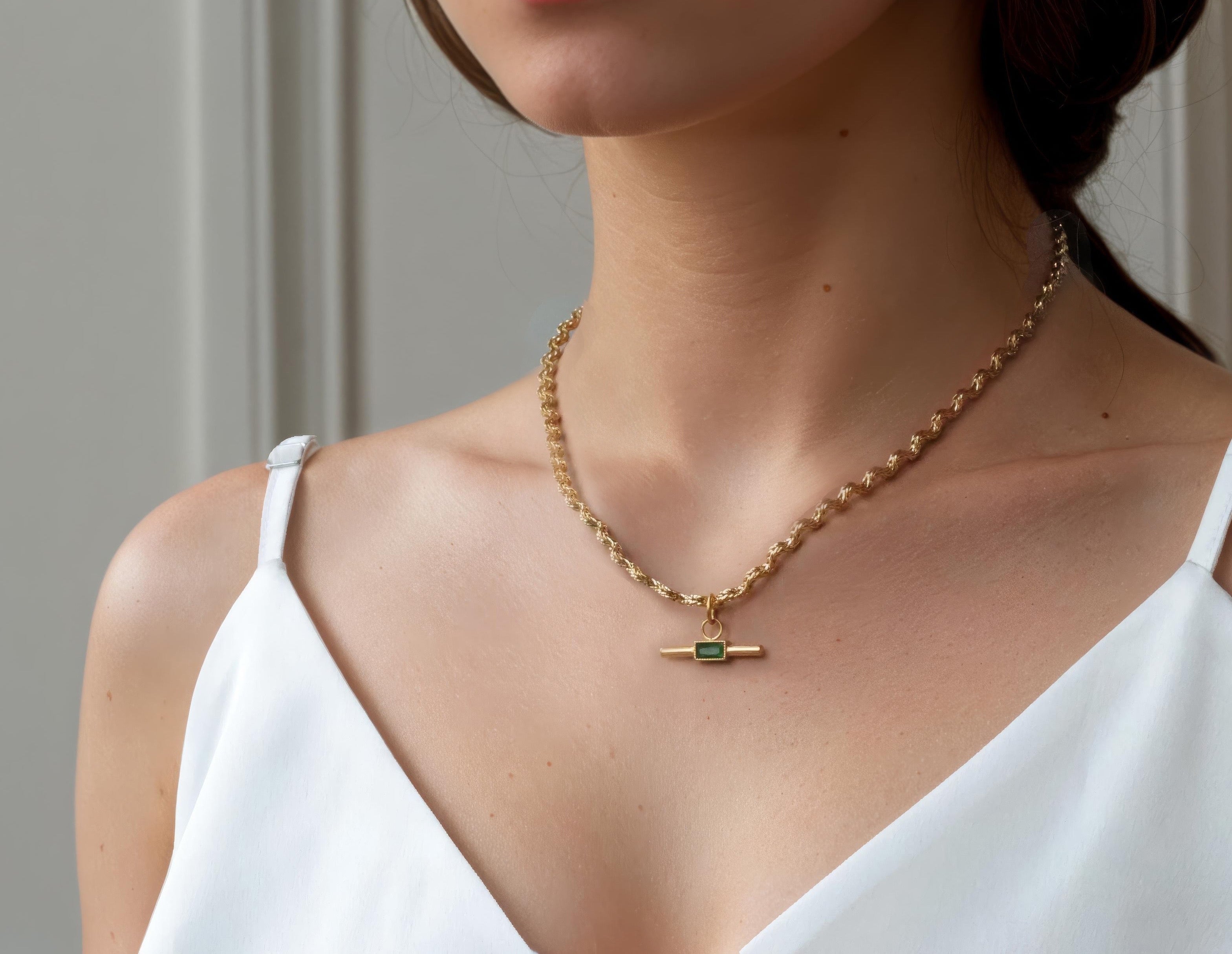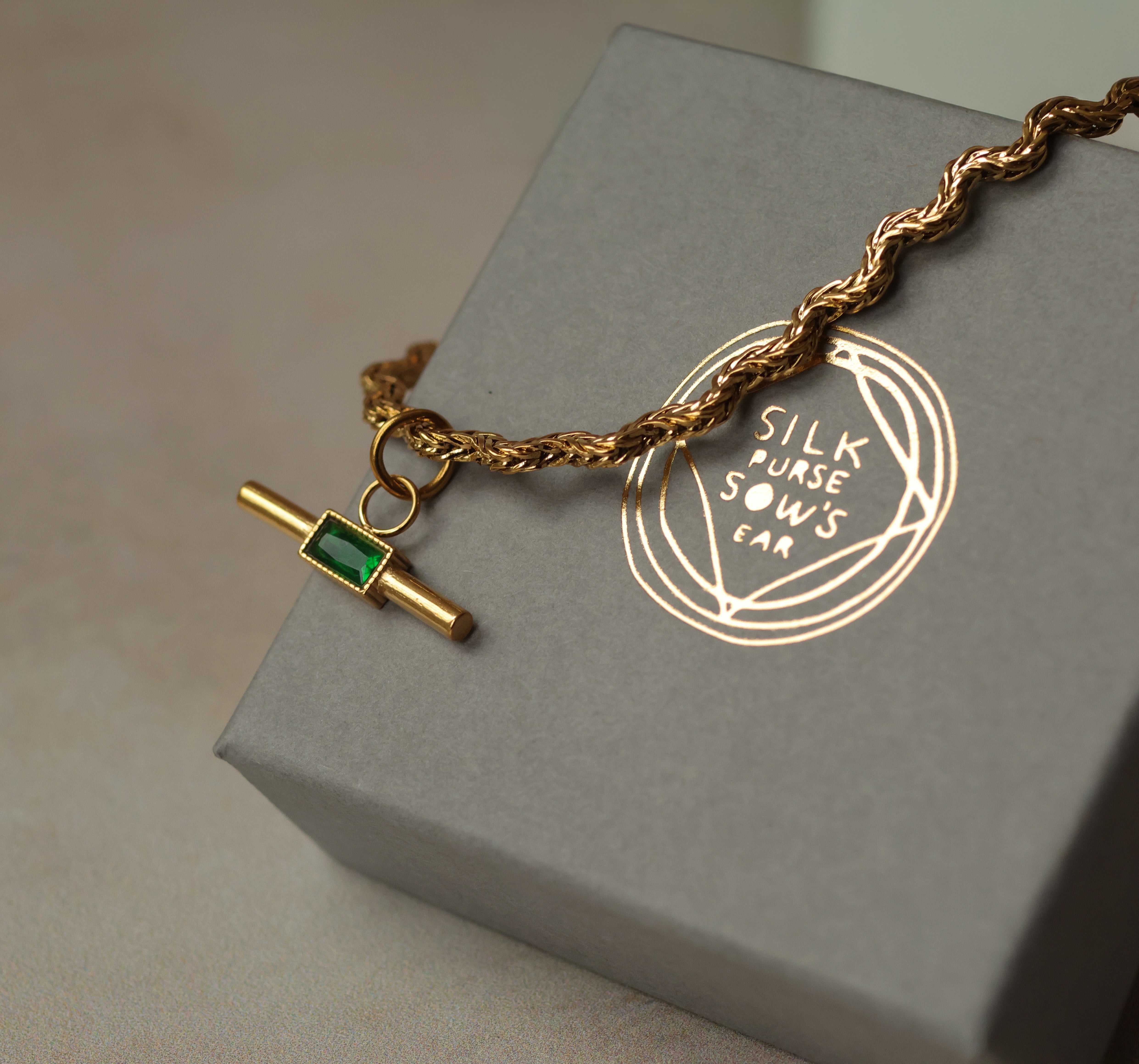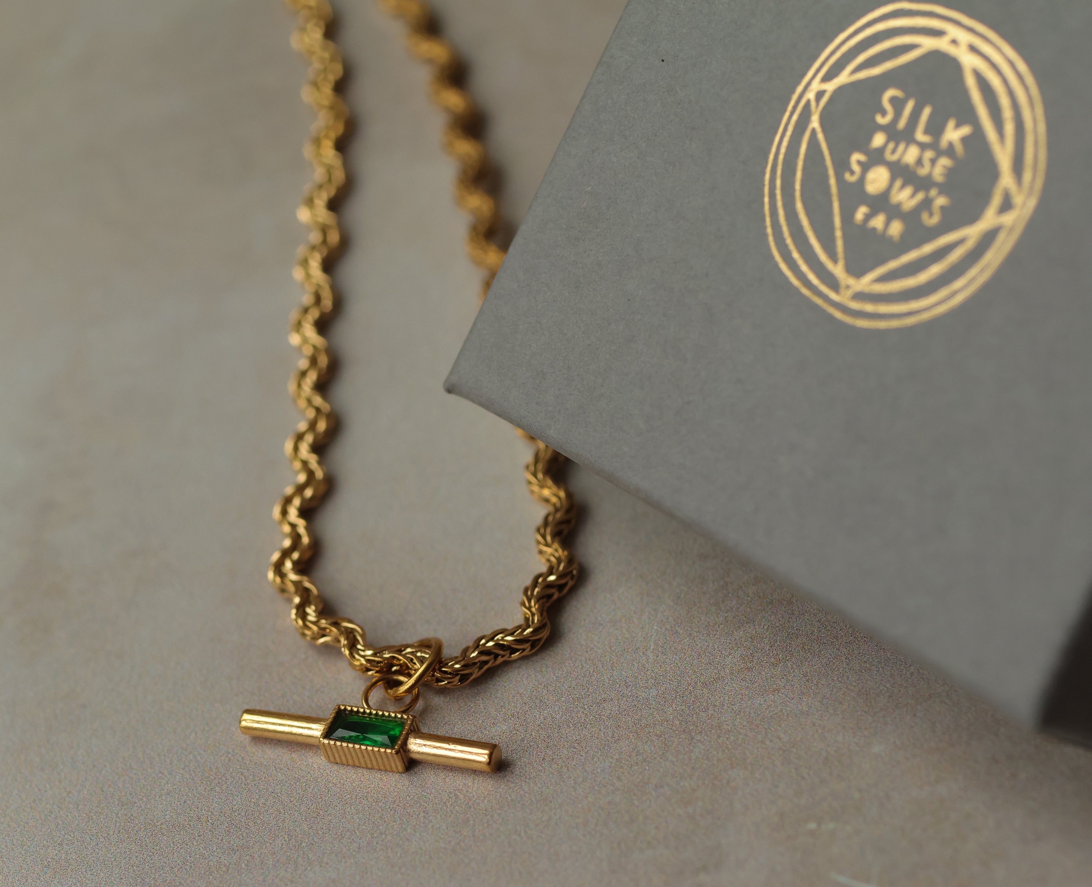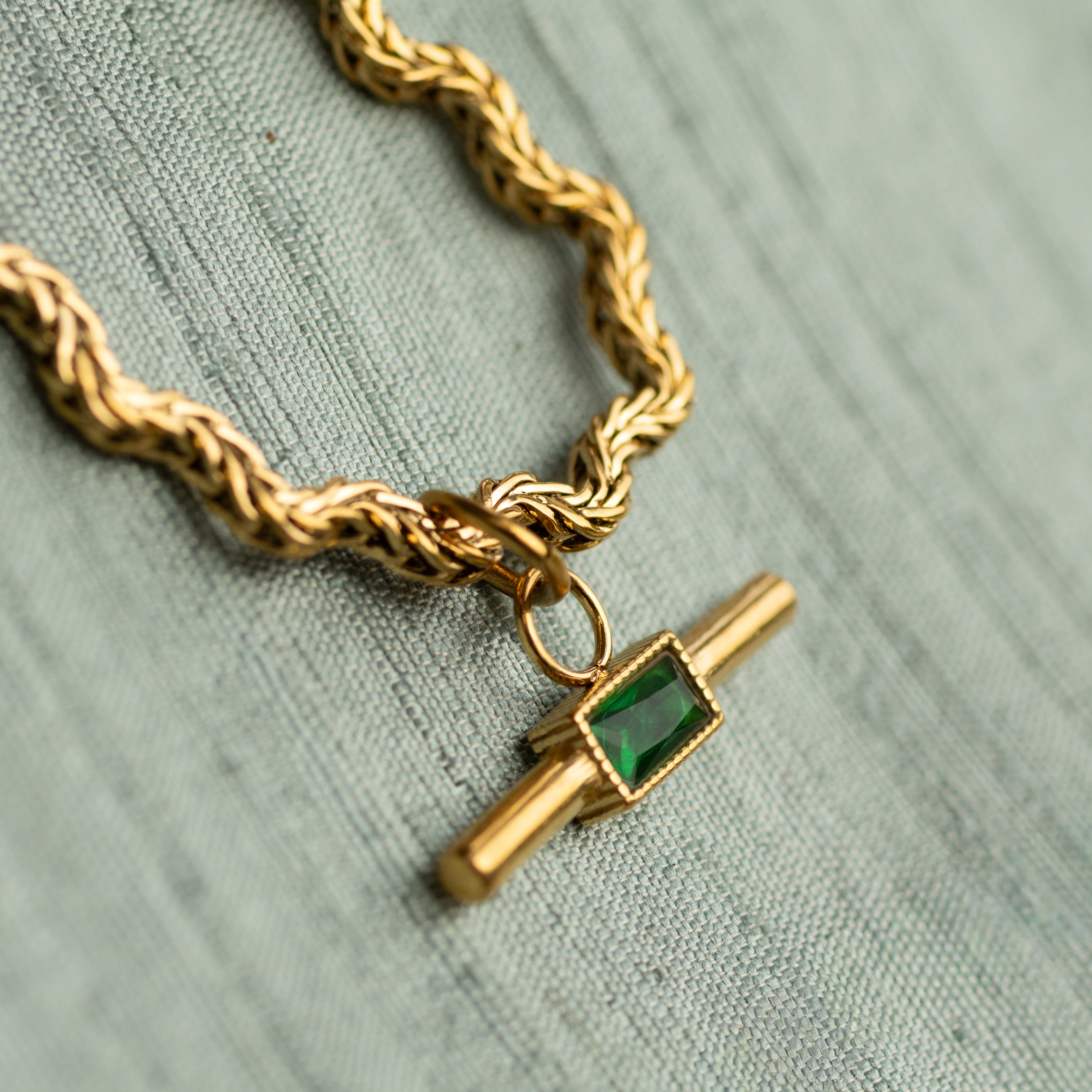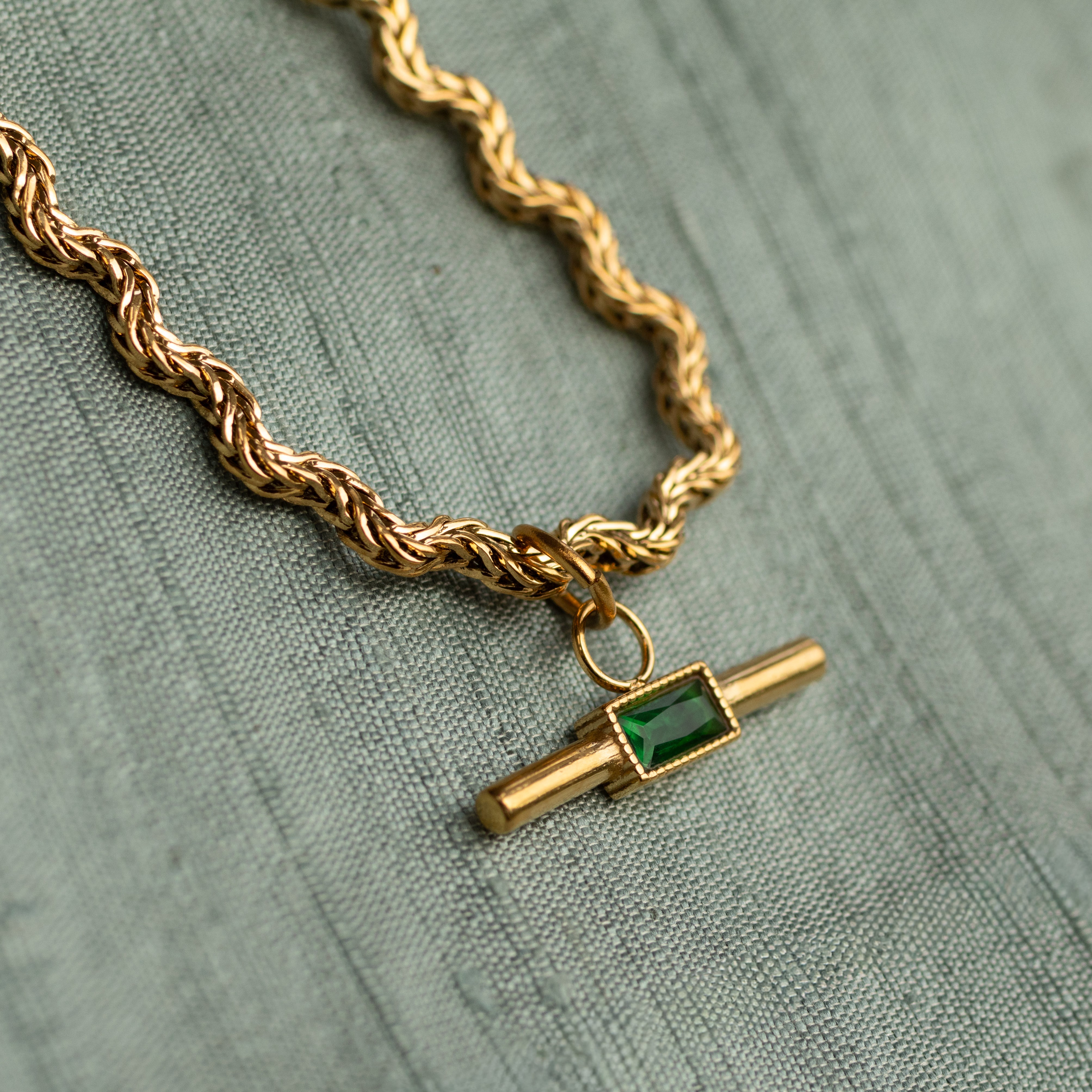 This great statement necklace features a woven chain which has been formed into a scallop formation.  It is accented with a simple bar pendant with an emerald green accent stone set into the bar.