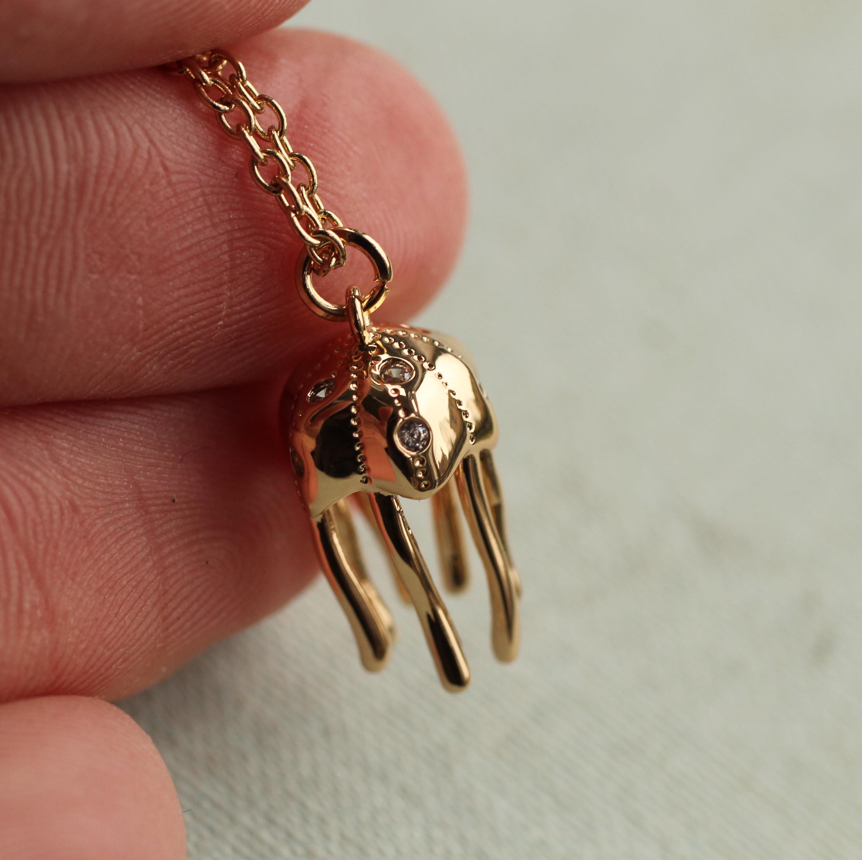 This sweet and unique necklace features a stylised jellyfish pendant, gold plated with tiny crystals set into the body.