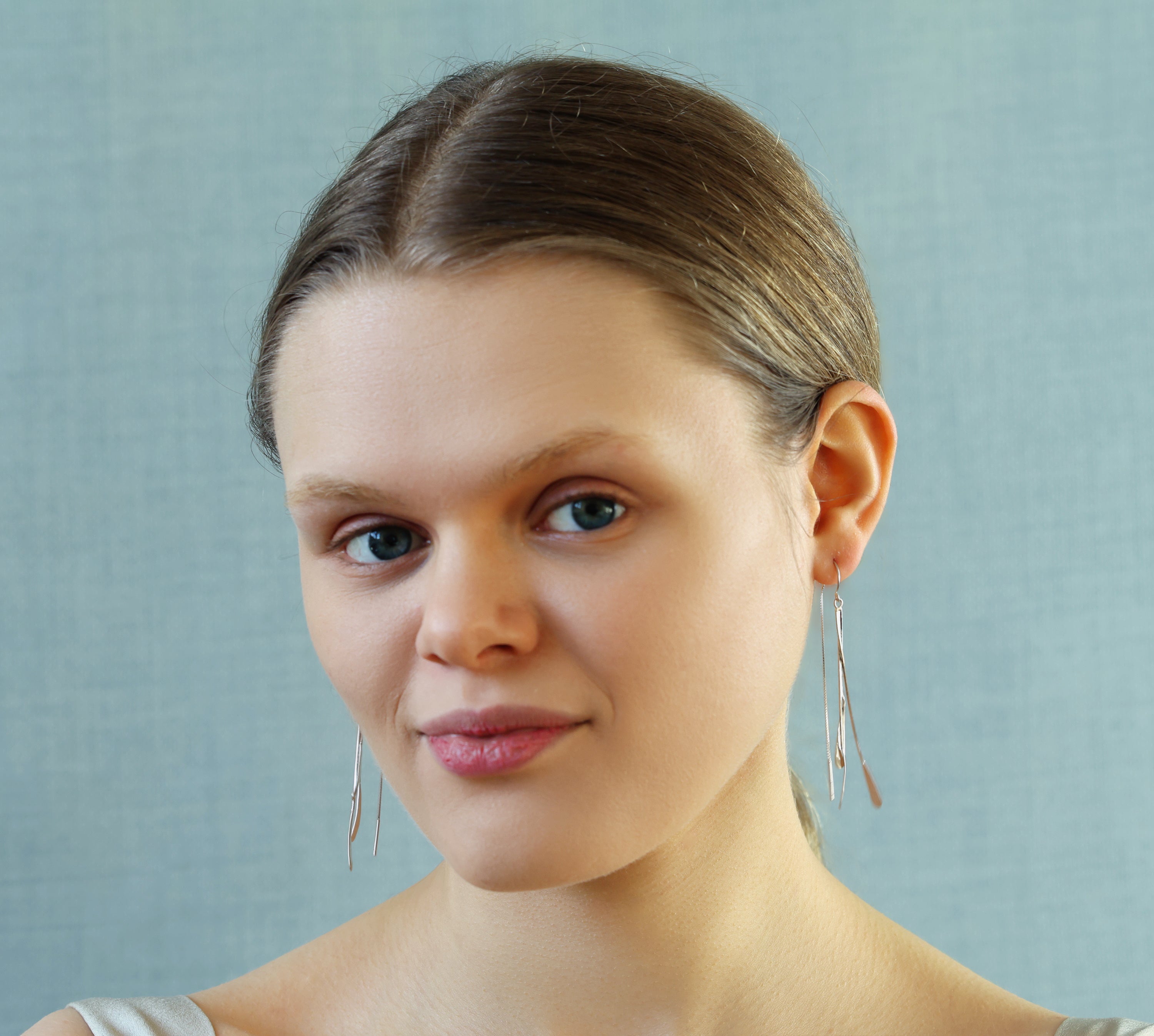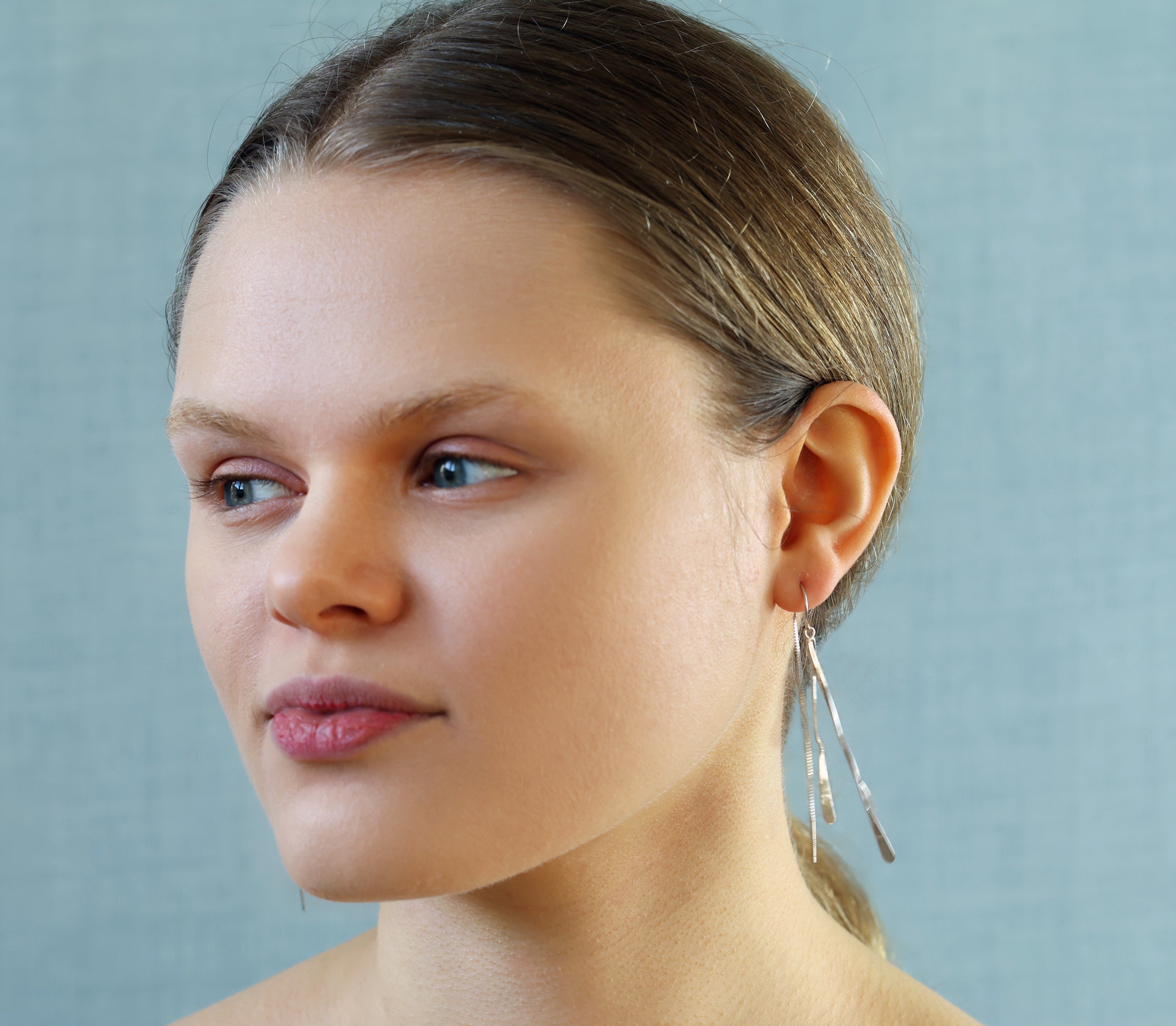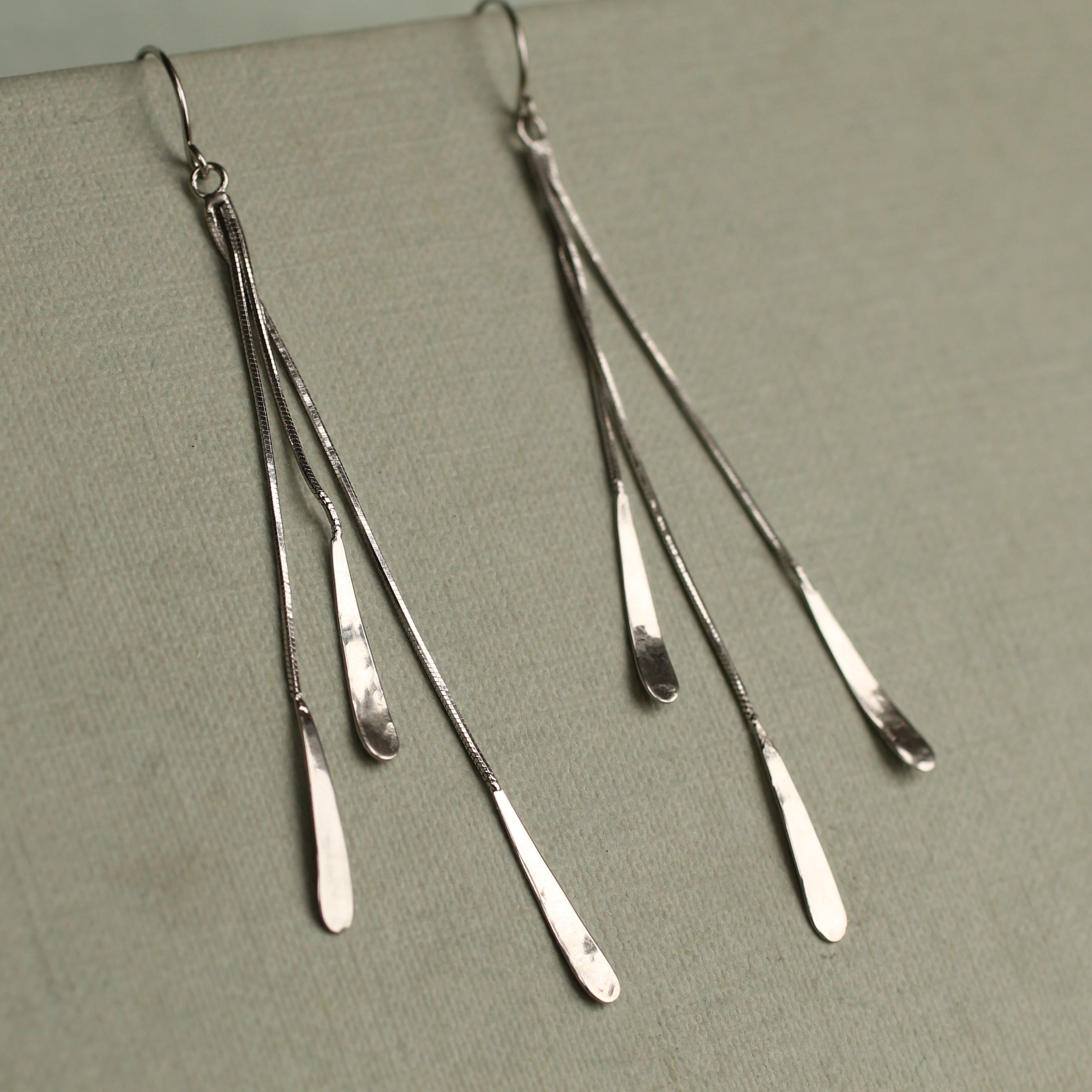 These beautifully light statement drop earrings are made from sterling silver and feature a trio of metal ribbons which hang freely. The earrings are long, measuring 8cm (three inches) in length and have a wonderful movement when worn.
