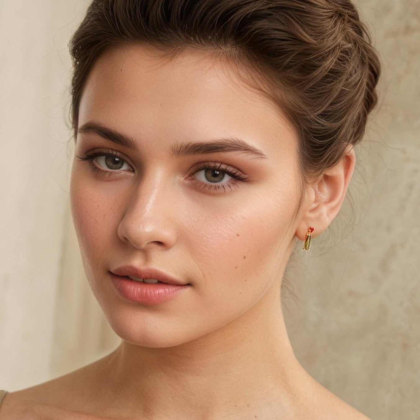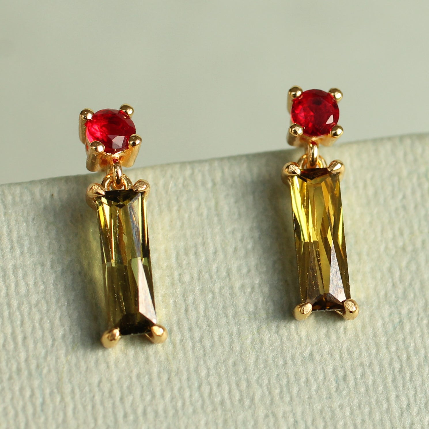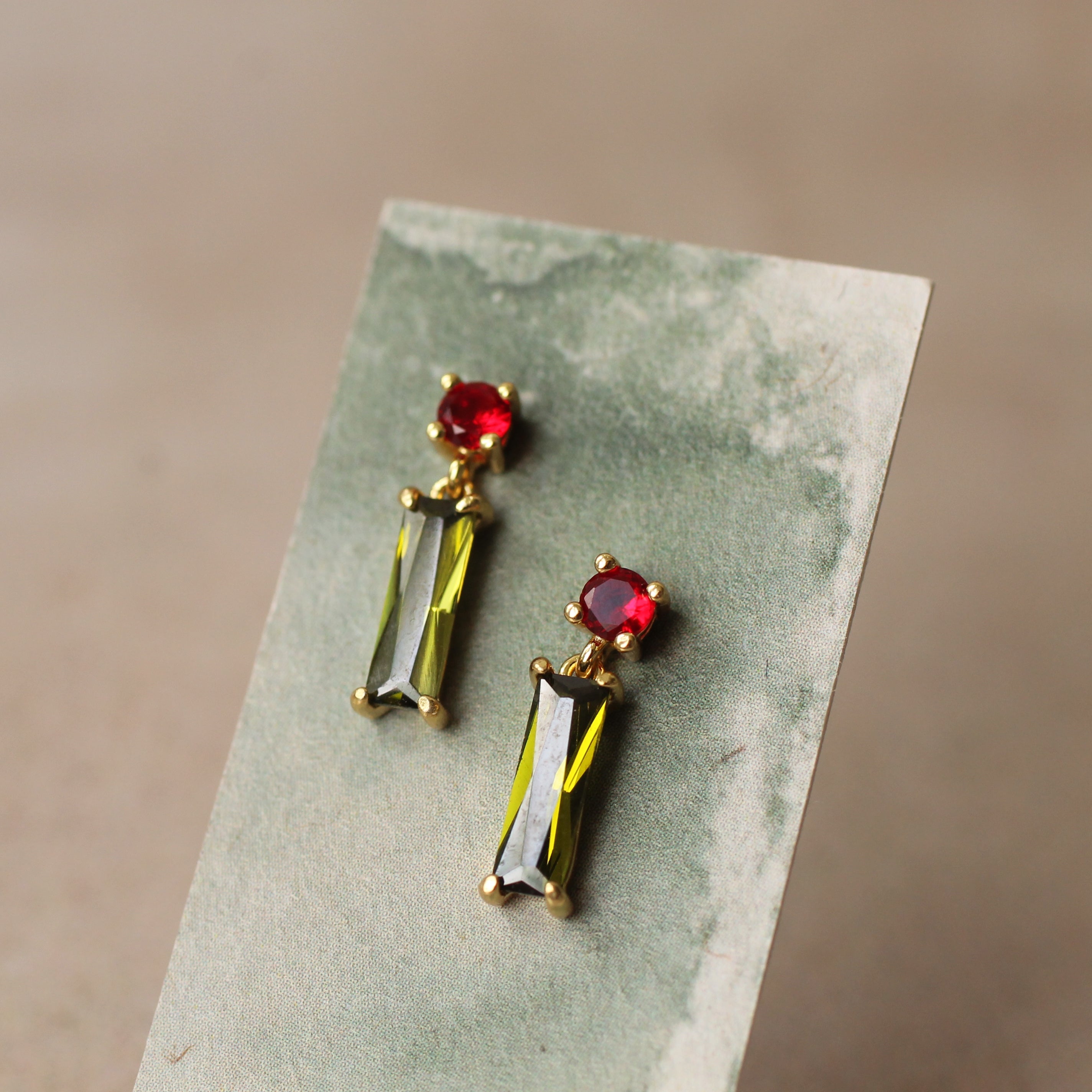 These great olive green and red mid century inspired earrings feature a simple, geometric design. The tiny olive green glass jewels are cut into perfect rectangles. The rectangular baguette cut stone is glass in a beautiful, warm toned olive green shade which looks beautiful with the bright tomato red accent jewel above it.