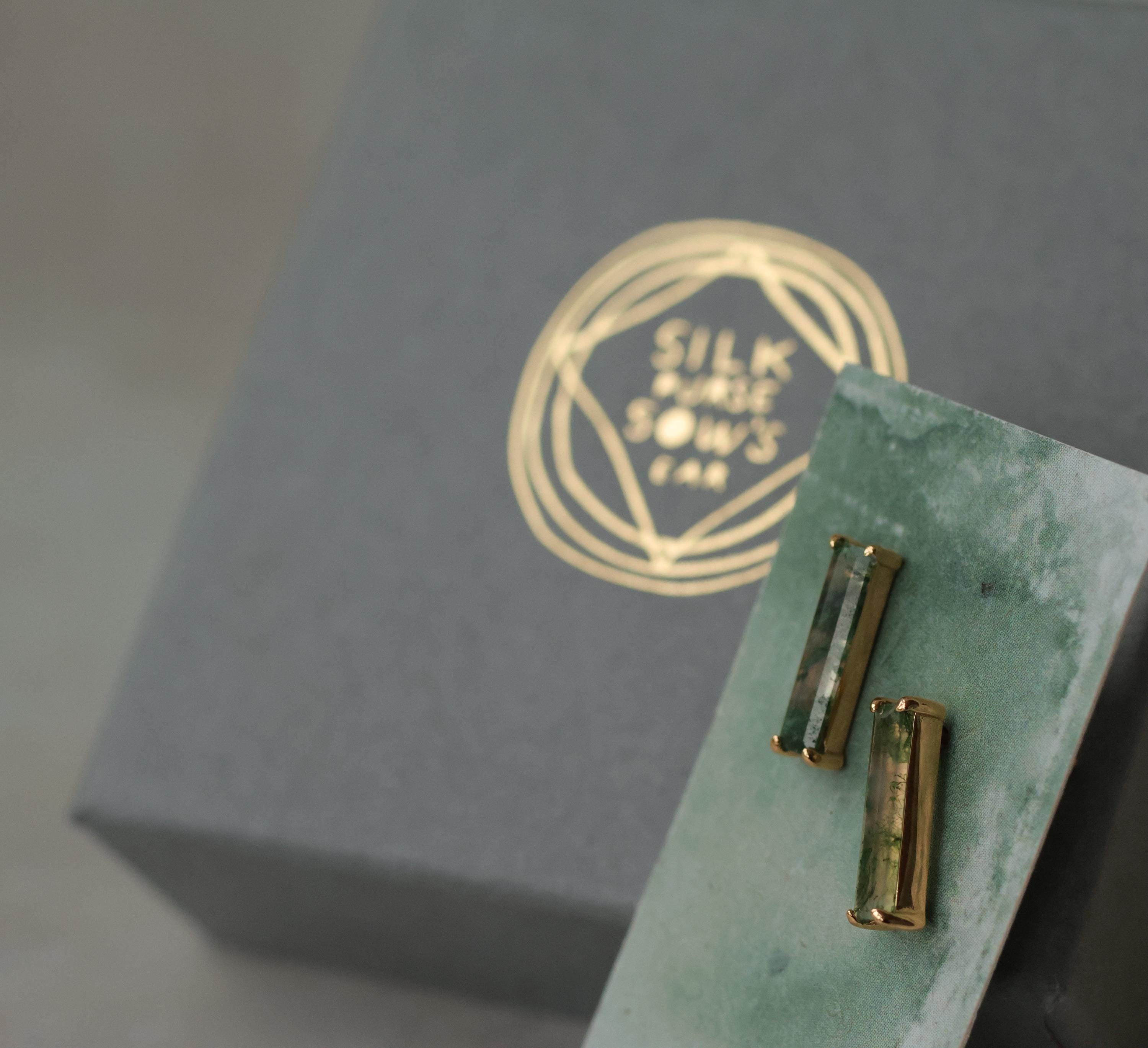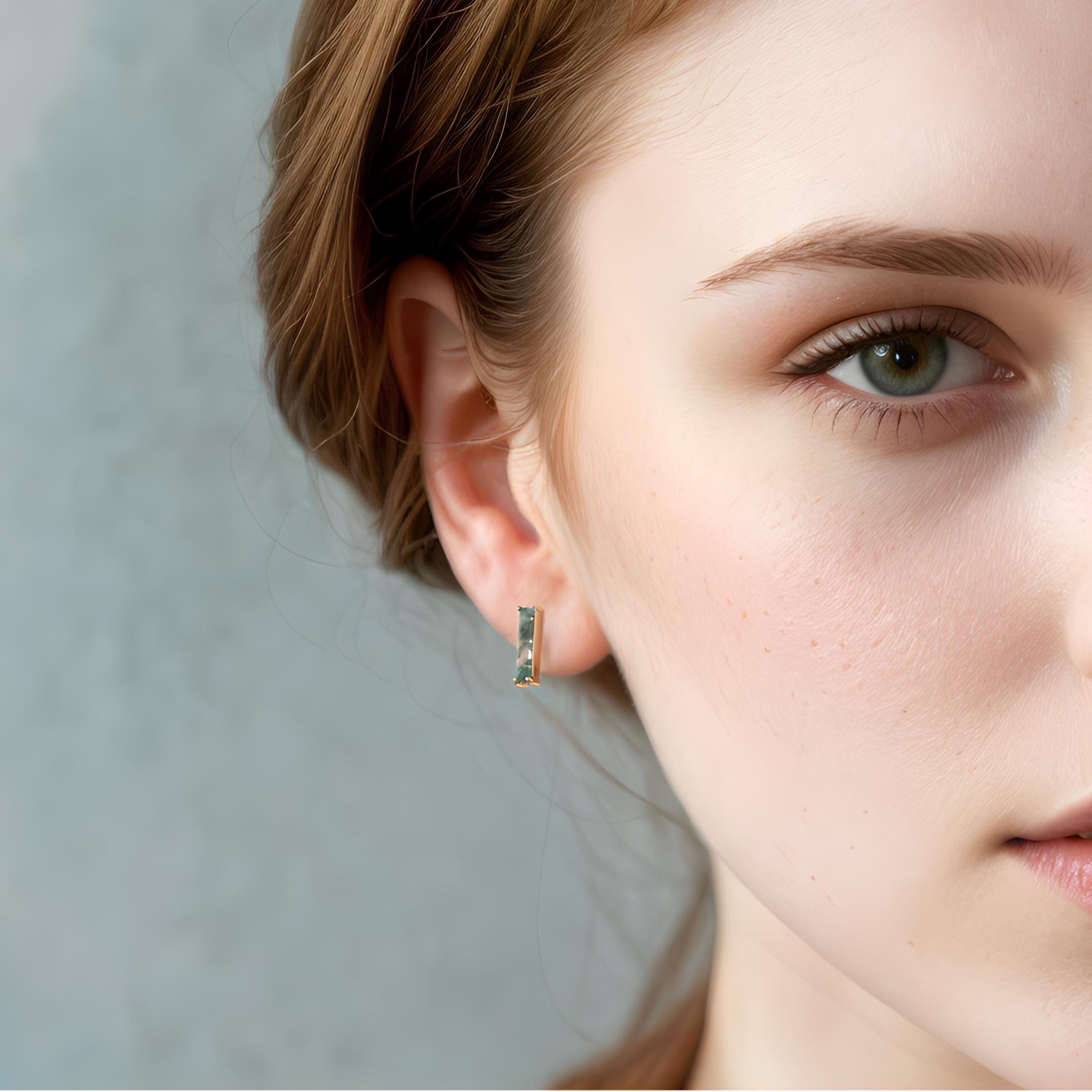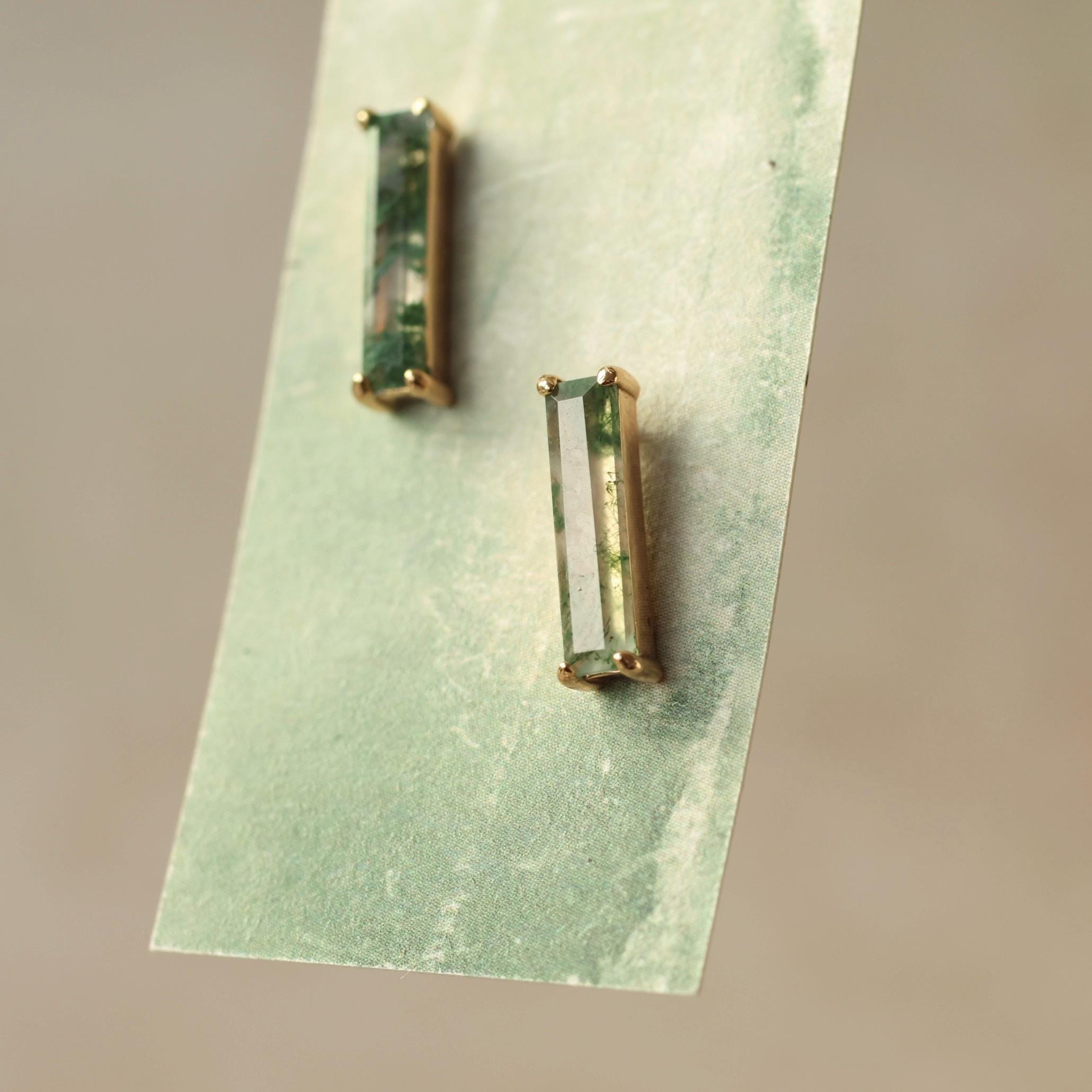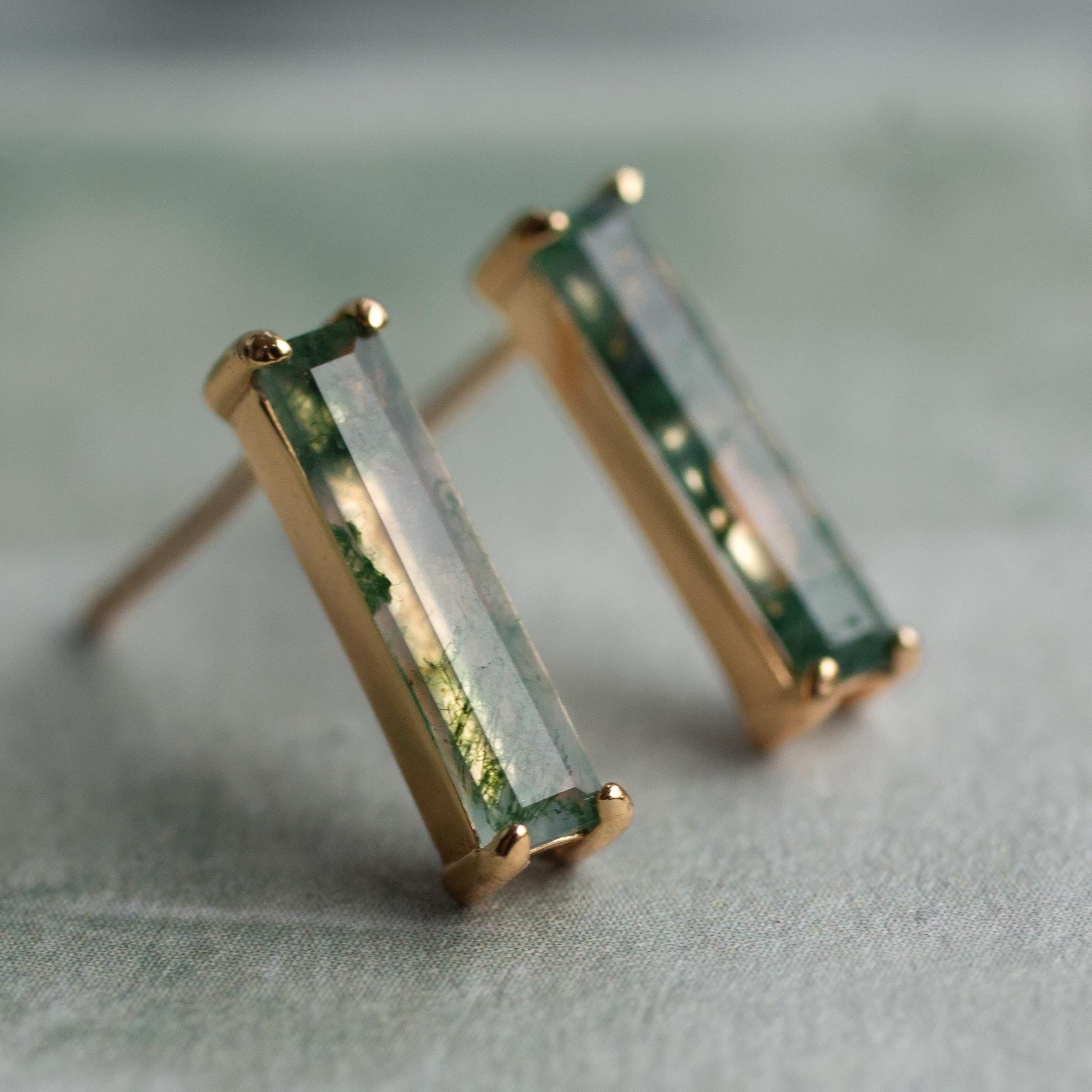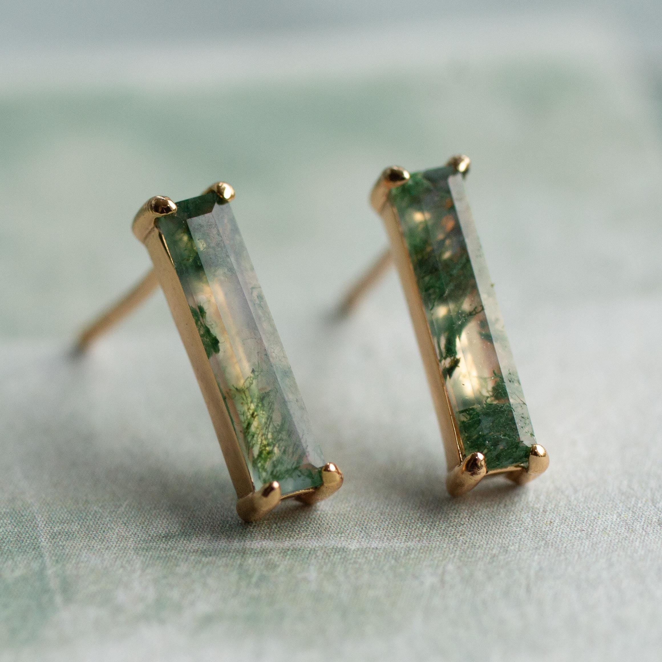 These beautiful real moss agate earrings feature a classic baguette, or rectangular cut agate stone. Inside are tiny fragments of moss, preserved in the gemstone. They are very beautiful and special. The earrings are made from Gold Vermeil (gold filled sterling silver). The earrings measure 16mm in length.