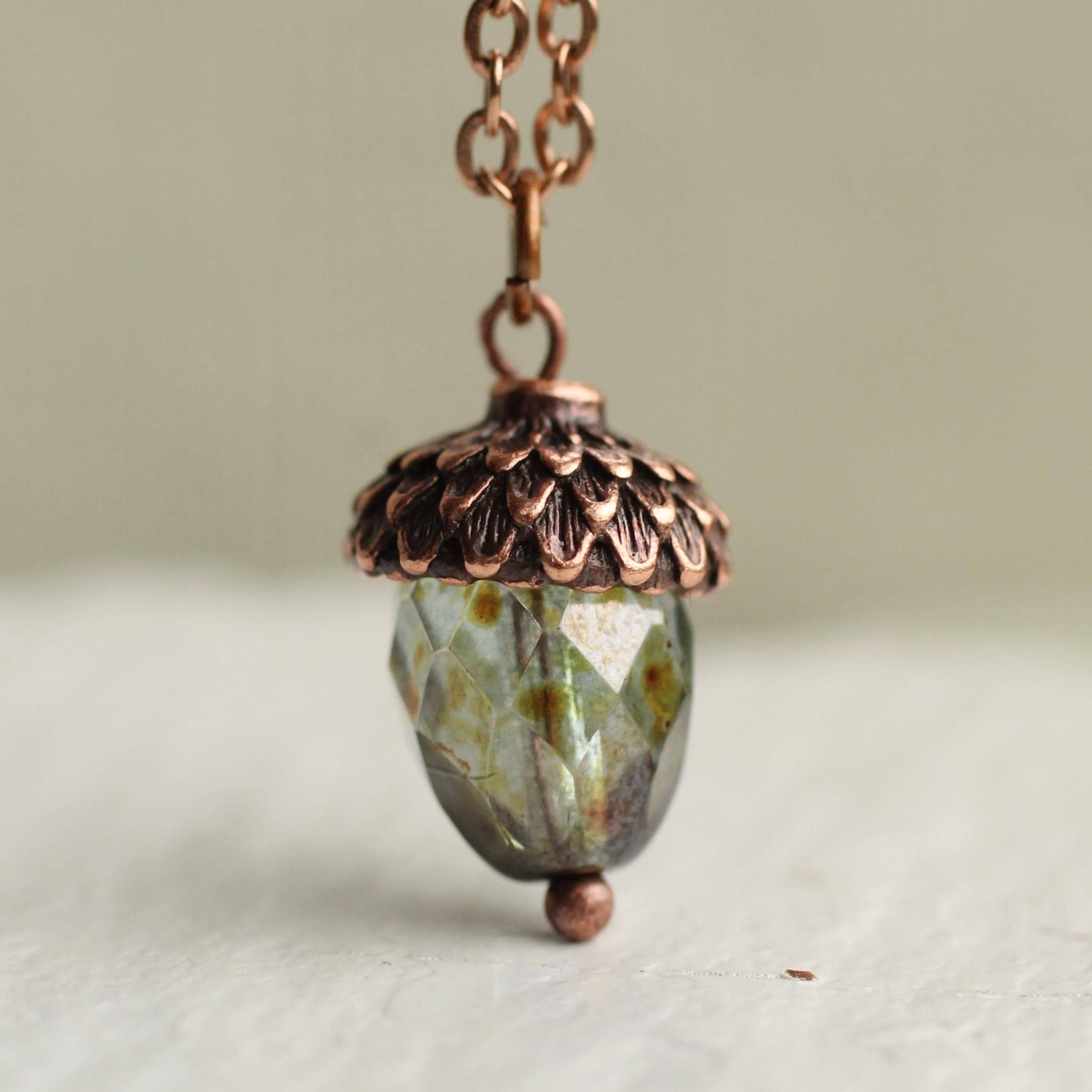 This beautiful, autumnal acorn necklace is made from a pure jade gemstone, in a warm olive green shade. We have combined the gemstone with an antique copper acorn cap, and the tones of the tarnished red copper with the rich olive green shades of the gemstone look great together.