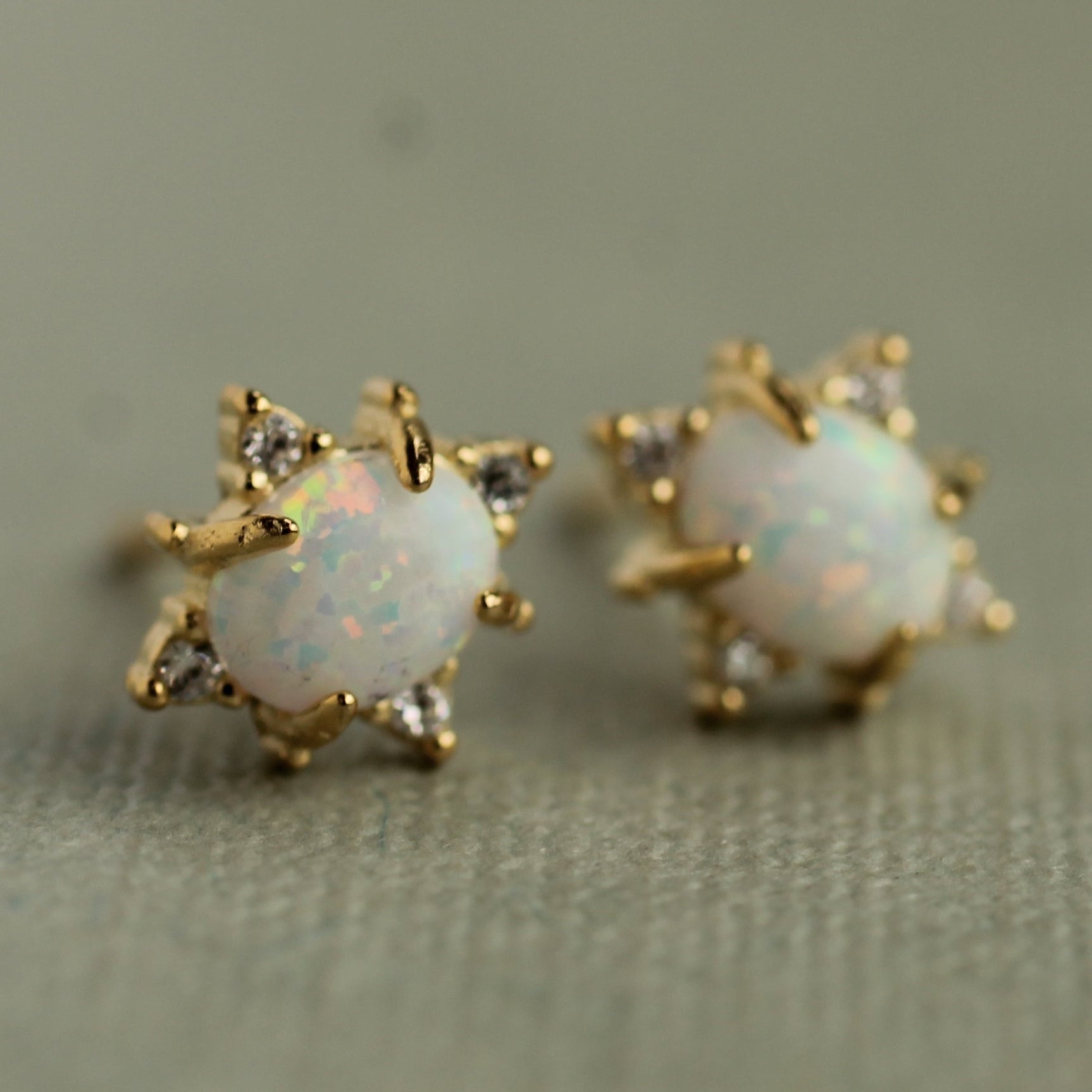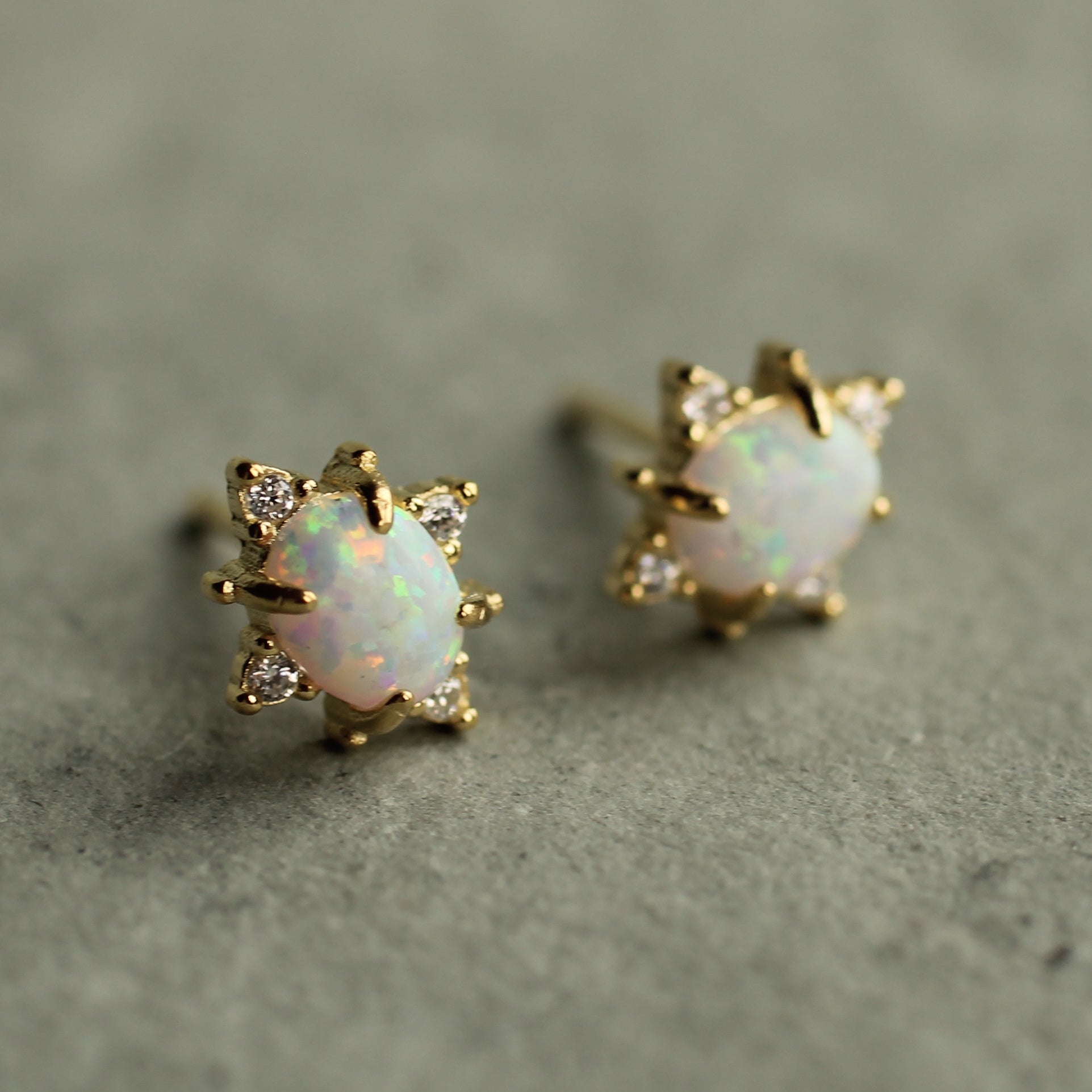 These precious, delicate opal stud earrings are made of white opals, set in gold plated sterling silver. They have an amazing glowing quality and when they catch the light, flecks of gold and turquoise light up from within. They are really beautiful and unusual.