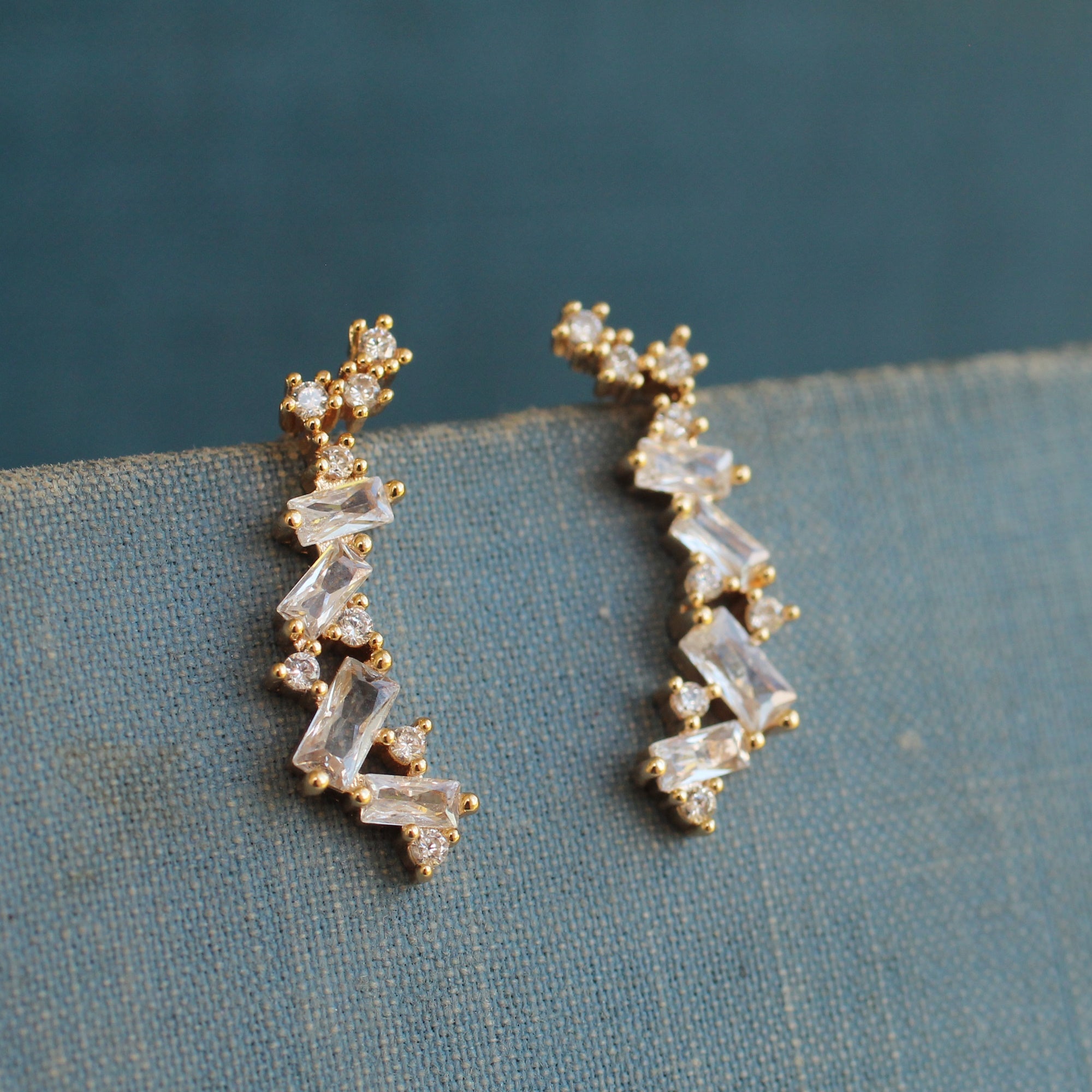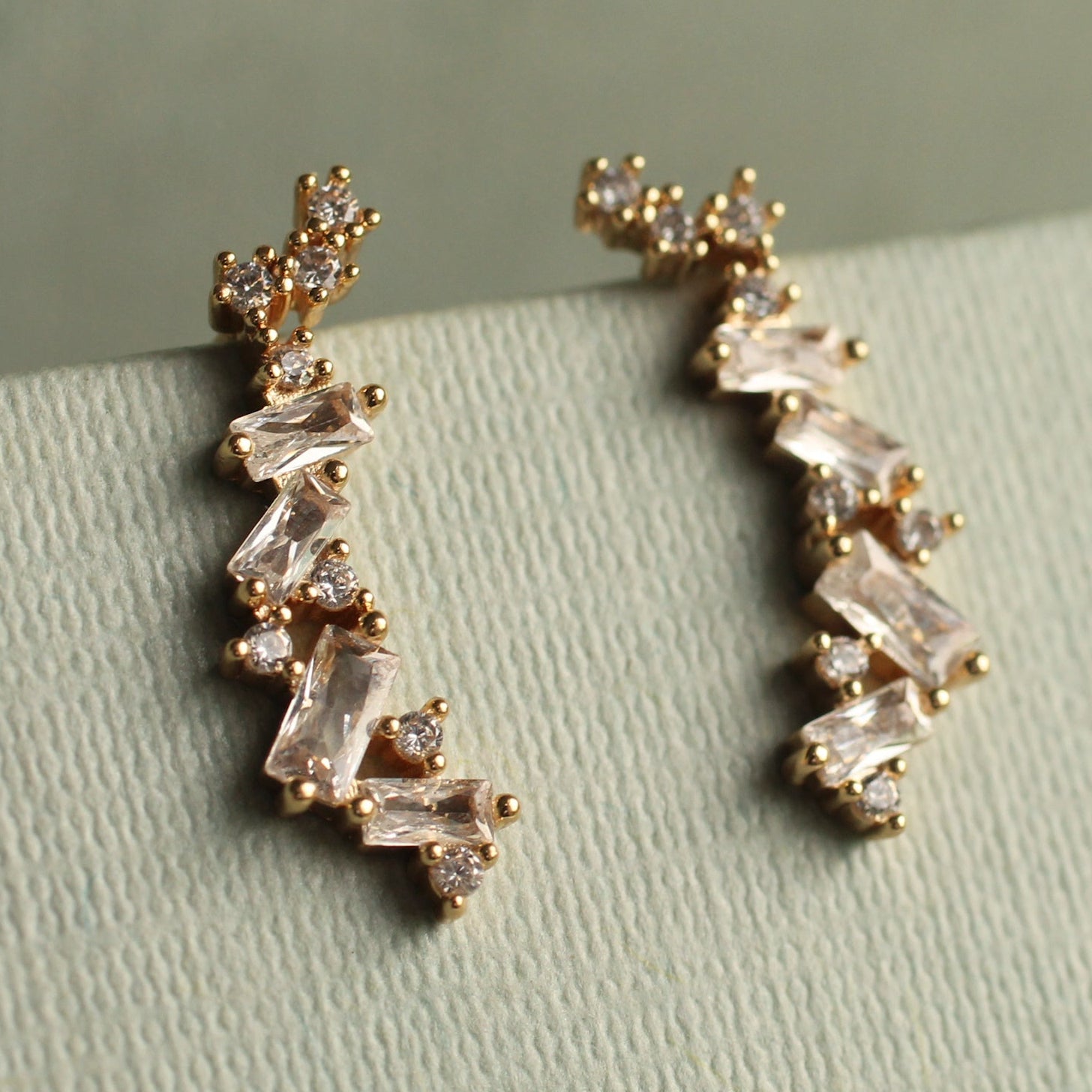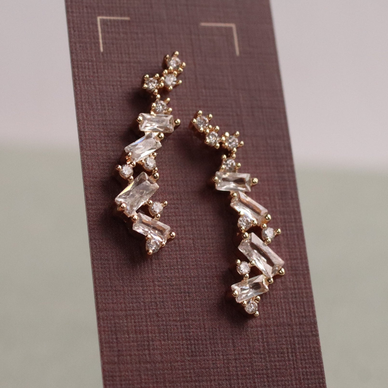 These earrings feature a formation of baguette cut, geometric cubic zirconia stones to make a beautiful starburst design.