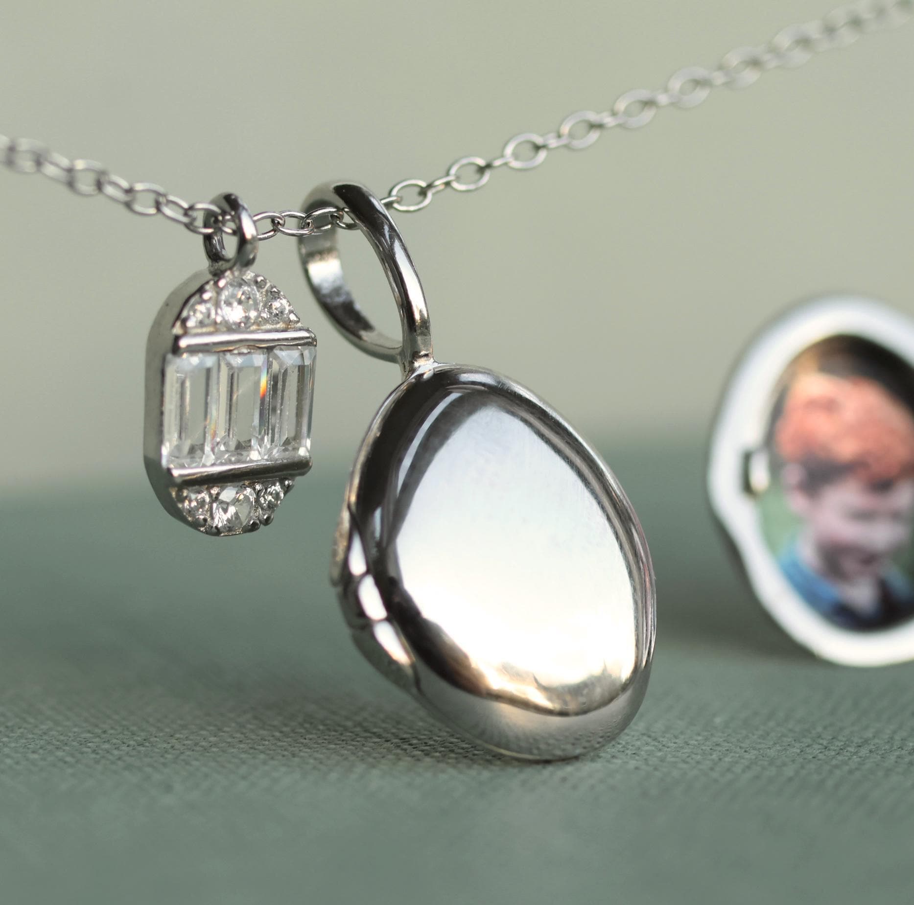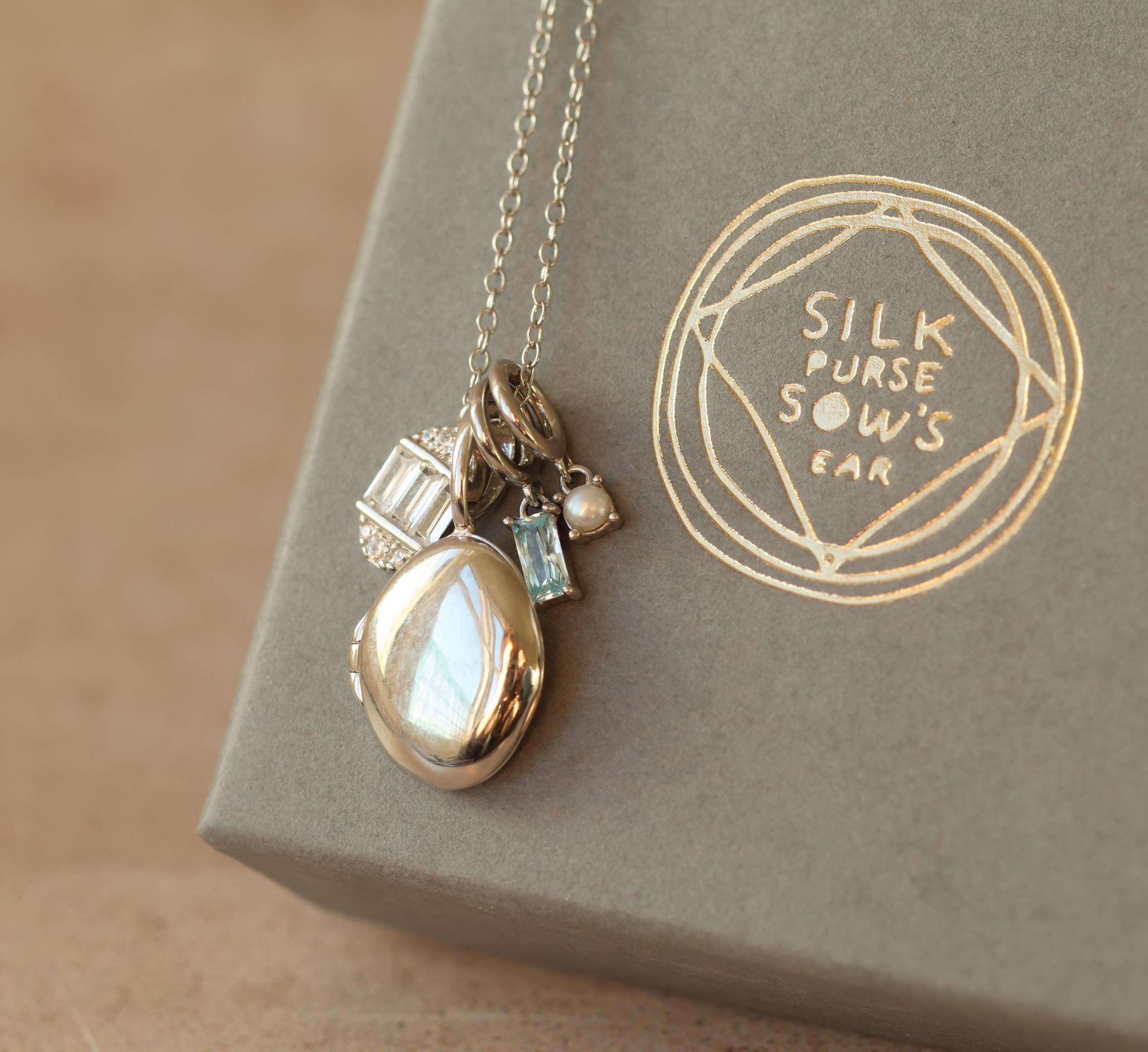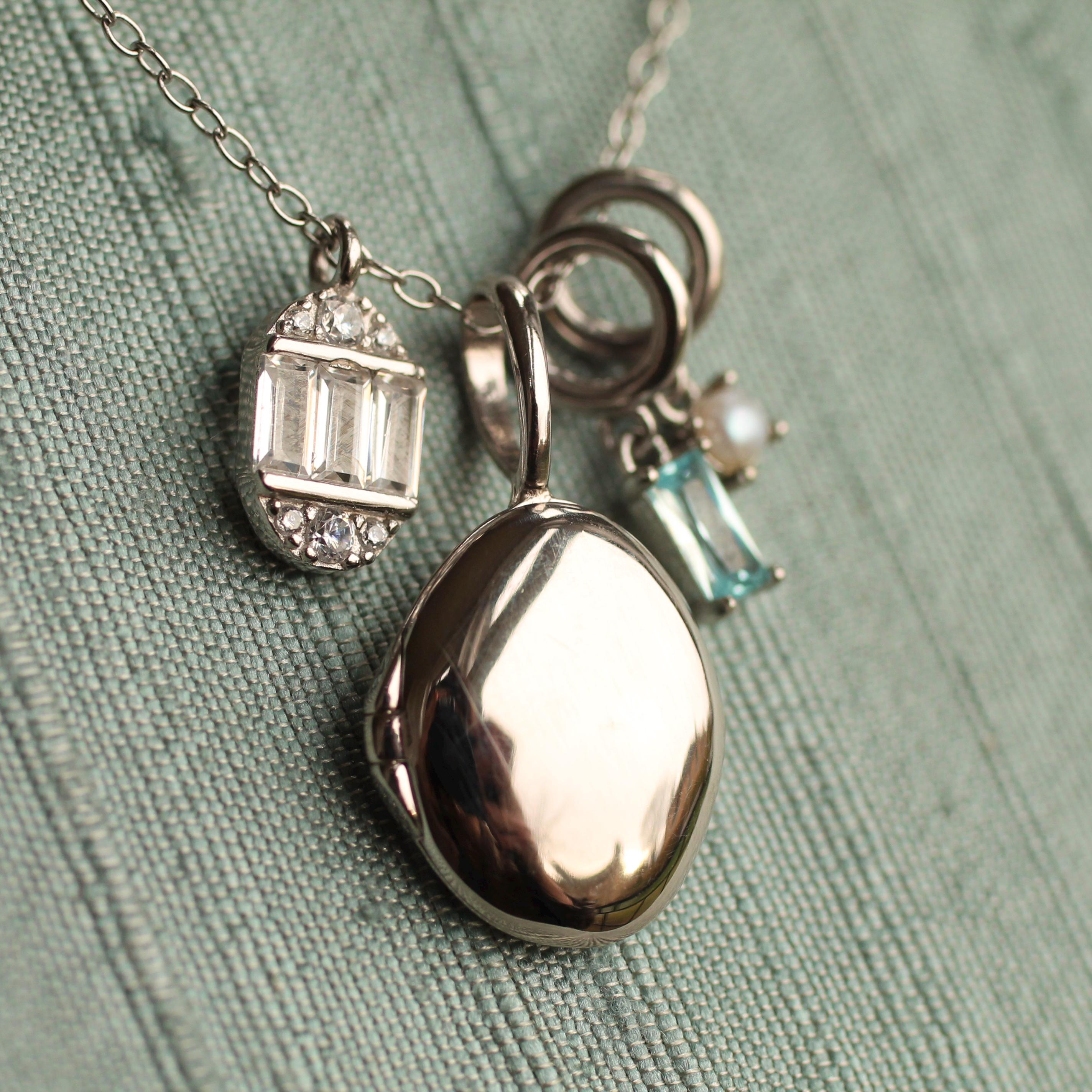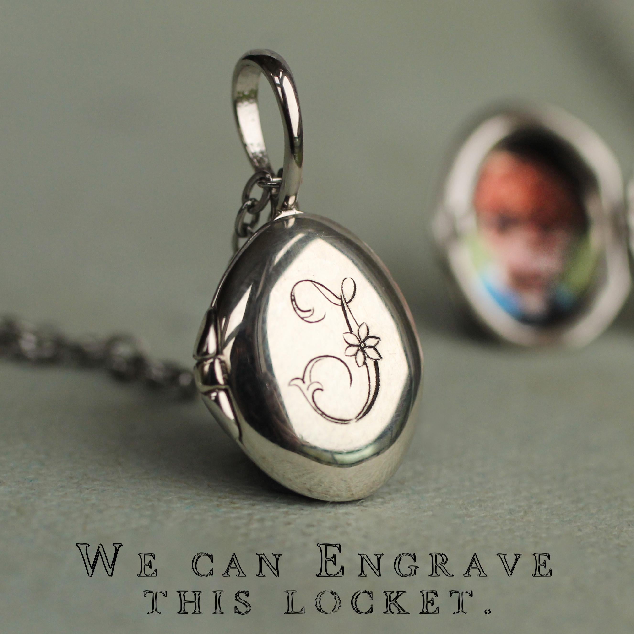 This personalized charm locket features a sweet combination of an art deco oval charm, which hangs alongside a sterling silver miniature oval locket. The charm reminds us of a tiny and precious faberge egg!