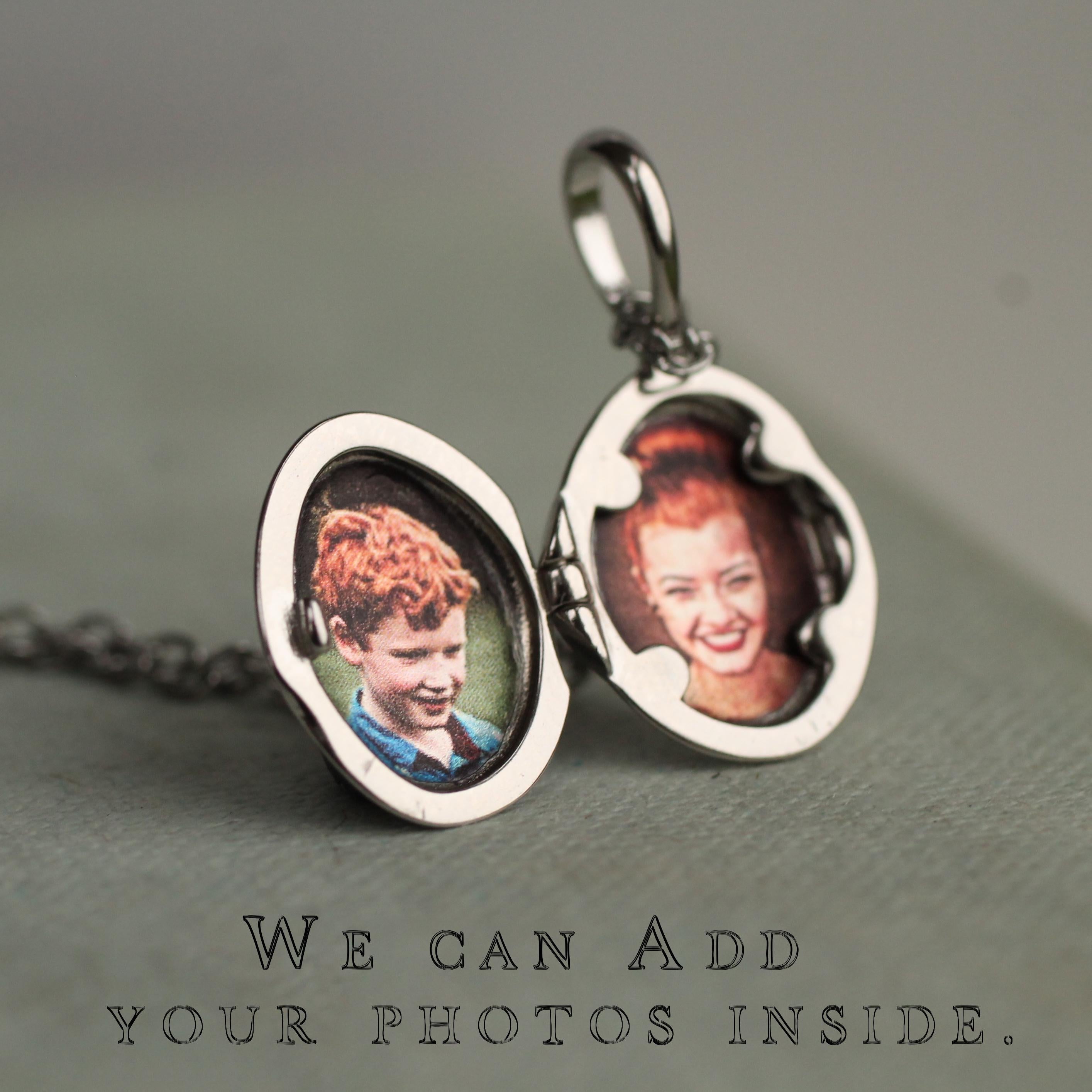 The locket, charms and chain are made from sterling silver. The locket and charms are a beautifully dainty size, measuring 14mm. The chain is adjustable and can be worn from 16" - 18" long. Please refer to our illustration for a better idea of how these might look when worn.