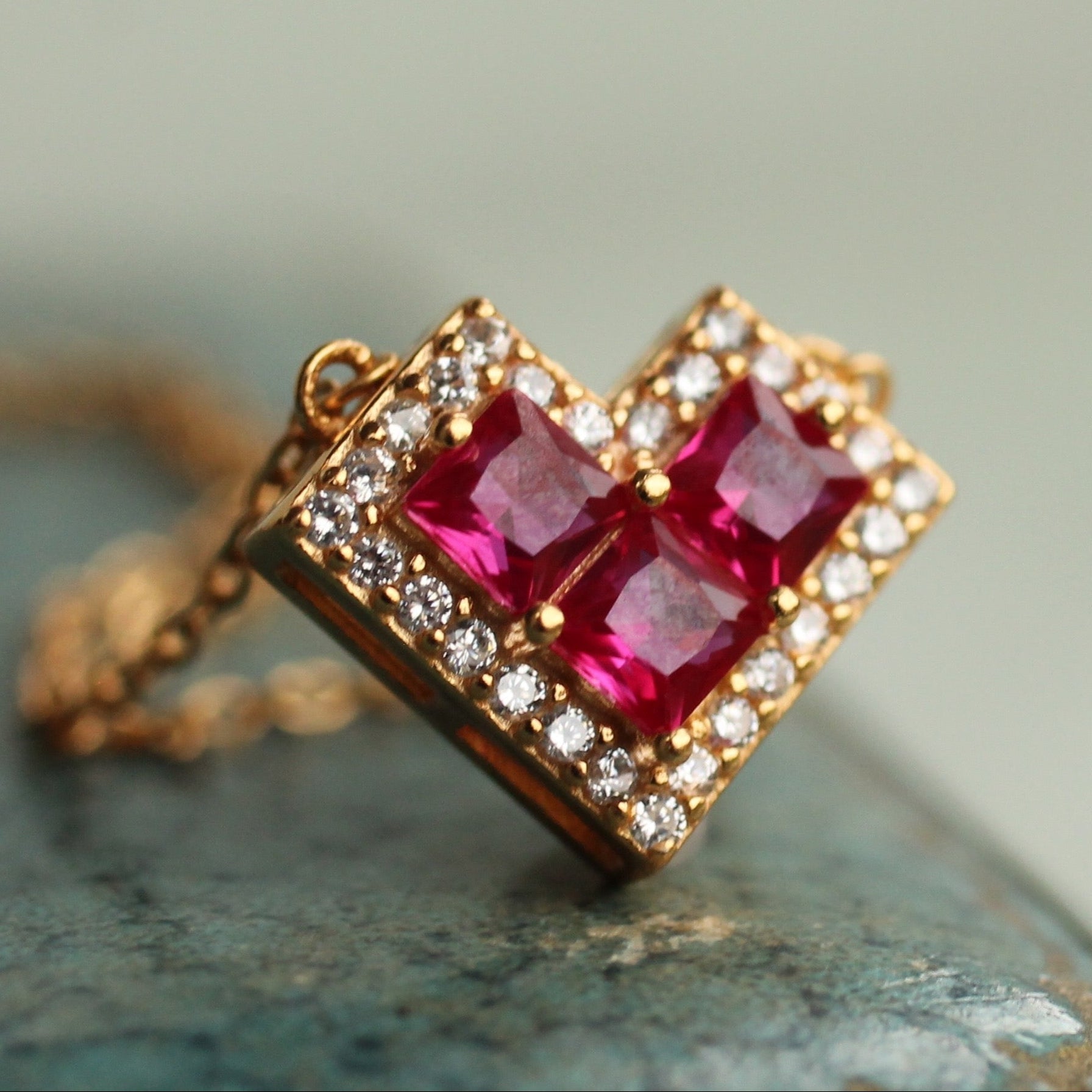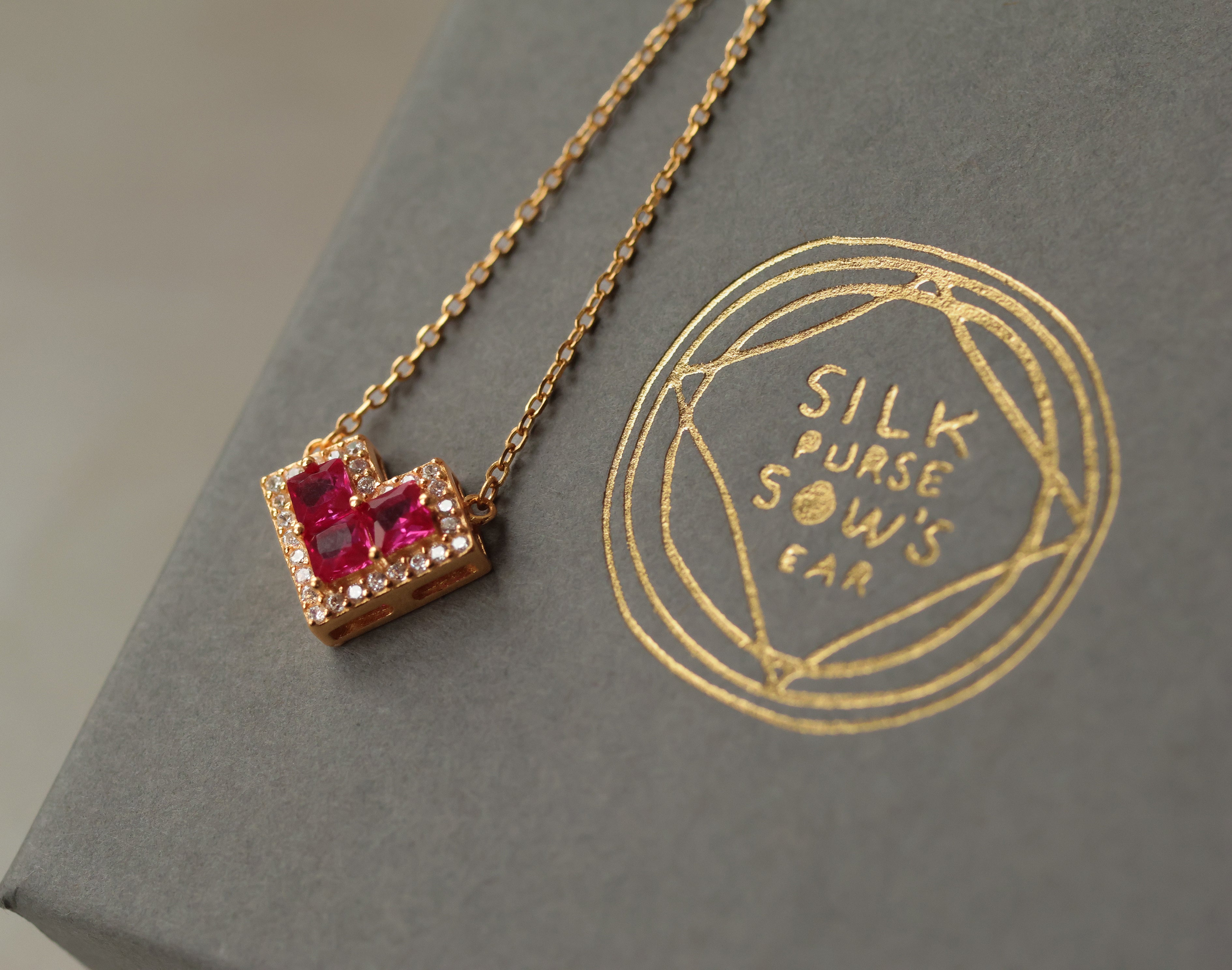This sweet jewel necklace features a trio of geometric, square cut jewels in a deep red-pink raspberry shade to form a geometric heart. The heart is framed with a row of tiny crystals.