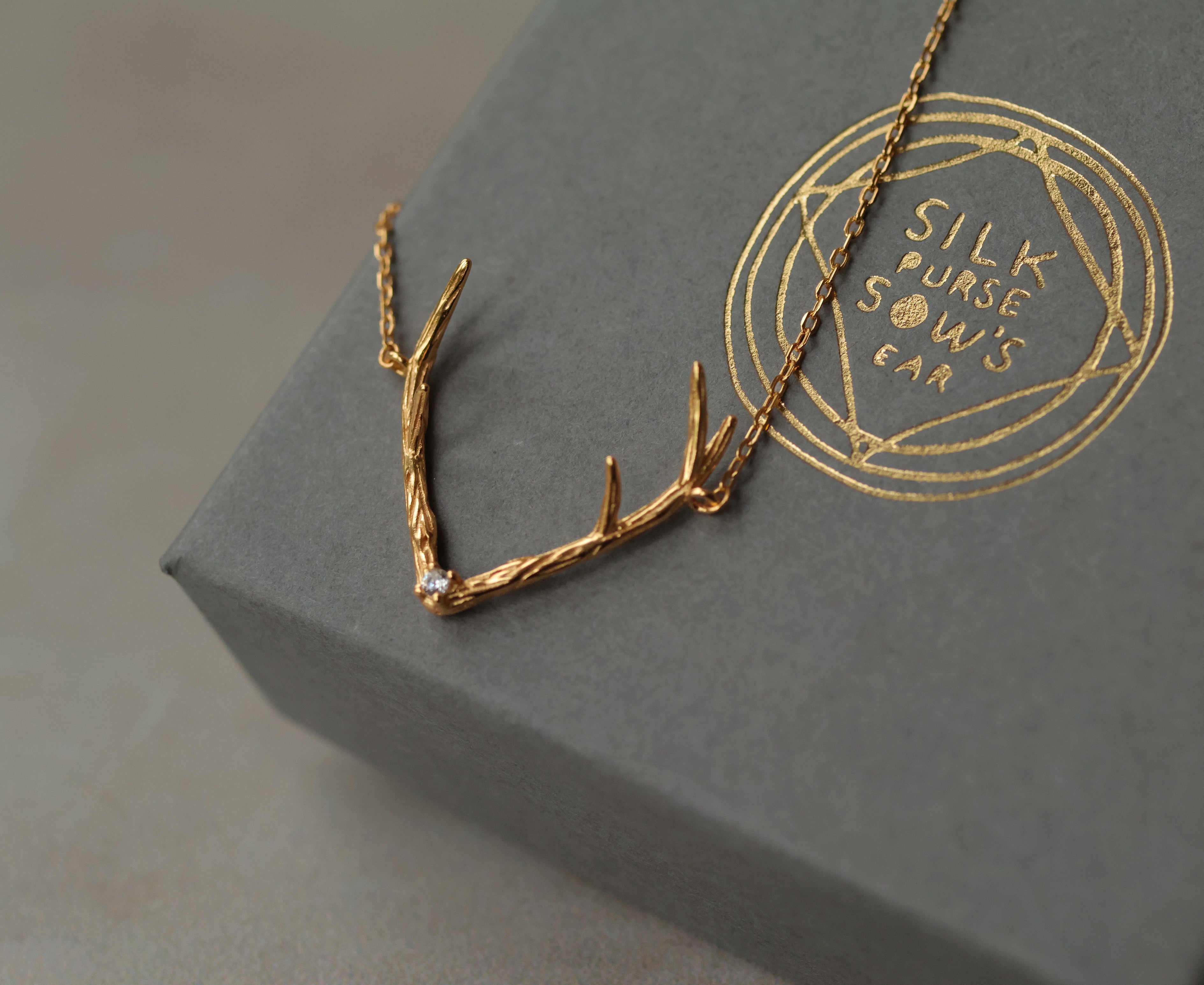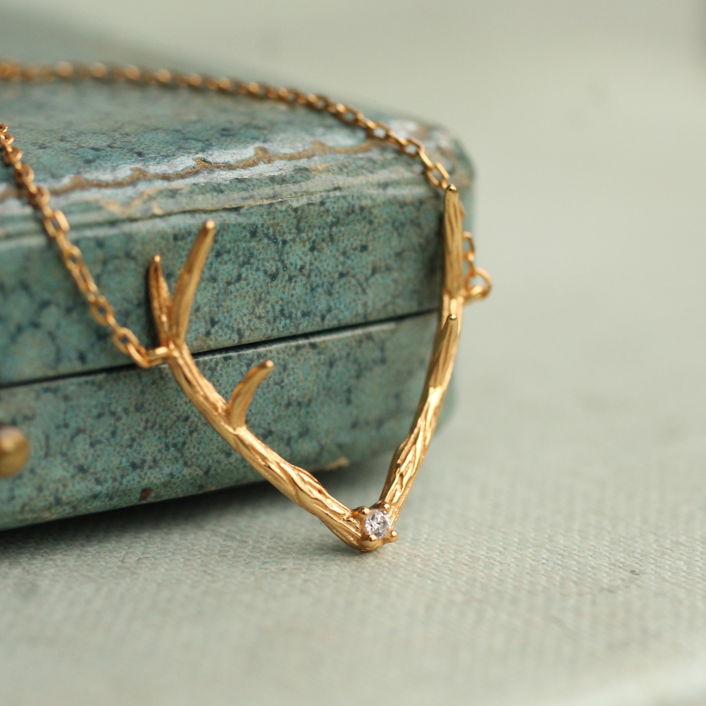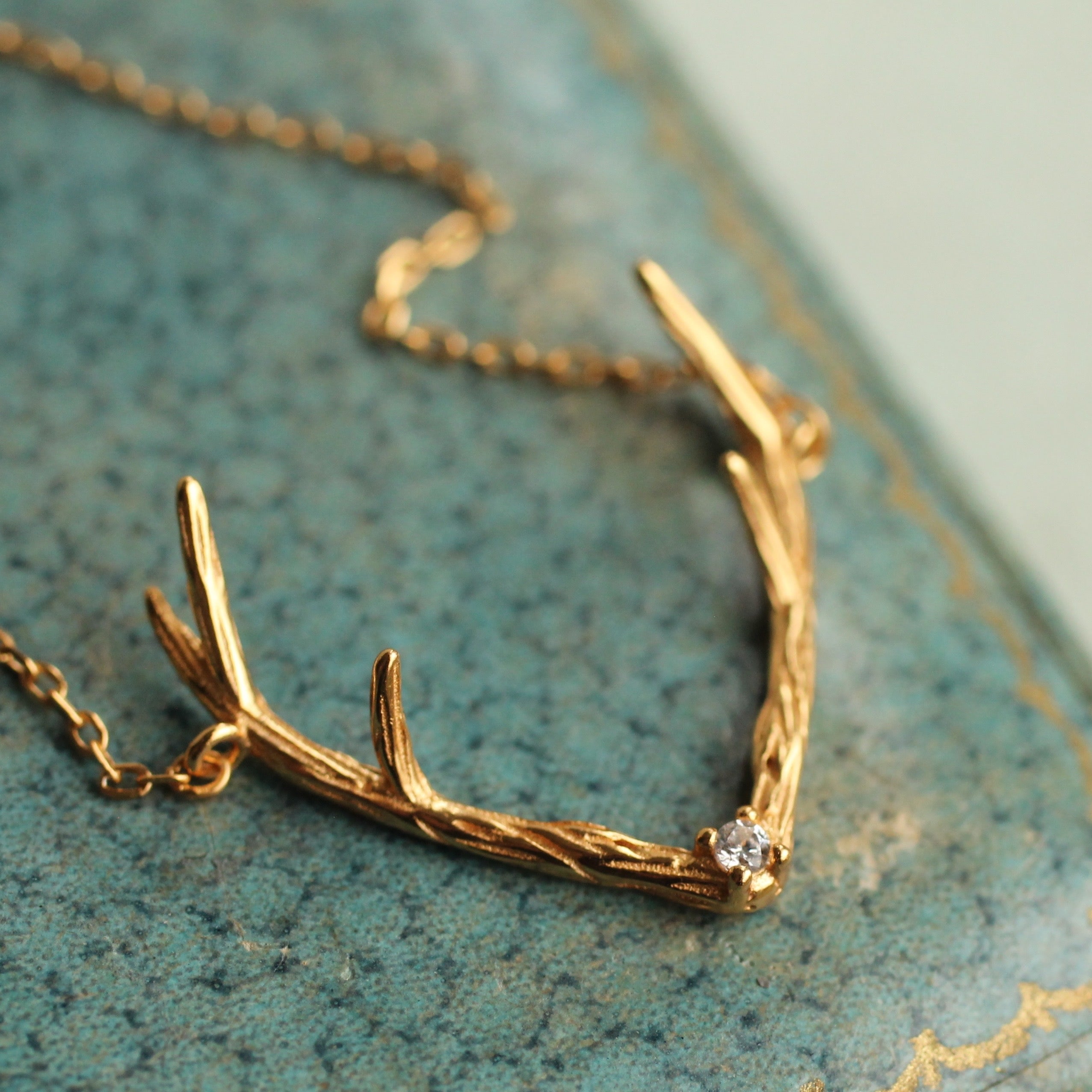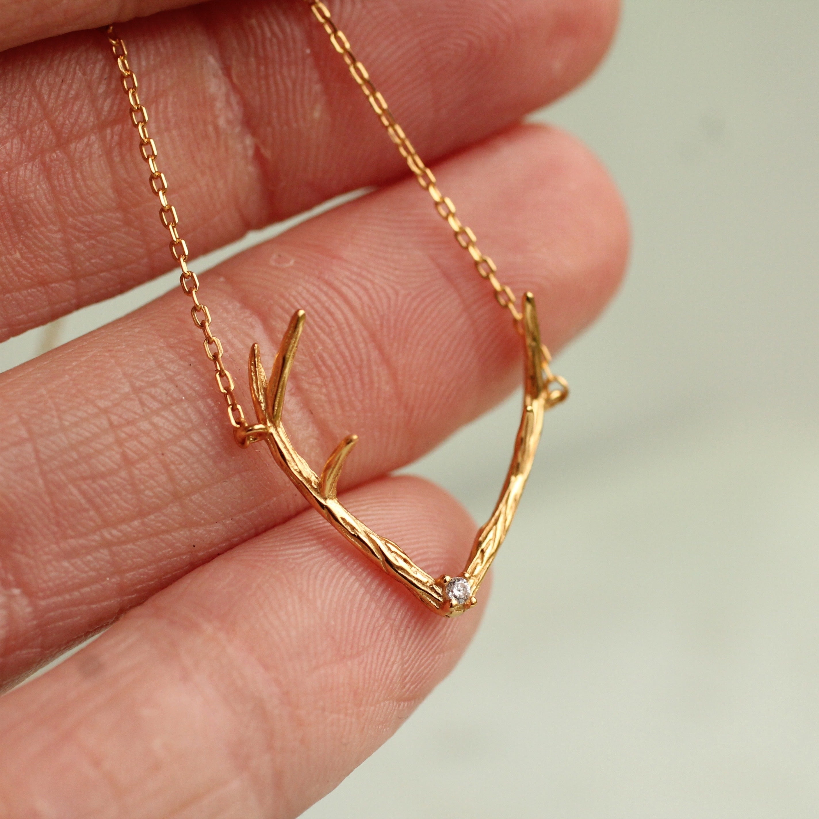 This sweet and delicate necklace features a deer antler design, with a single jewel set into the centre. The pendant is made from gold plated sterling silver (vermeil).