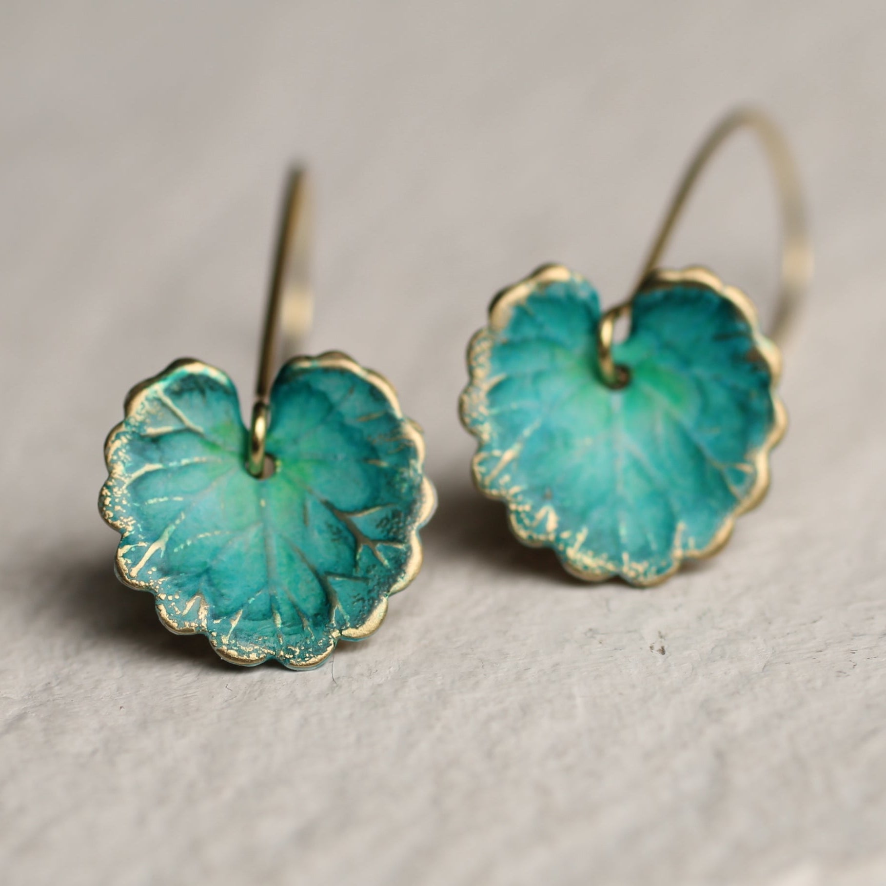 These leaf earrings are brass charms with some amazing detail, which have been carefully treated, painted and varnished to bring out beautiful tones and depth of colour! They look like beautiful watercoloured lily pads!