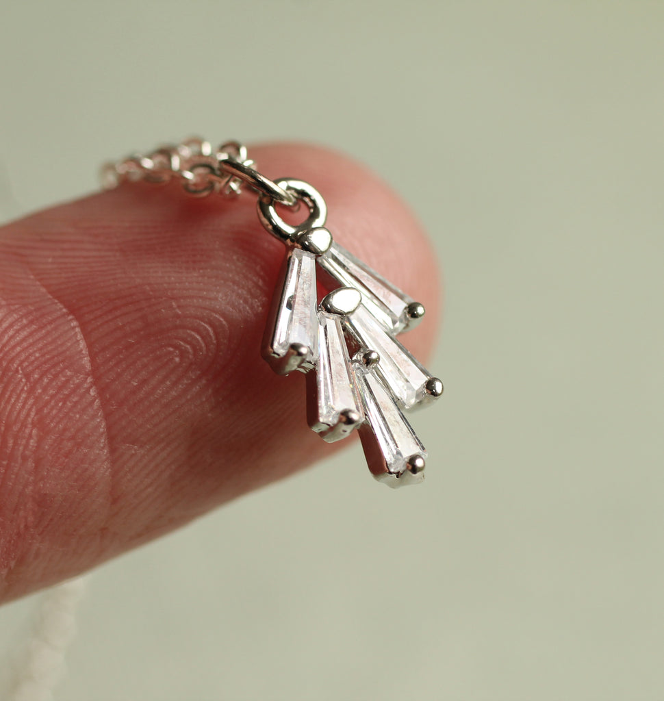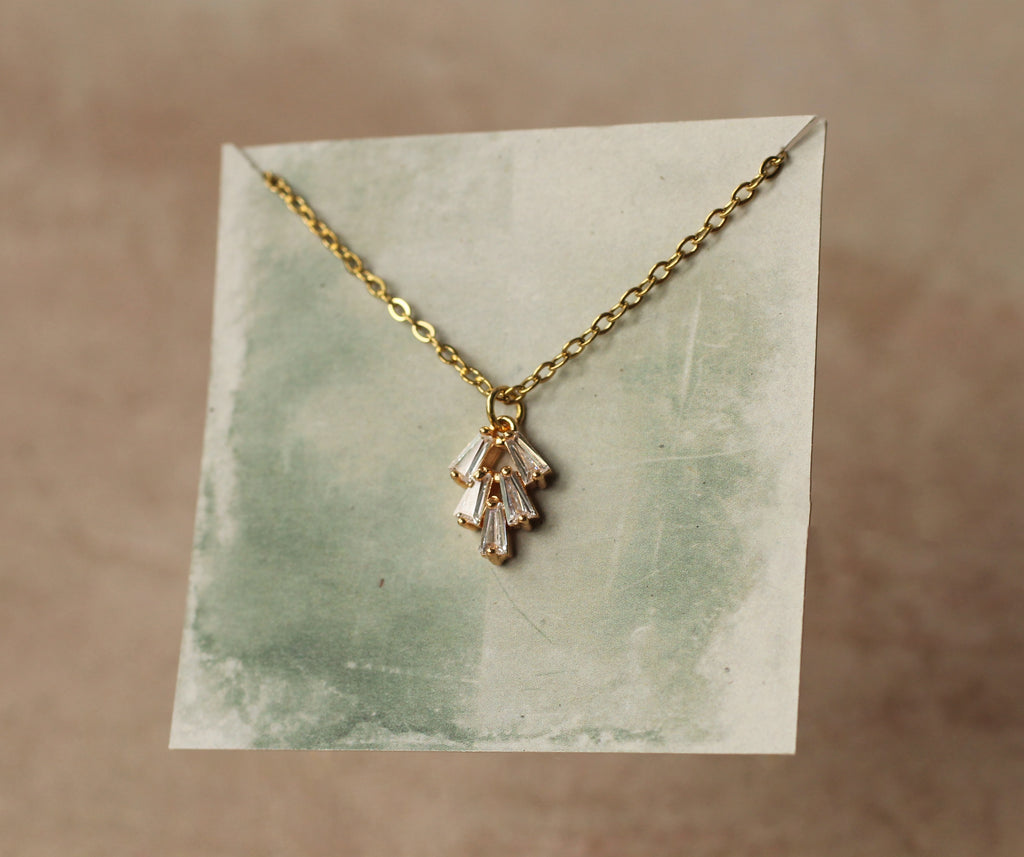 This beautifully delicate necklace is made with gold plated brass and features a graduated art deco design. The tiny cubic zirconia jewels are cut into perfect rectangles. They remind us of classic Deco architecture, like the Chrysler building!