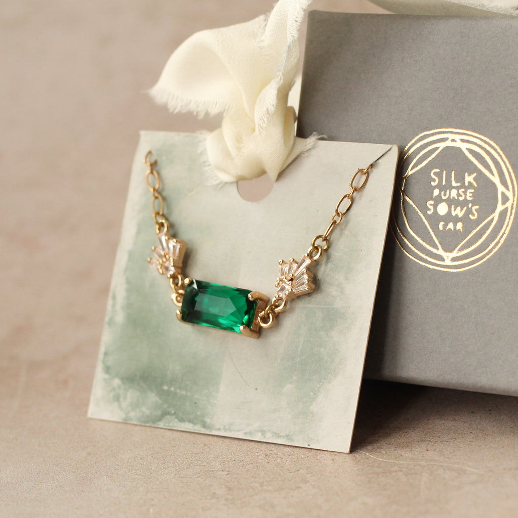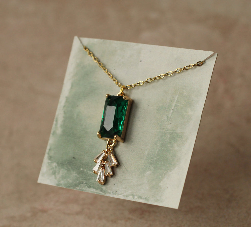 This beautiful, classical necklace is made with crystal and gold plated brass, and feature a graduated art deco design. The tiny cubic zirconia jewels are cut into perfect rectangles to form a geometric fan shape. They remind us of classic Deco architecture, like the Chrysler building! The rectangular baguette cut stone is glass in a beautiful, cool toned emerald green shade.