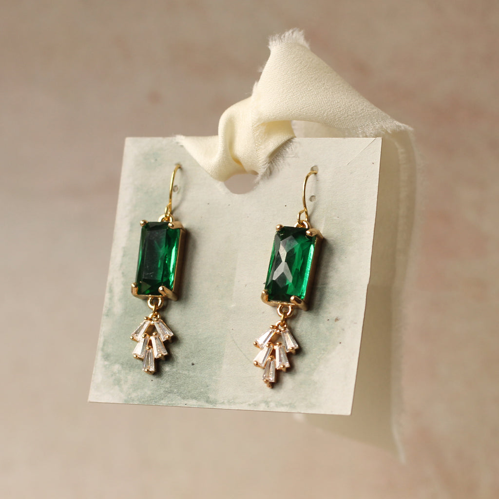 This beautiful, classical necklace is made with crystal and gold plated brass, and feature a graduated art deco design. The tiny cubic zirconia jewels are cut into perfect rectangles to form a geometric fan shape. They remind us of classic Deco architecture, like the Chrysler building! The rectangular baguette cut stone is glass in a beautiful, cool toned emerald green shade.