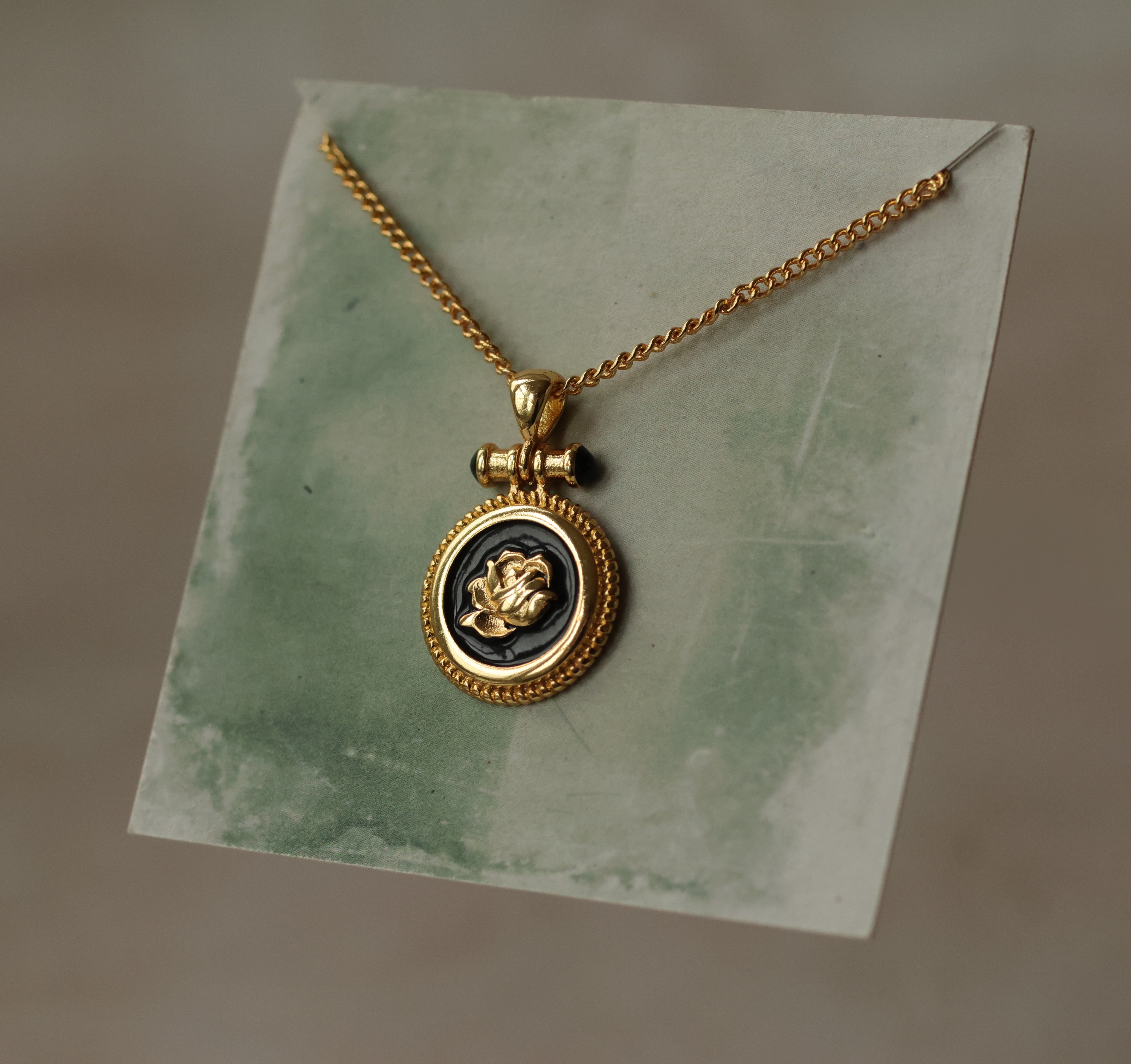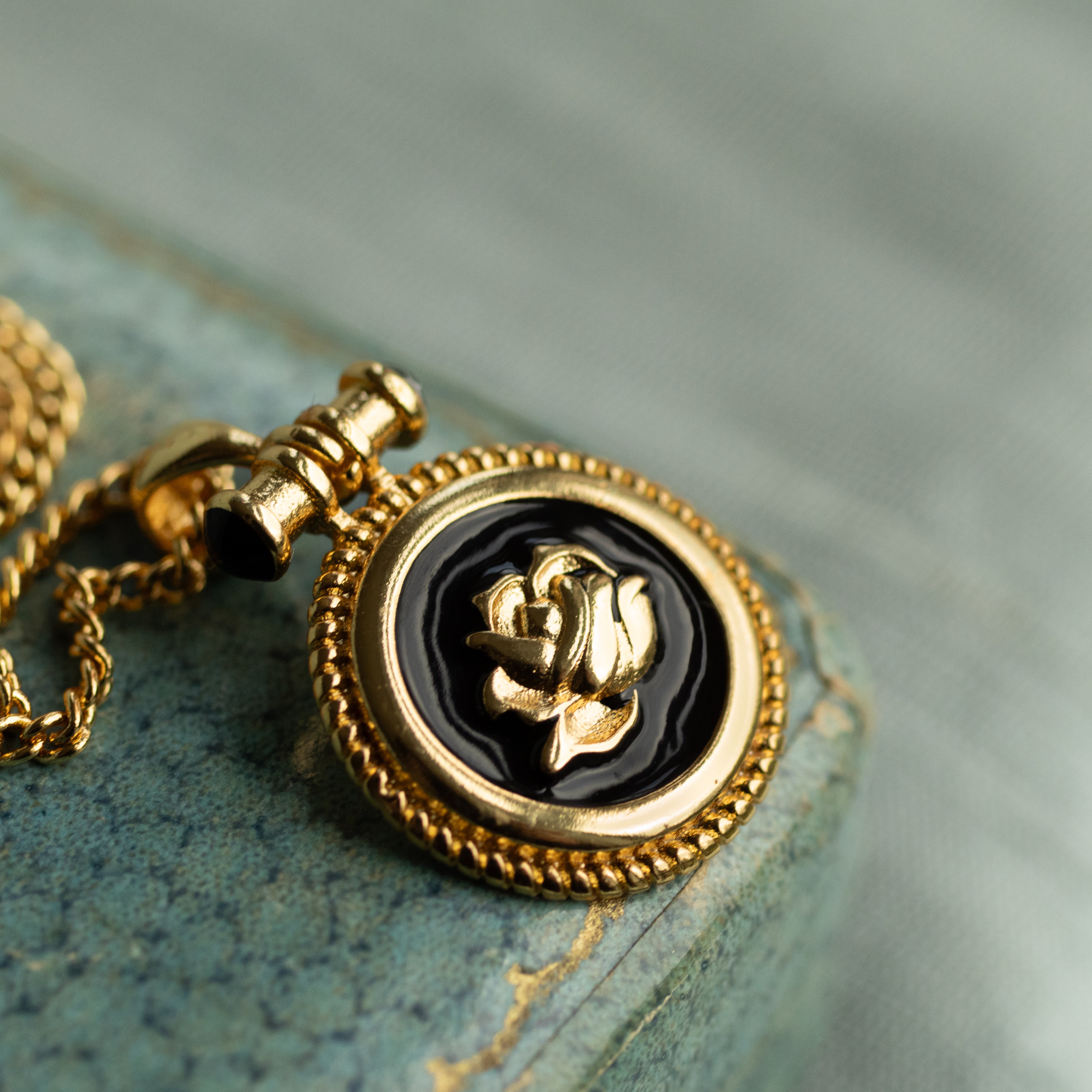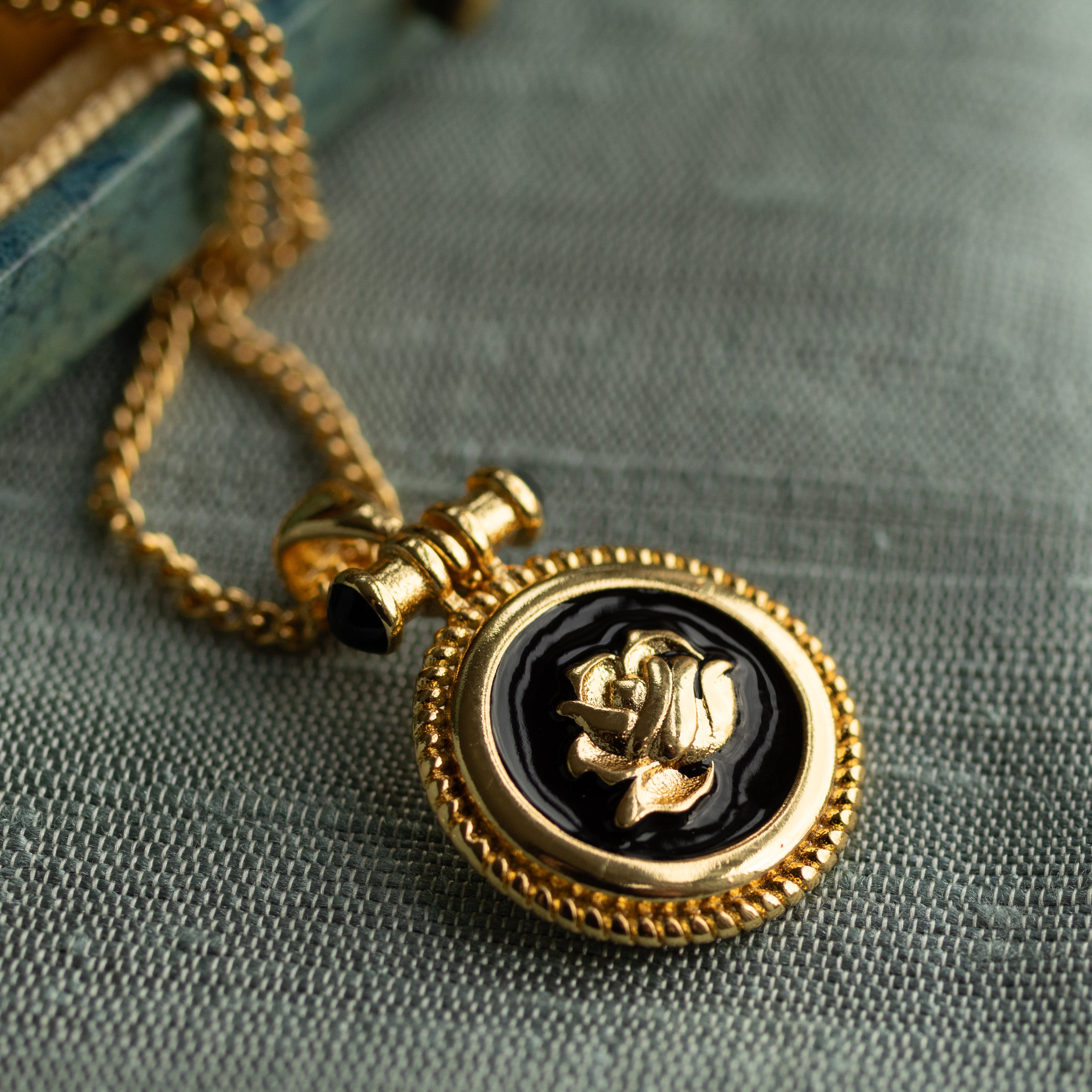 This vintage gold necklace features a rose medallion, with glossy black enamel. The necklace is plated with 24ct gold for a rich, deep yellow colour.