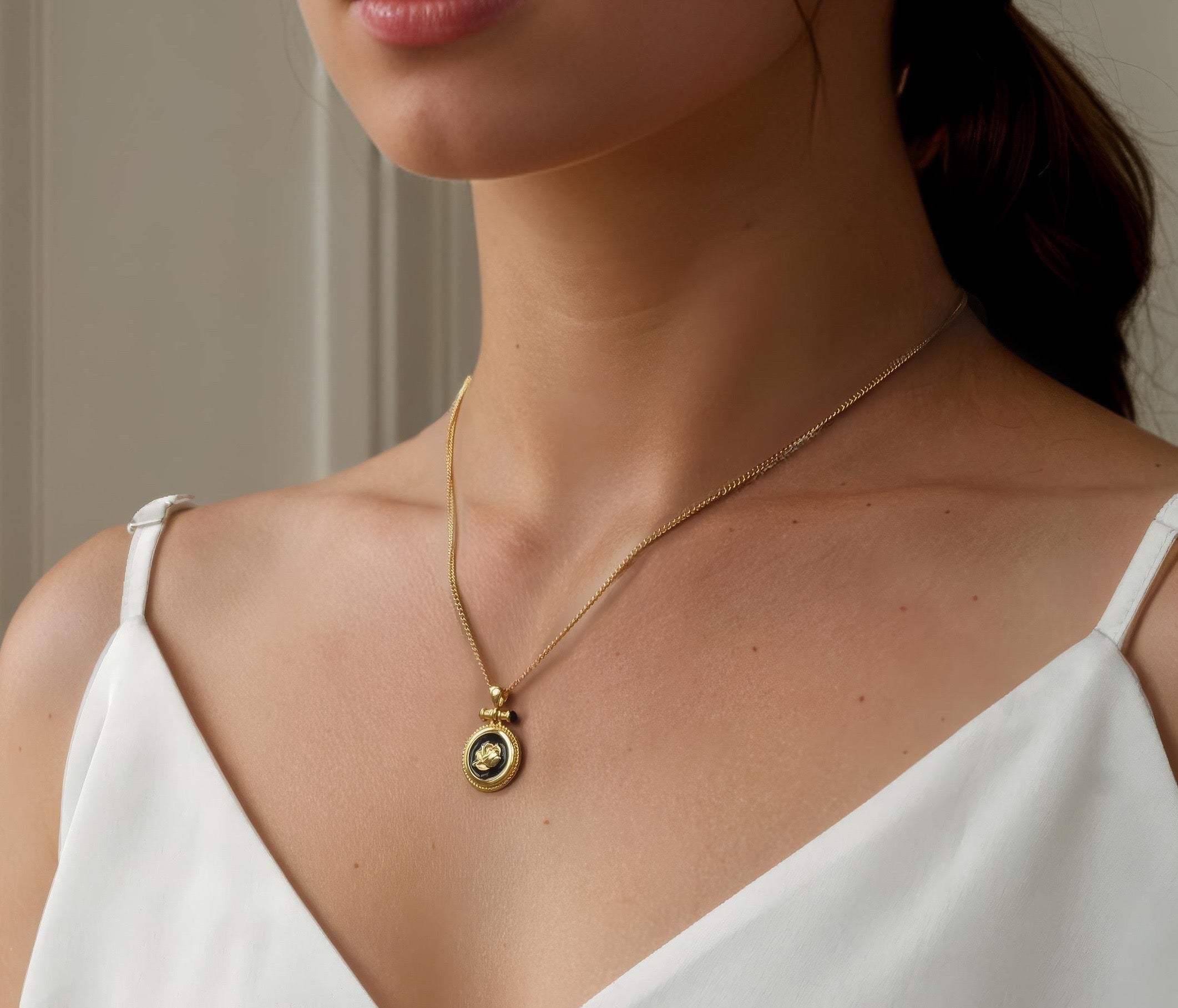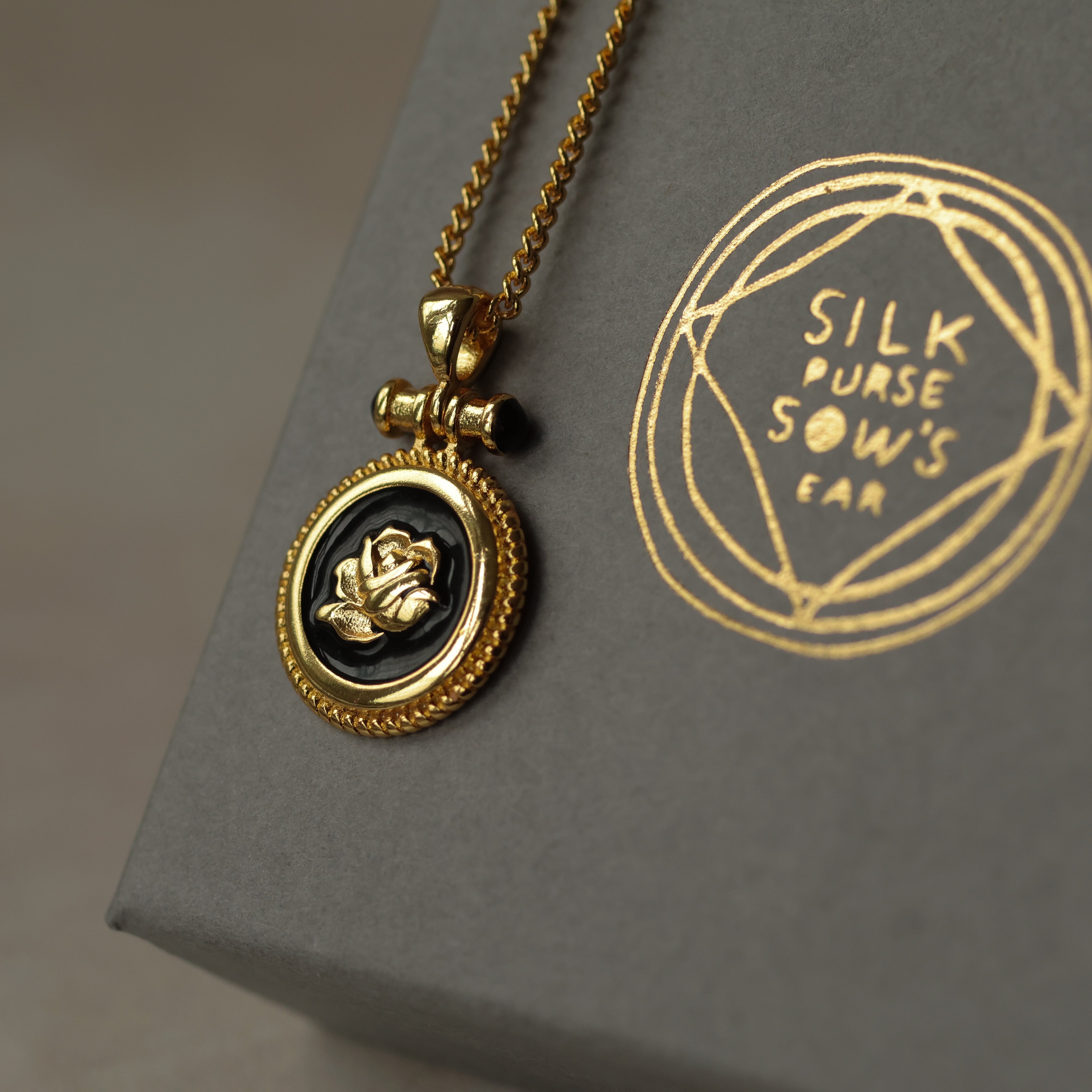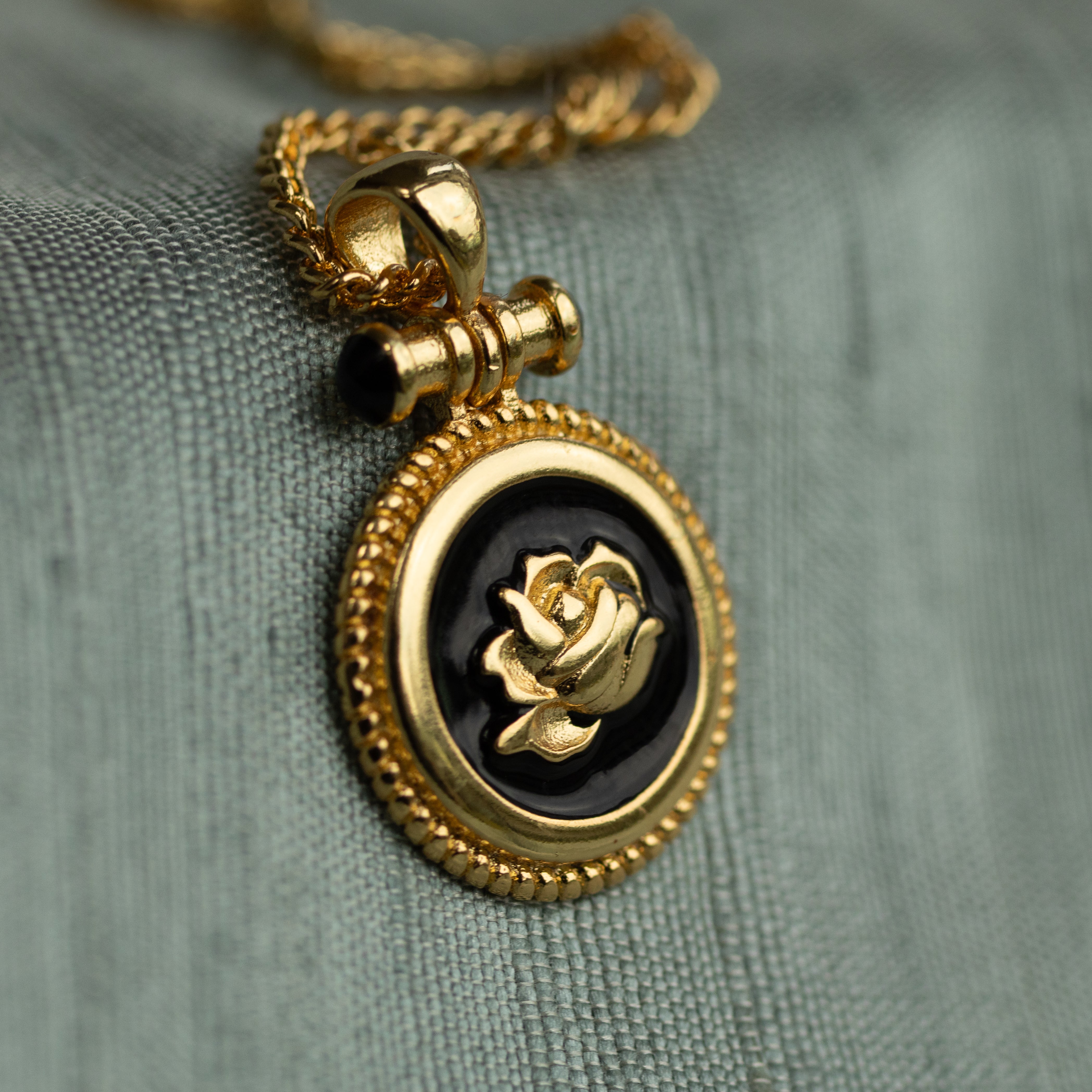 This vintage gold necklace features a rose medallion, with glossy black enamel. The necklace is plated with 24ct gold for a rich, deep yellow colour.