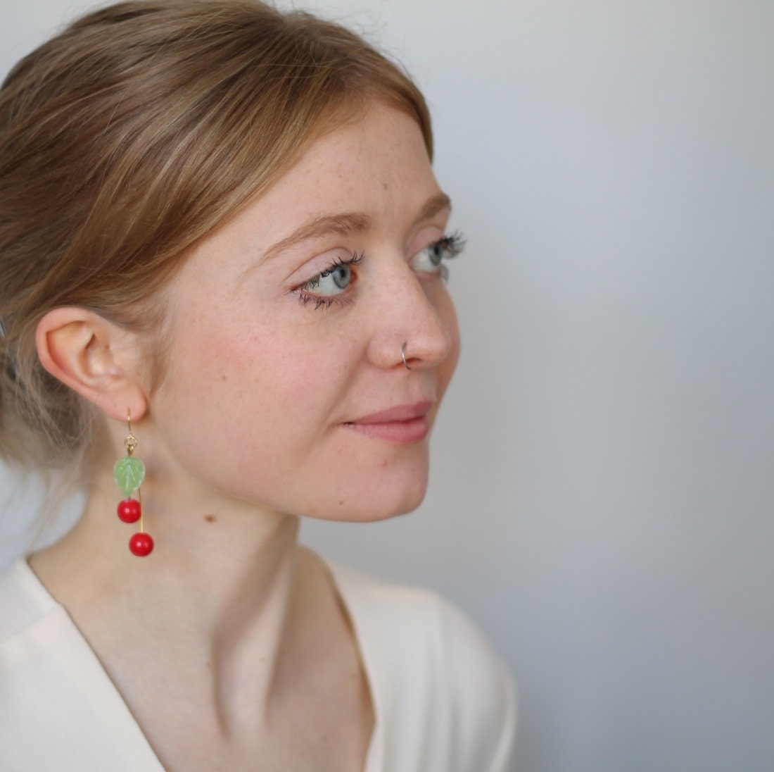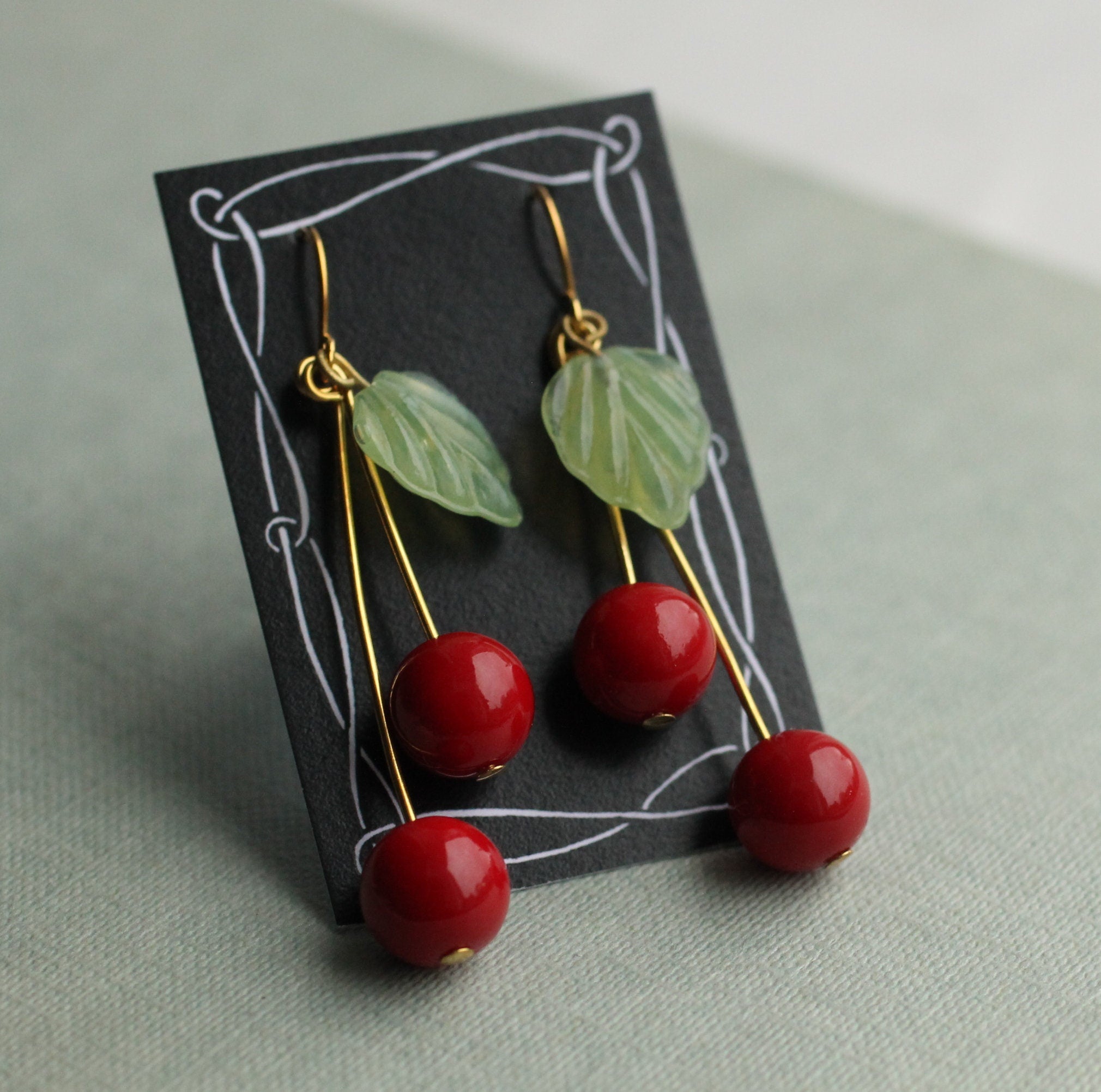 These cherry earrings are made from glass beads. The cherries are a bright opaque red colour, which looks great with the delicate opal green of the leaves. The cherry earrings are made of glass and solid brass wire, and measure exactly two inches (5cm) in length.