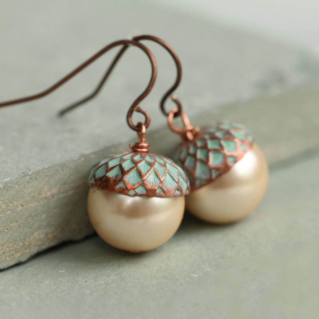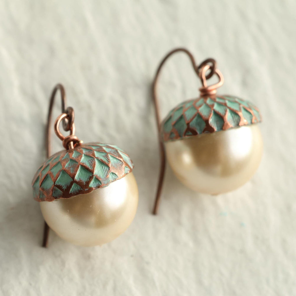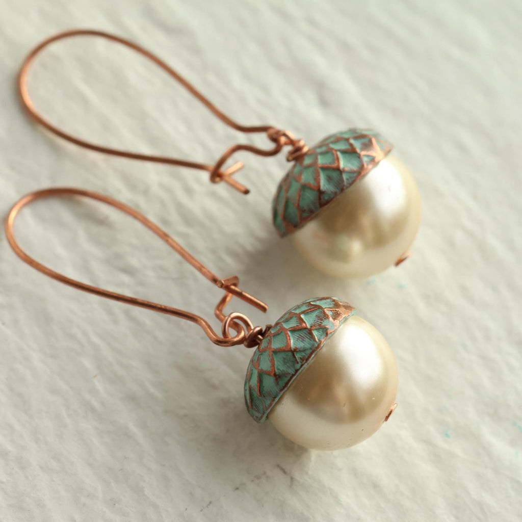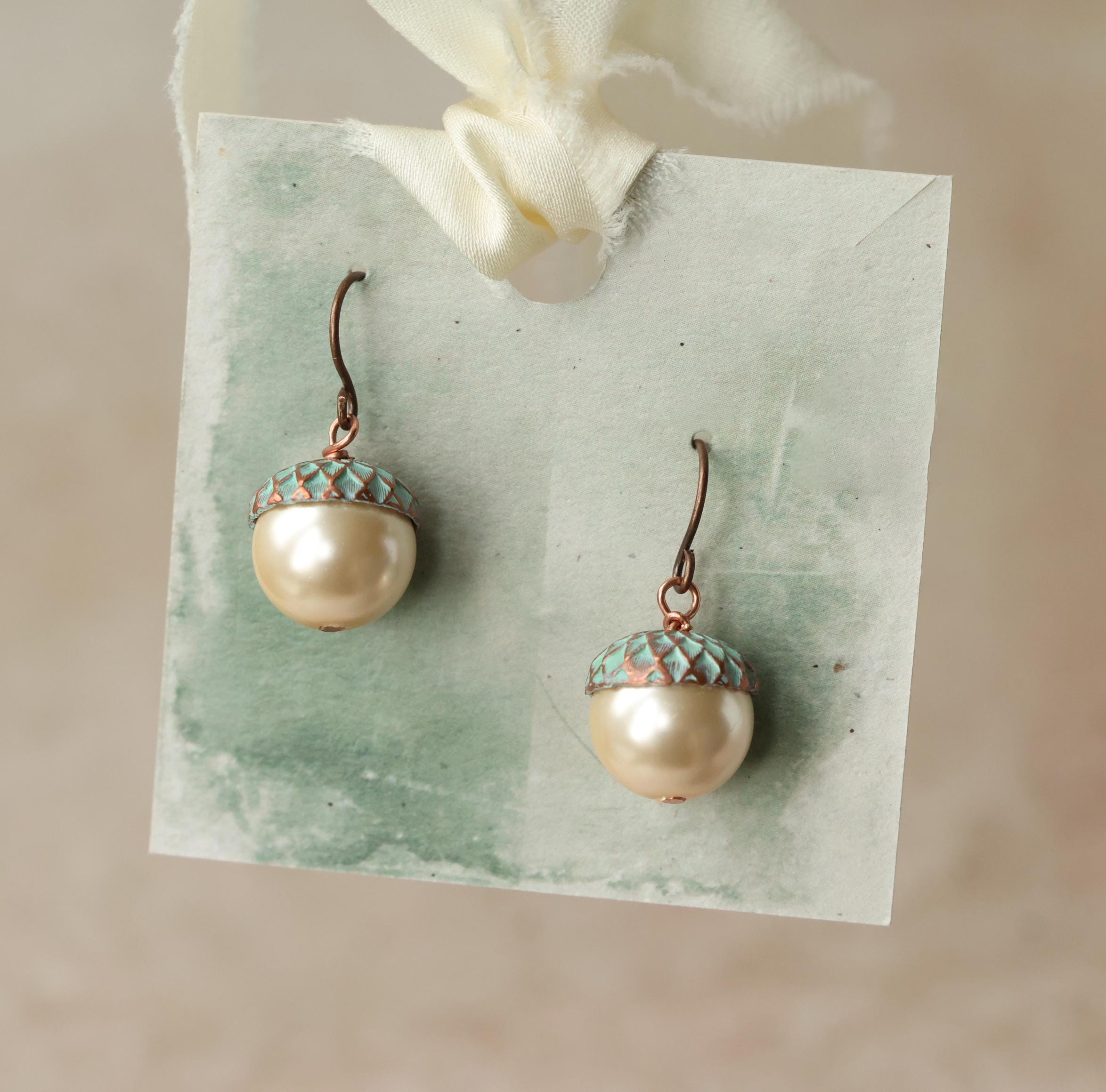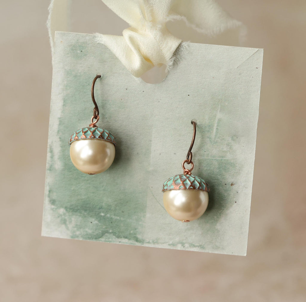 These beautiful pearl acorn earrings are made from a vintage pearl, paired with an antique copper and turquoise bead cap. The tones of the tarnished red copper with the milky turquoise and ivory tones look perfect together.