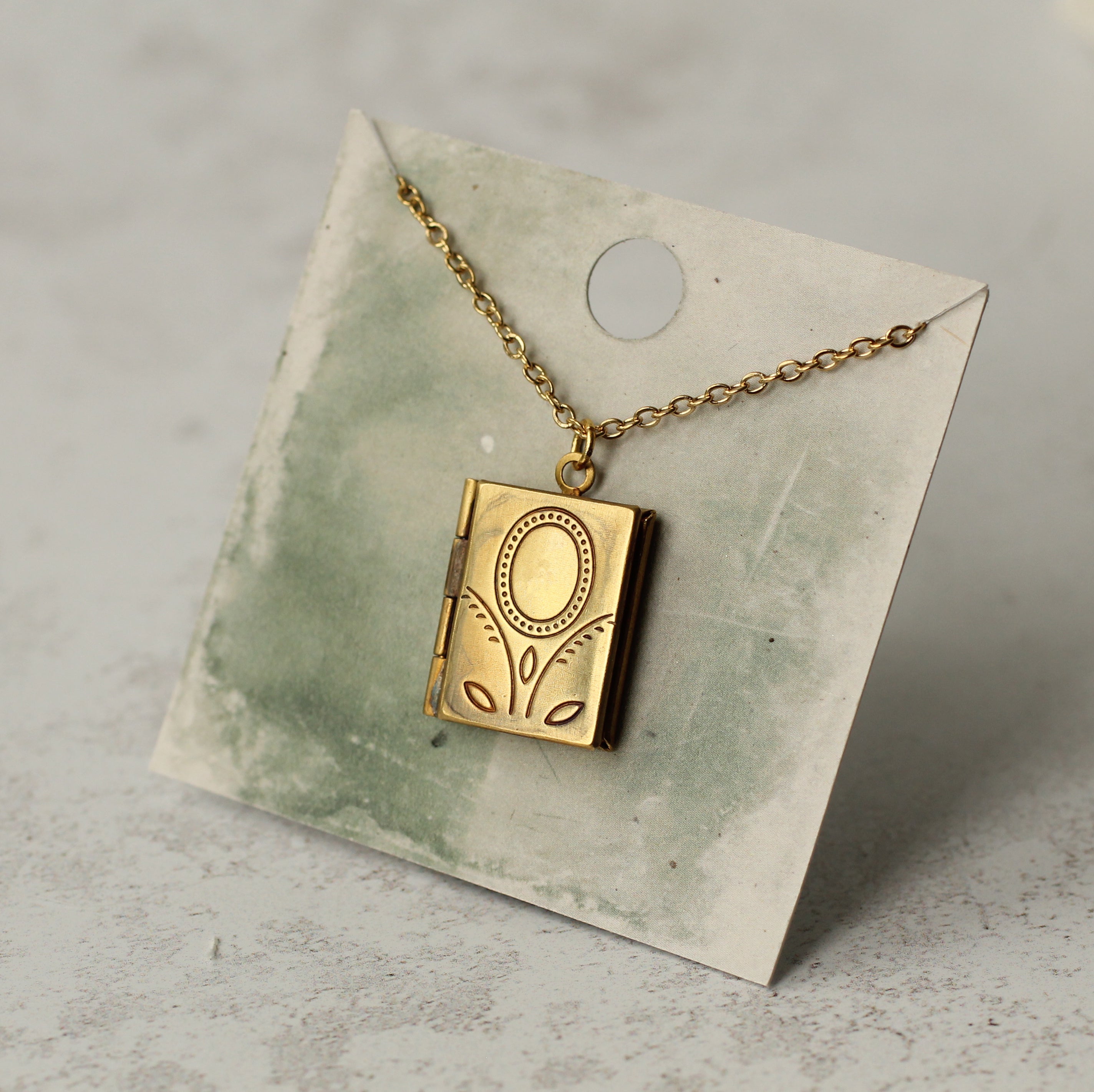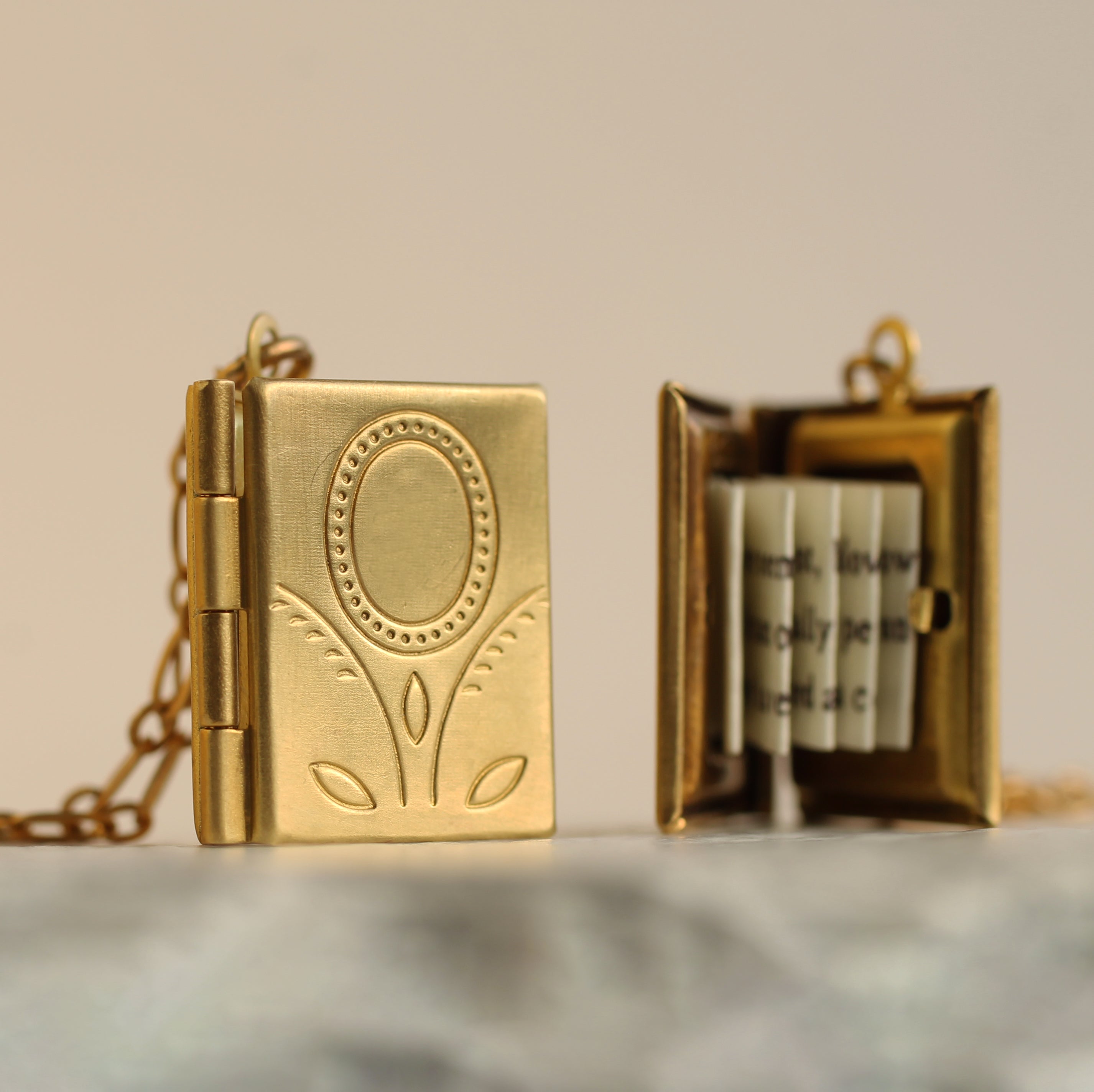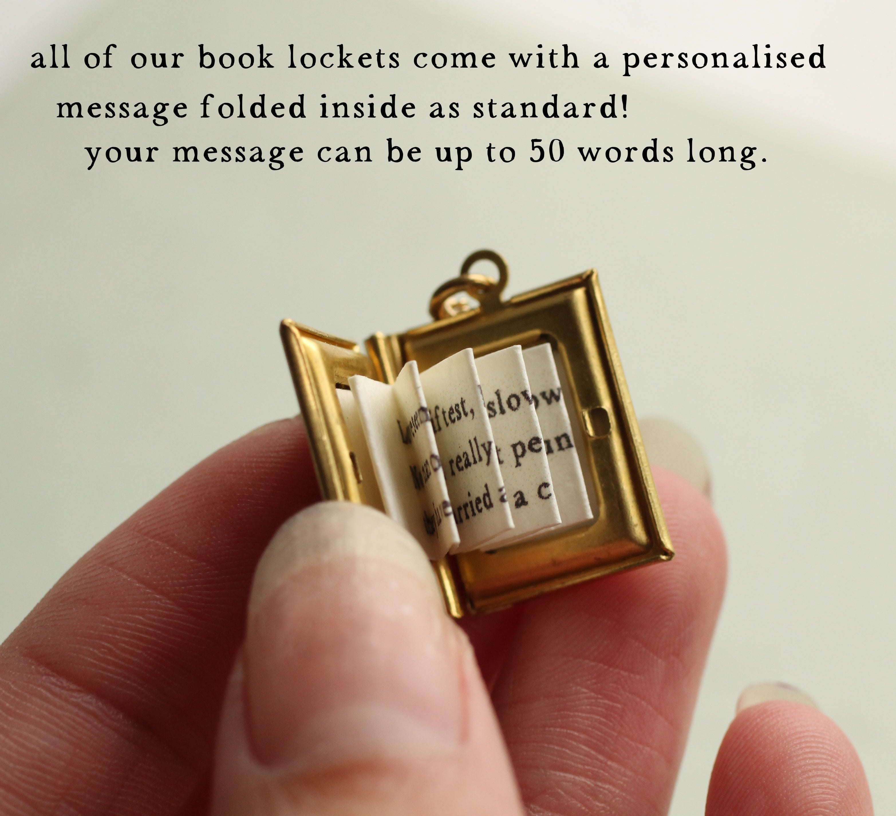 This exquisitely detailed little personalized locket necklace is a miniature book made from solid golden brass. Inside is a secret hidden message, specially folded and fitted inside the locket to look just like the pages of a real book!