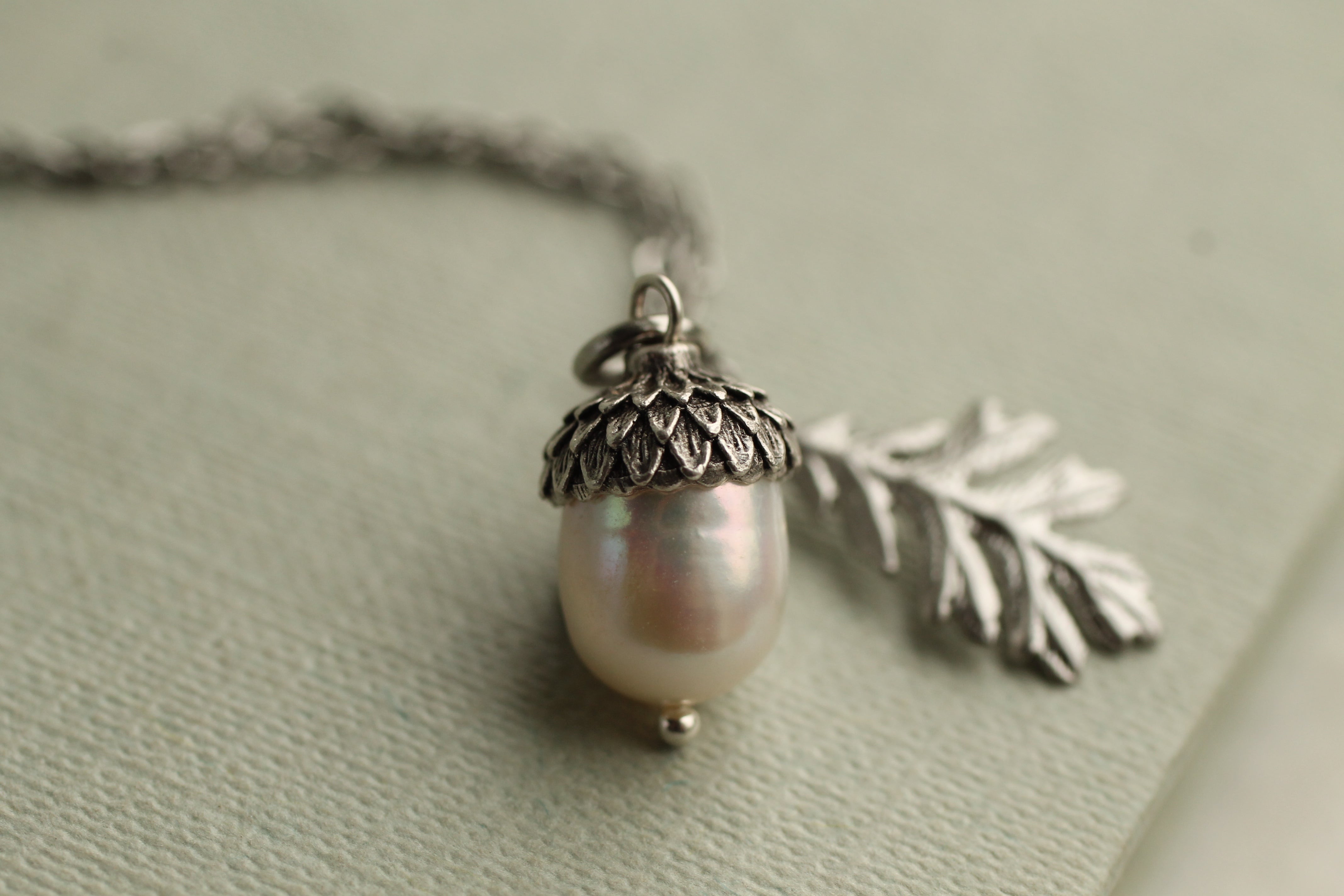 This acorn necklace is made from a single freshwater pearl with a beautiful, irridescent lustre with tones of pink and silvery white. It looks very beautiful when it catches the light. We have added an antique silver acorn cap and a fine silver plated chain. We love the combination of delicate pearl with the antique tones of the silver metal.