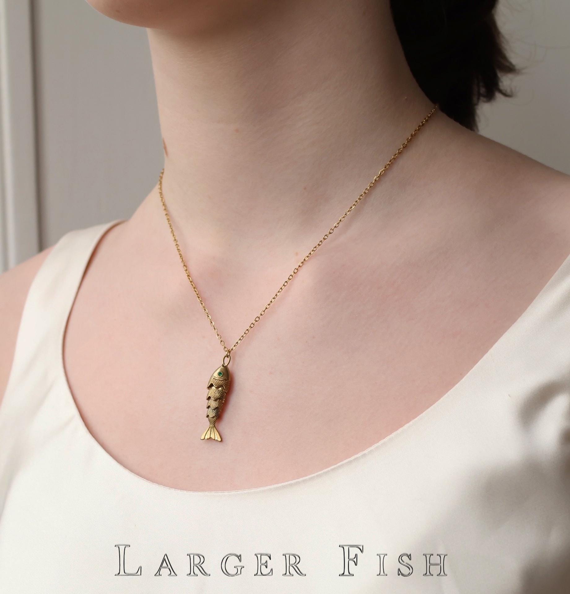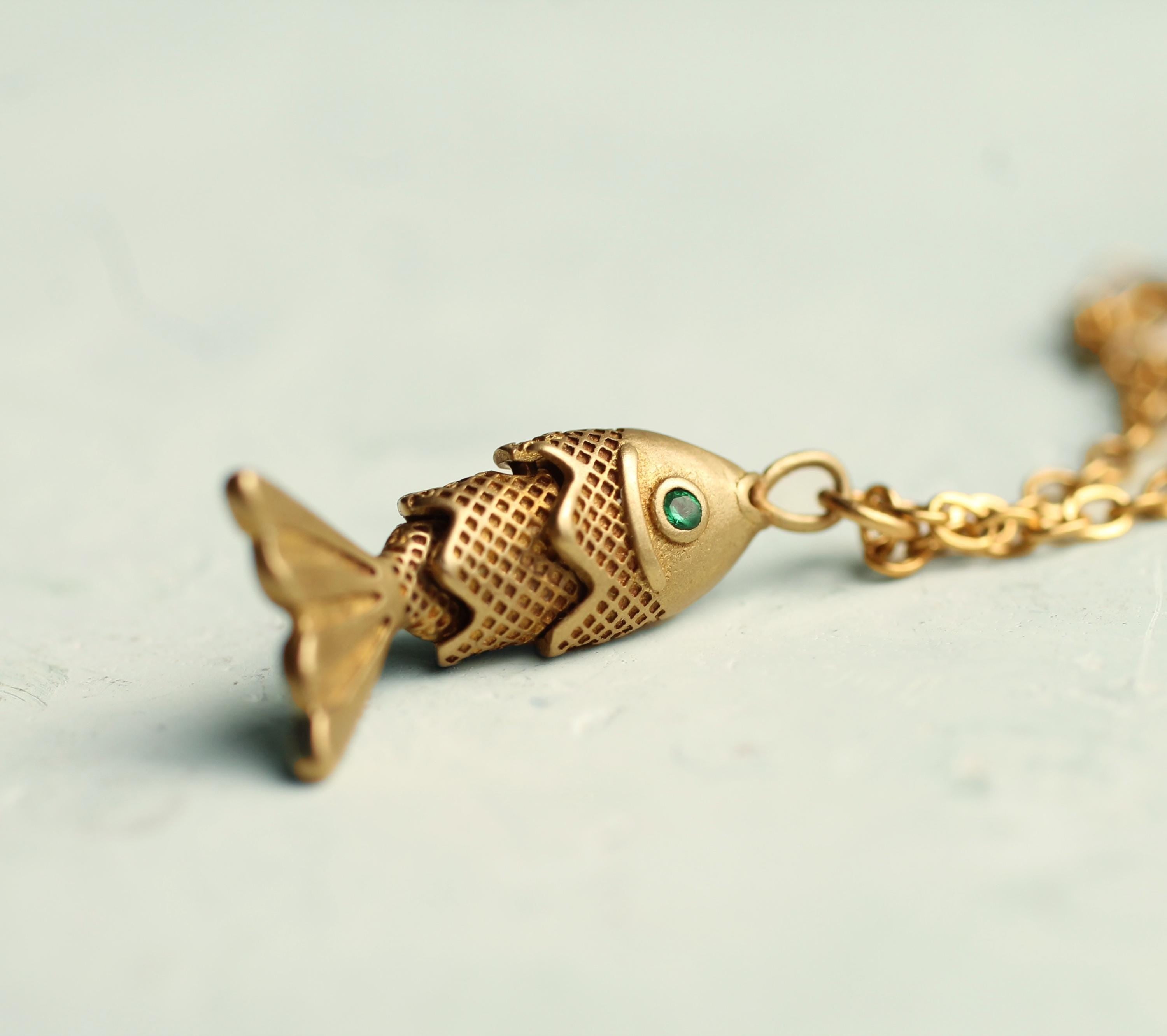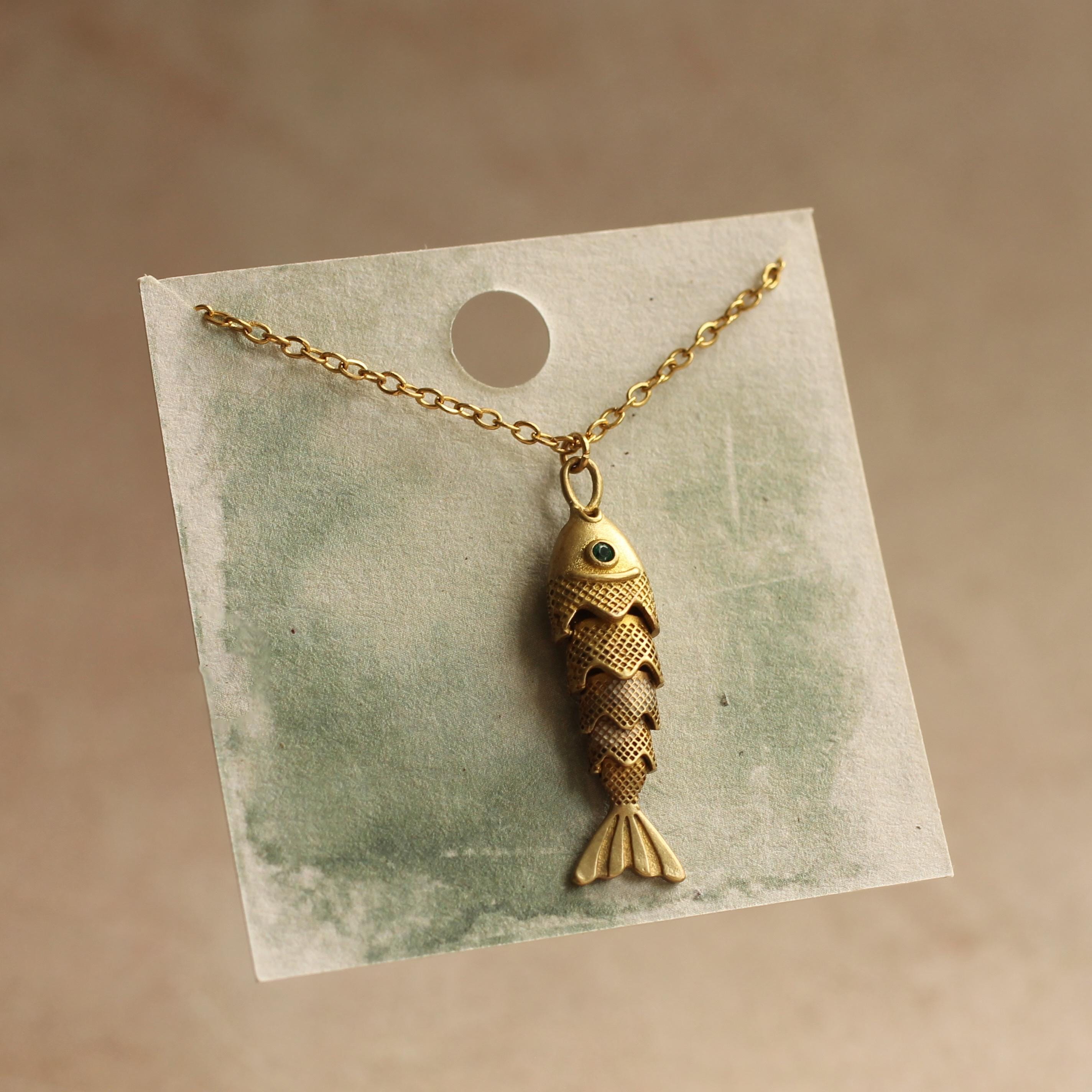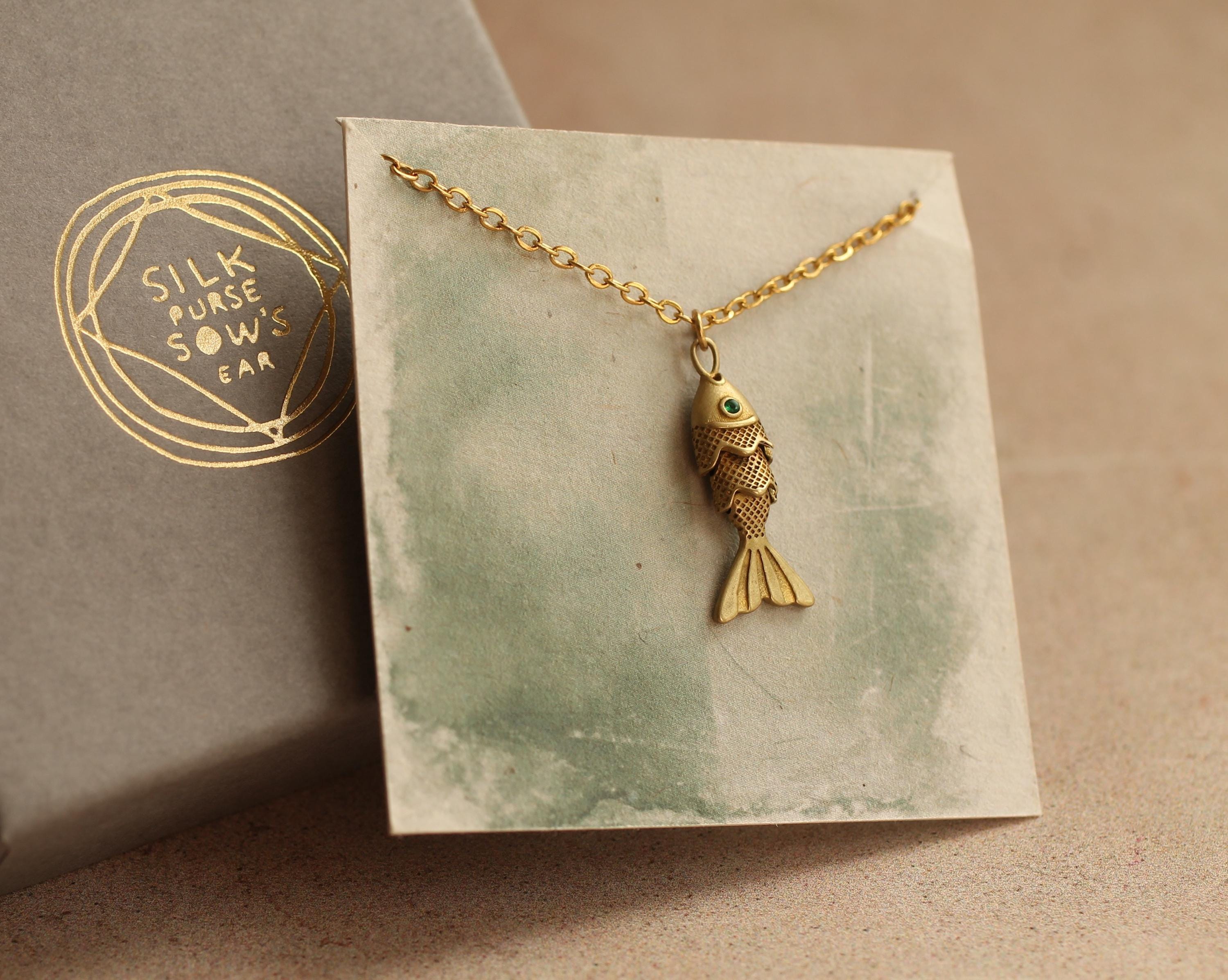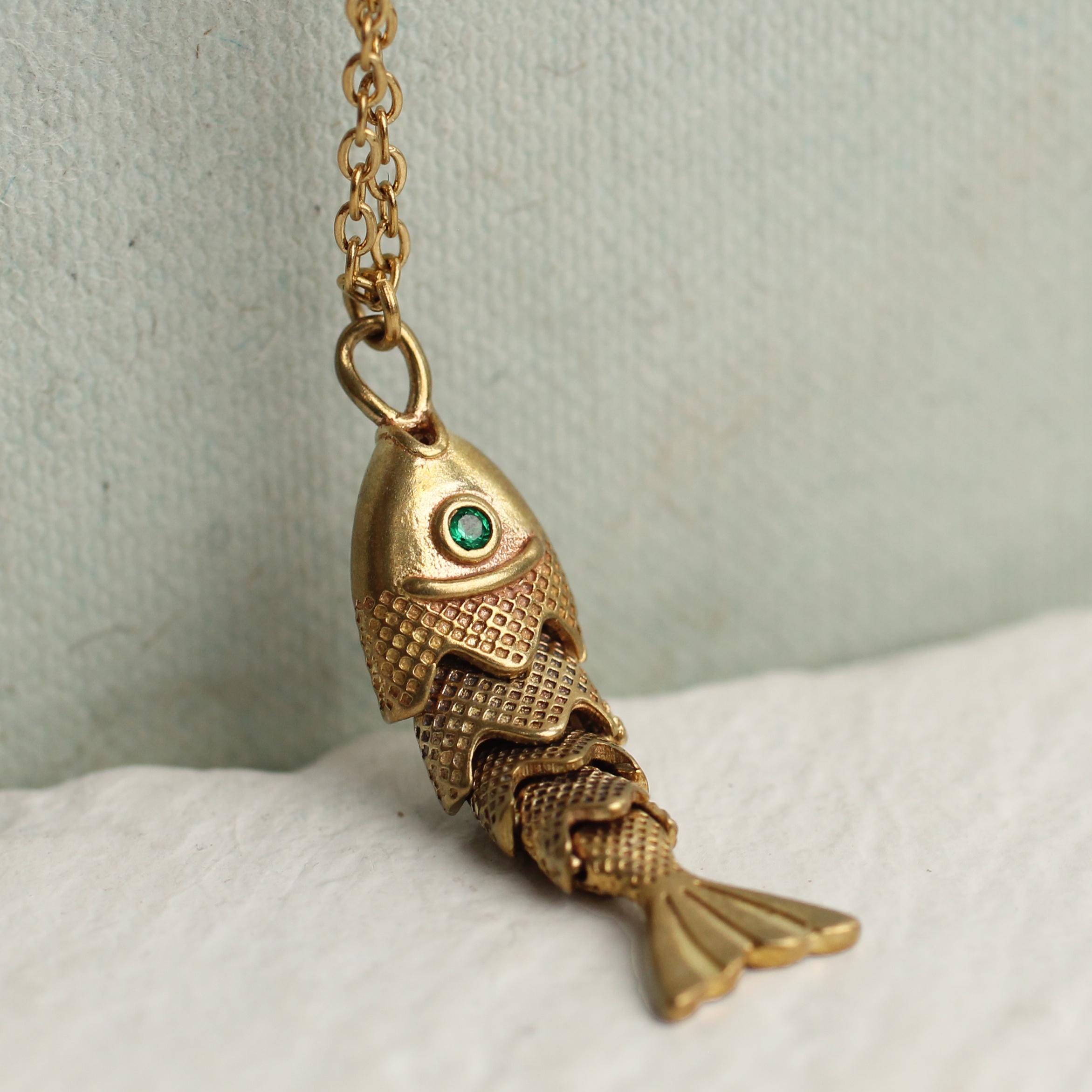 This sweet moving fish charm necklace is made from solid brass with a deep, antique gold colour. The fish are beautifully made and detailed, with a jade green crystal eye that catches the light.