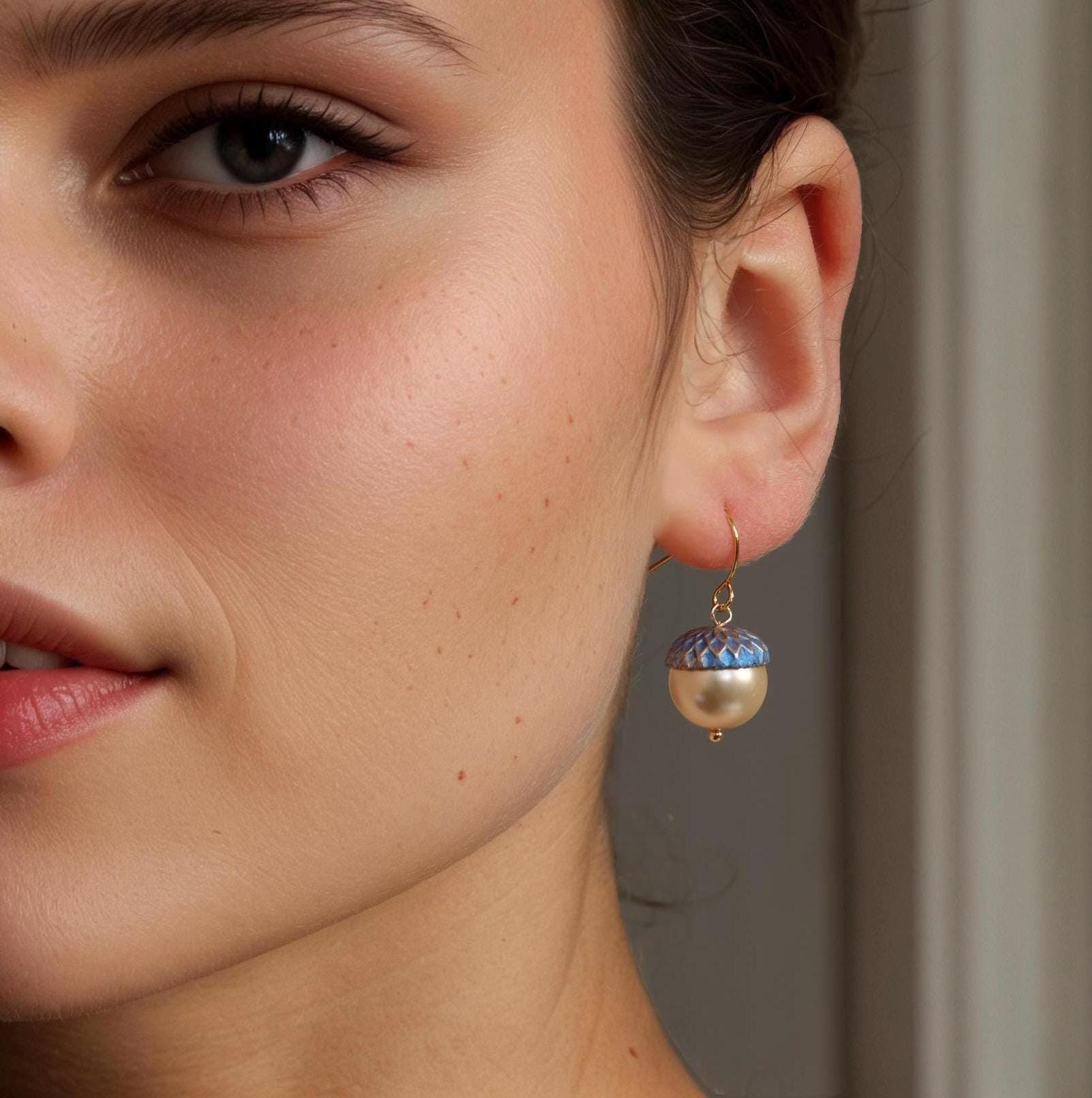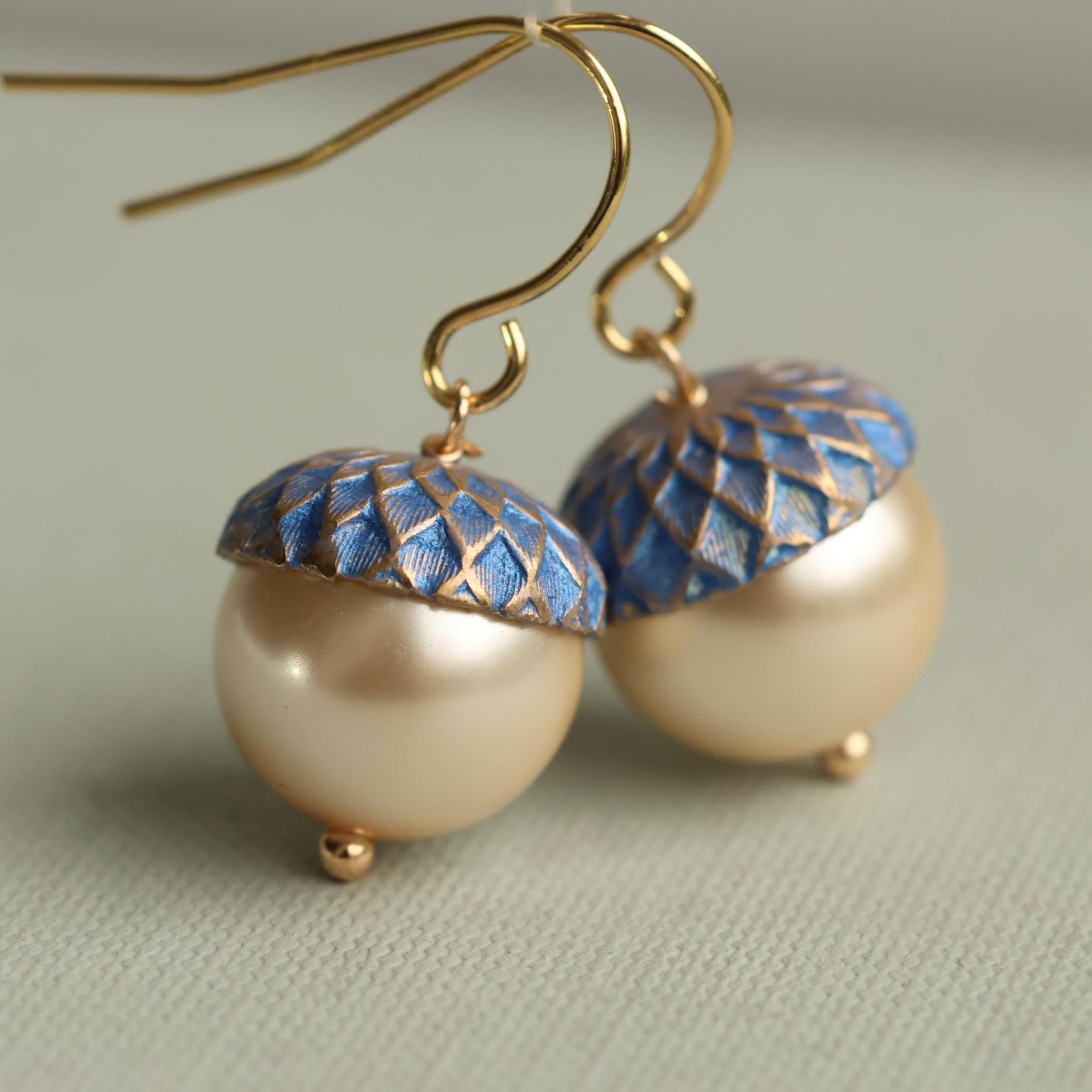 ["acorn earrings","autumn earrings","best friend gift","blue acorn","gift for sister","GW","jewelry for fall","october birthday","pearl acorn","pearl earrings","retail-only","royal blue earrings","rustic jewelry","statement earrings","woodland gift"]