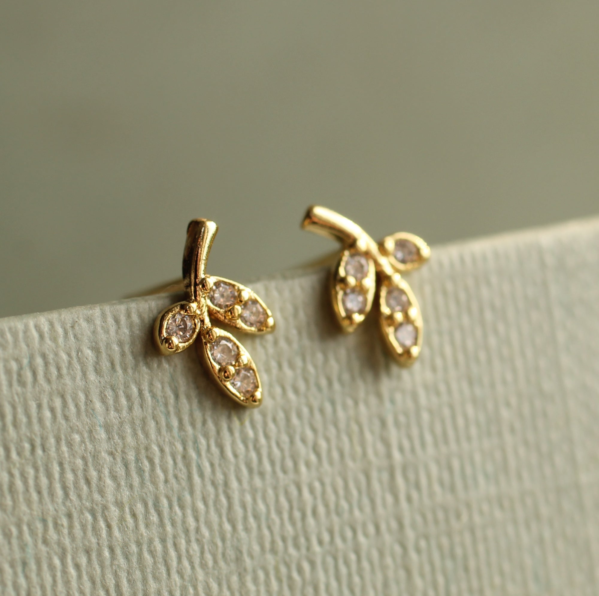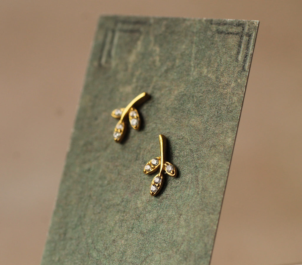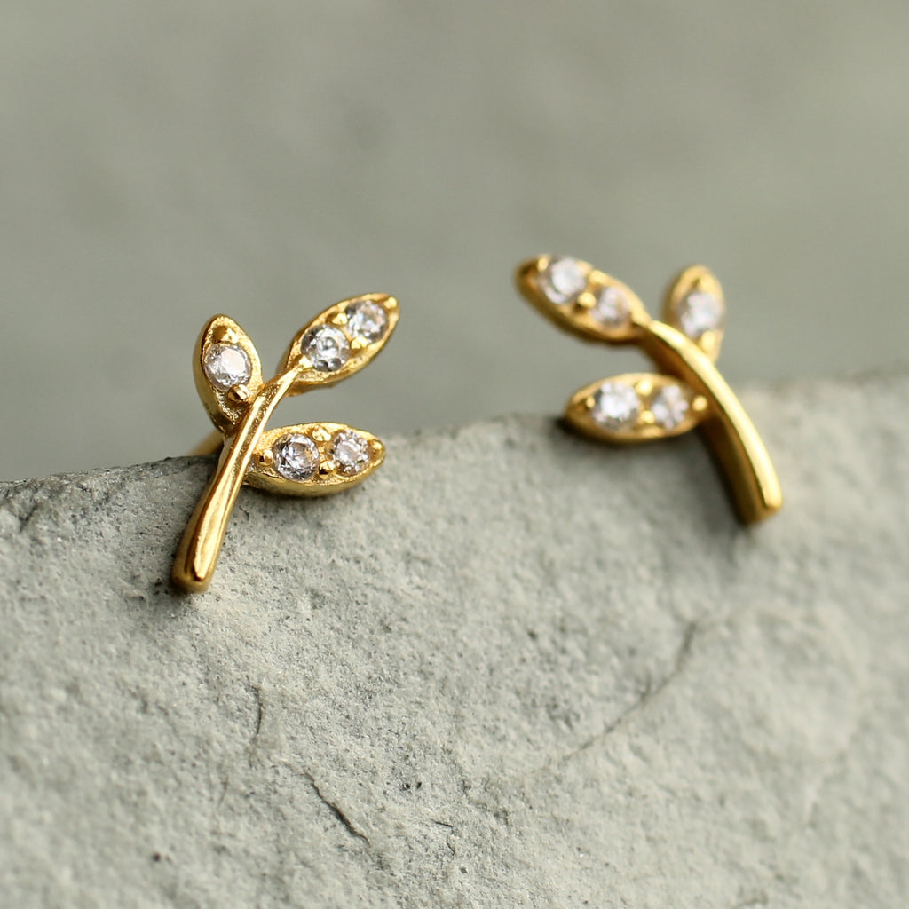 These sweet, delicate little stud earrings feature a small sprig of leaves with tiny crystal stones set into the gold. The earrings are made from gold plated Sterling Silver.