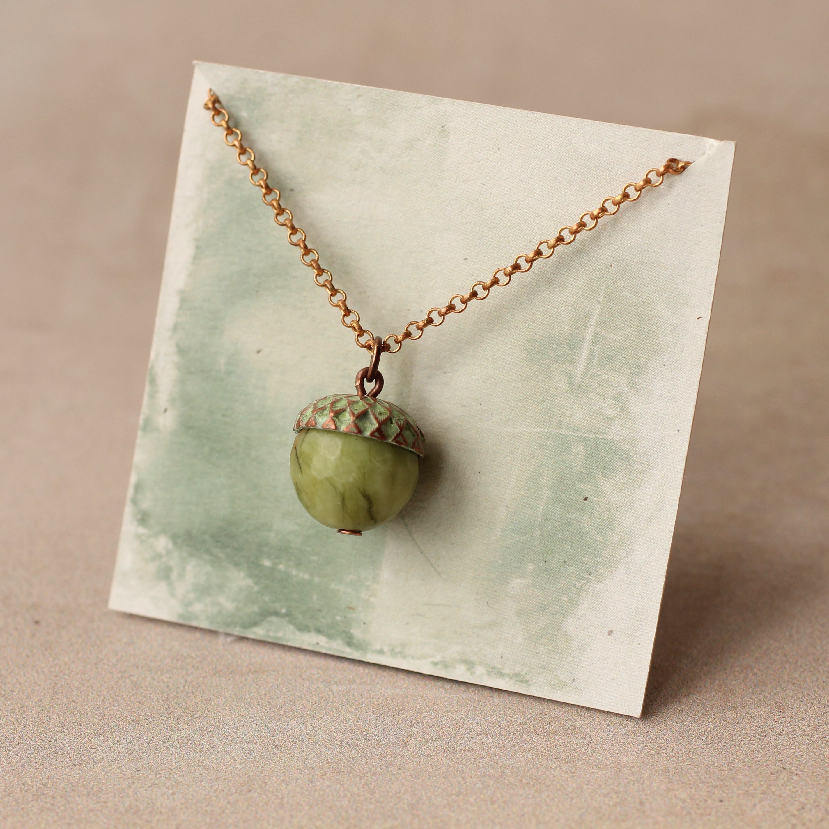 The tones of the tarnished red copper with the warm olive green of the gemstone look great together. We have added co-ordinating ear wires in antique copper which match the darkened red of the acorn perfectly.