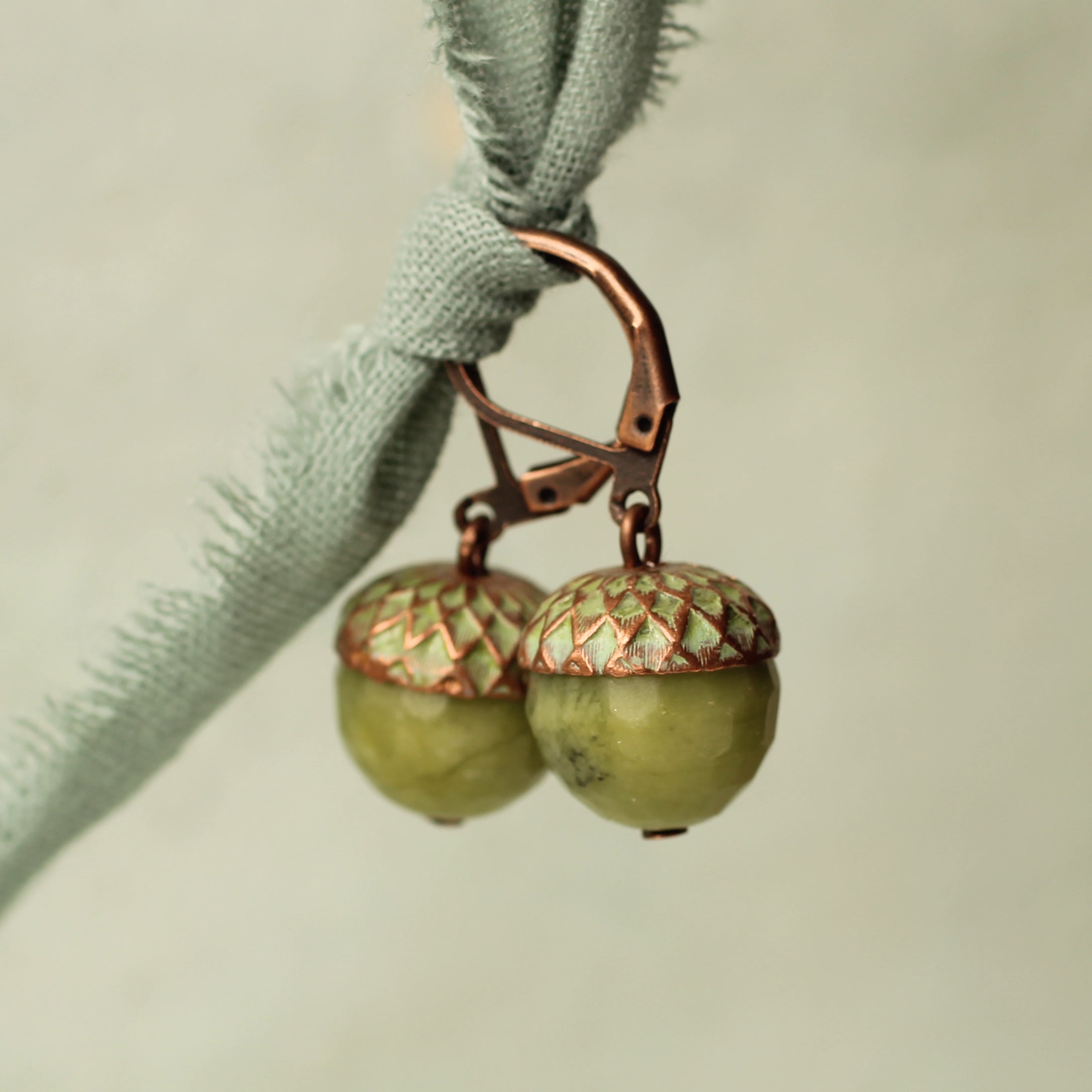 These beautiful acorn earrings are made from turquoise glass with an antique copper acorn cap. The tones of the tarnished red copper with the milky opaque turquoise shade of the glass look great together. We have added some co-ordinating copper ear wires.
