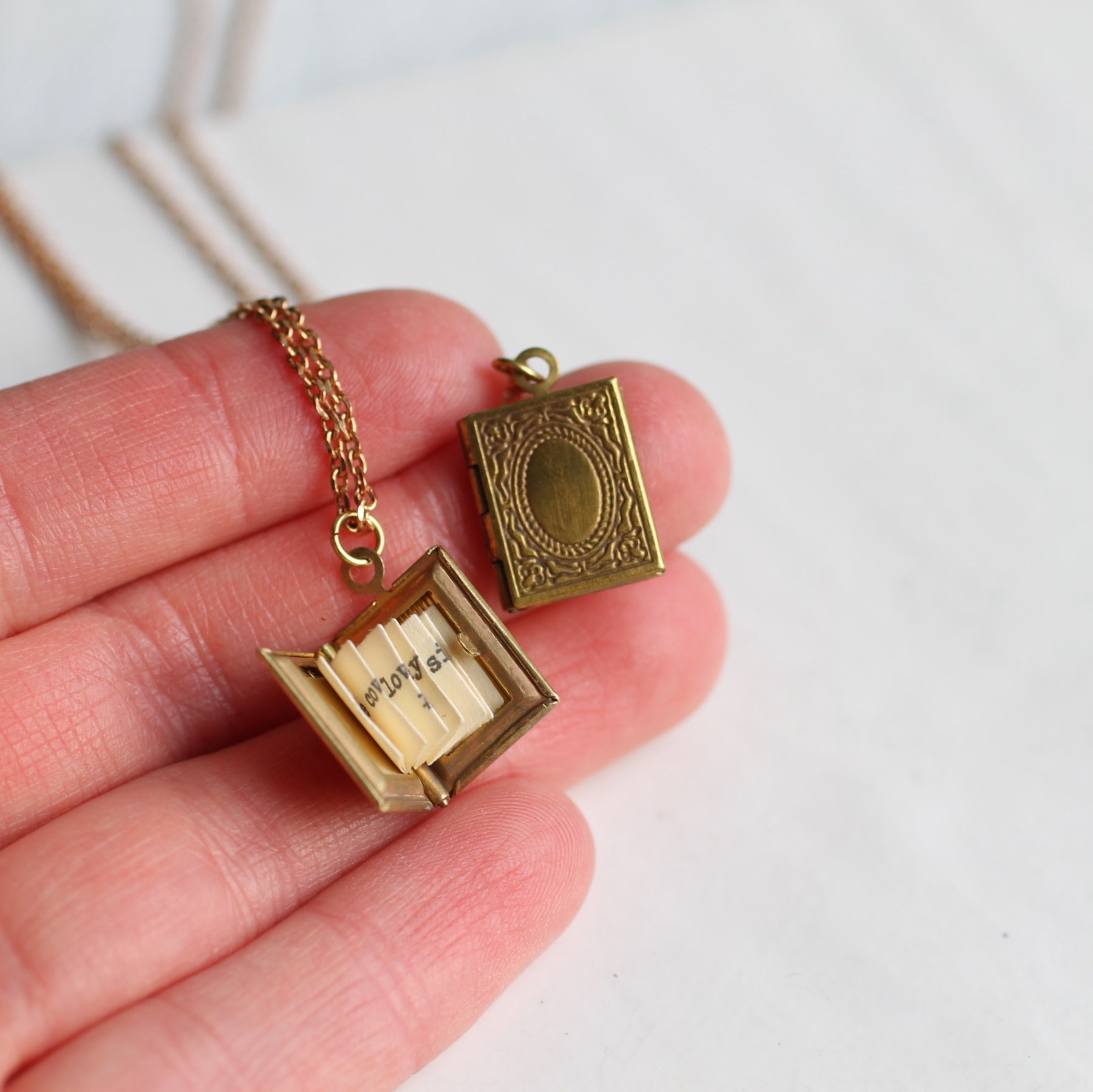 This exquisitely detailed little personalized locket necklace is a miniature book made from solid golden brass. Inside is a secret hidden message, specially folded and fitted inside the locket to look just like the pages of a real book!