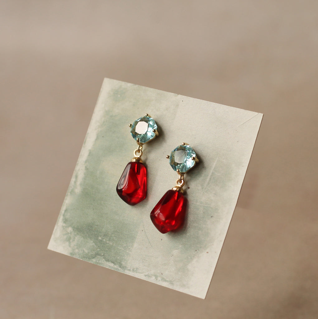 These earrings have a stud post fastening with butterfly backs. The seafoam jewels are made from glass and the pomegranate seed is made from resin. They measure 30cm (just over one inch) in length and are light and comfortable to wear.