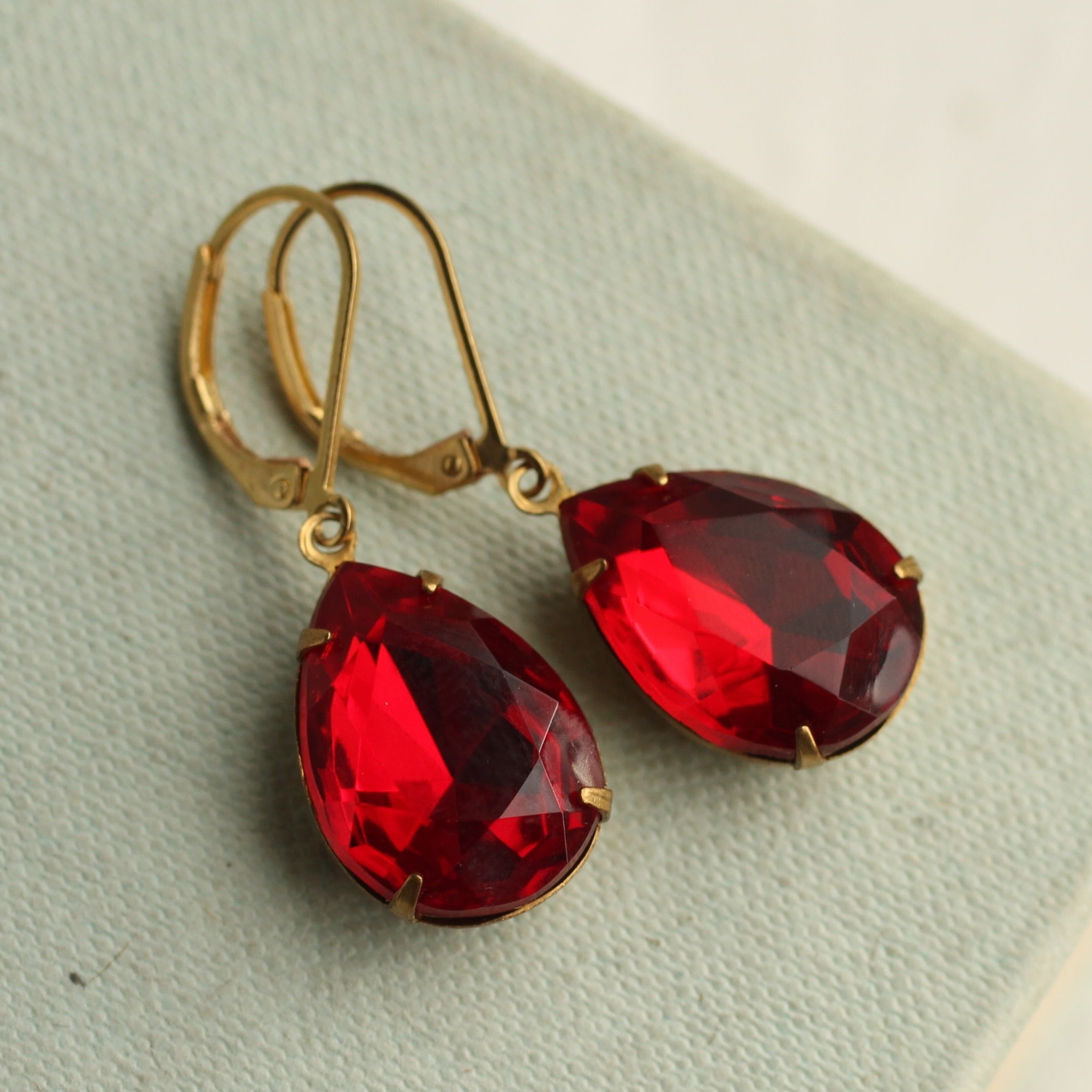 These beautiful vintage glass gems are a deep ruby red shade and are set in golden brass settings, which co-ordinate perfectly. They are a classic teardrop shape and I have added a pair of matching gold plated ear wires with a lever fastening.