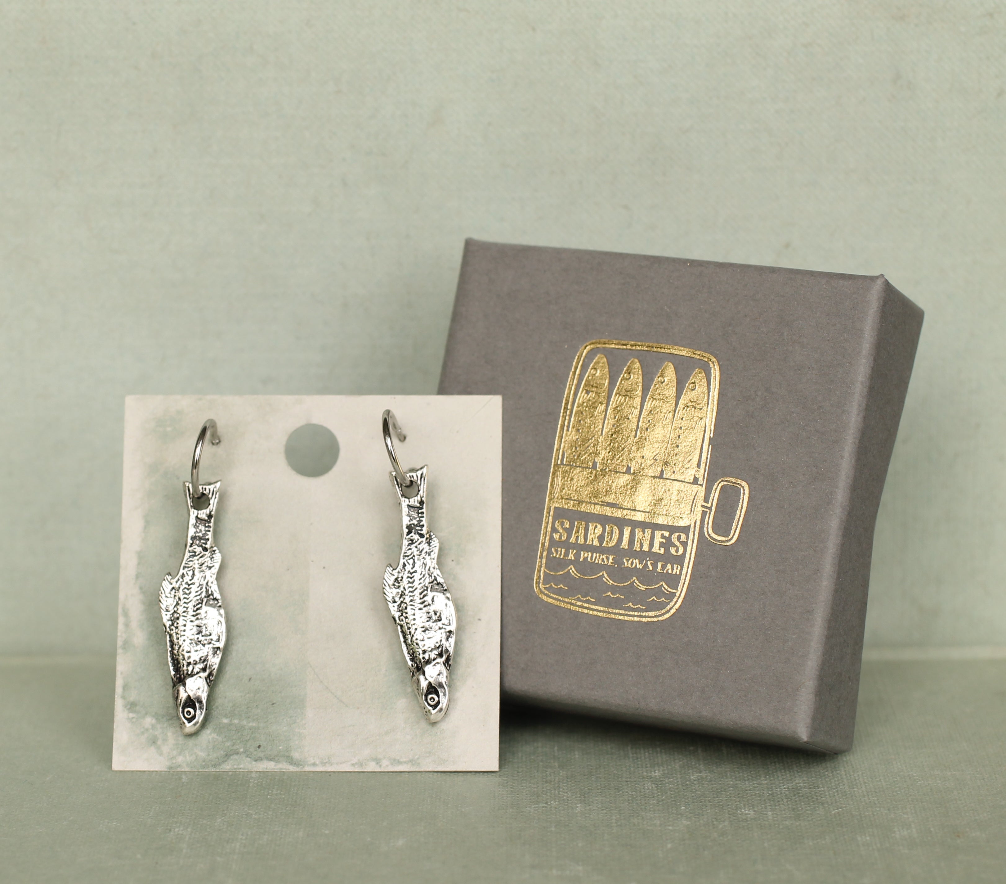 These beautifully detailed and novel earrings feature a stylised silver sardine, hung from a simple silver plated earwire. Measuring 35mm (just less than 1.5 inches) in length, the fish charm is designed to hang just below the earlobe. These charms are great quality, but are light and comfortable to wear.