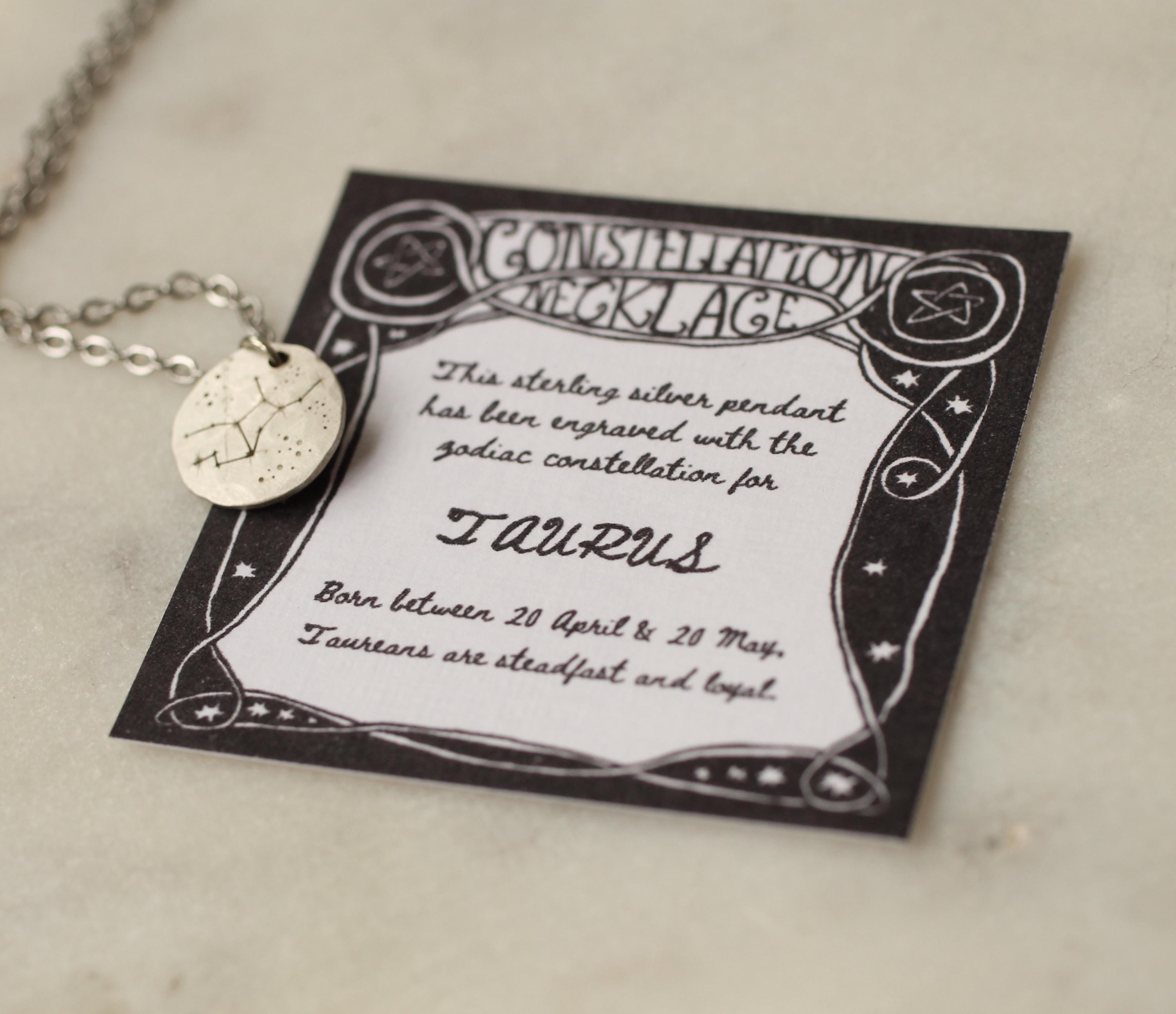 Included with the necklace is a hand designed gift certificate, which explains the zodiac constellation and includes a little information about the qualities associated with your starsign.