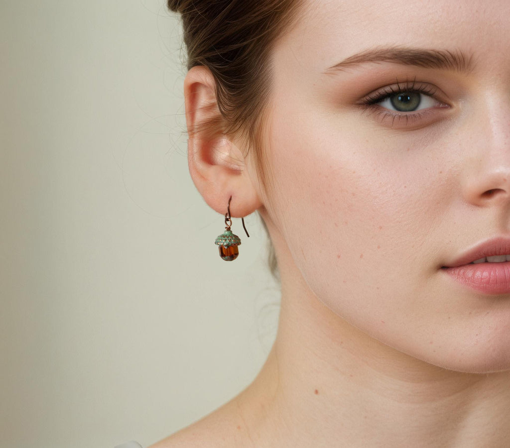 These rustic acorn earrings are made from vintage glass stones, in a deep, burnt amber or orange shade. The glass has tiny touches of iridescent enamel here and there, which adds to their beauty and uniqueness. We have combined the amber glass with an antique copper acorn cap, that we have hand enamelled in a cool toned, sage green colour. Touches of copper metal are left exposed for a rustic, charming look.