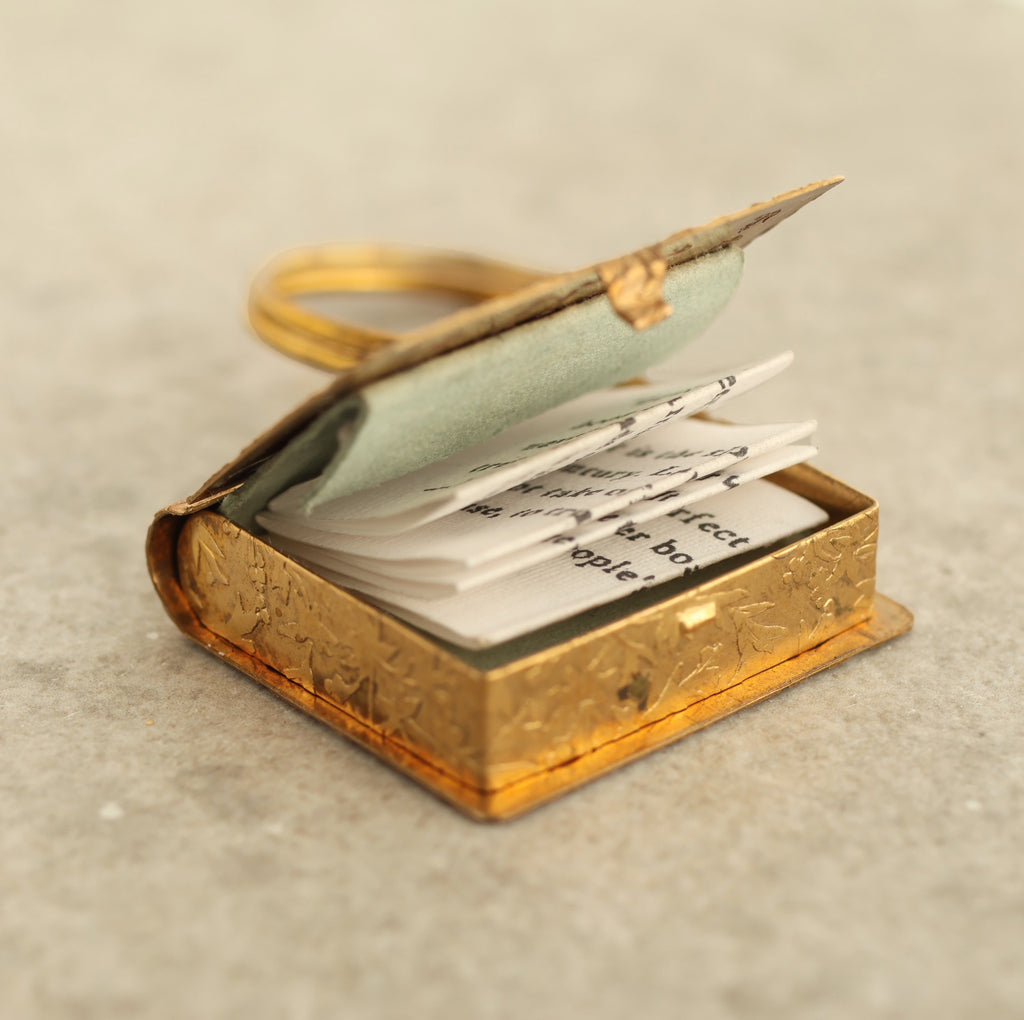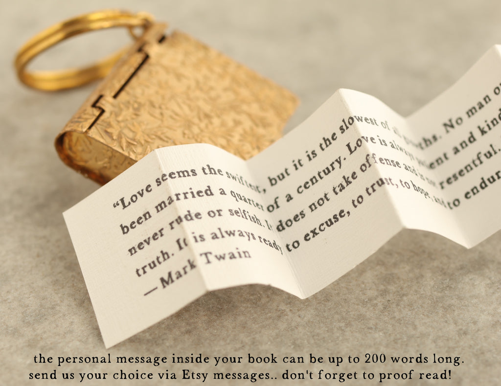 This custom personalized book keyring contains a handmade miniature book, with the message of your choice inside! Inside the book keyring is a hidden message of your choice, specially folded and fitted inside the locket to look just like the pages of a real book.