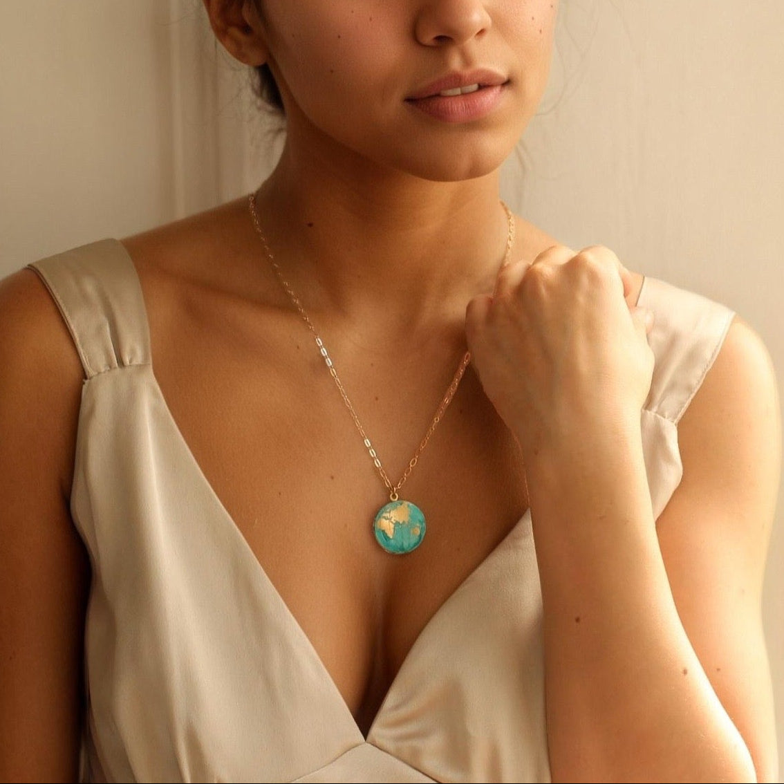 This world map globe locket is made from solid brass, which has been carefully hand enamelled to turn the ocean into a beautiful, hand painted turquoise blue shade, with the continents a rich gold colour. The delicate turquoise enamel varies subtly in shade and looks amazing with the golden brass of the land! This globe necklace would make a perfect travel inspired gift. This is a single sided locket featuring the Eastern Hemisphere. You can find a separate listing for the Western Hemisphere in our shop. The locket necklace measures 26mm (just over an inch) in diameter. We can personalise this locket for you, using a carefully designed technique to transfer your photographs onto the metal of the pendant itself, for a really soft and unique vintage effect. Parts of your image will merge with the golden brass behind, creating a very beautiful, unusual and ethereal look. We can also professionally engrave the back of this locket with a short message or inscription of your choice, in a beautiful vintage script. This locket can hold a maximum of around ten words. Each locket comes with a 22" chain as standard, if you would like a different length please just get in touch.
